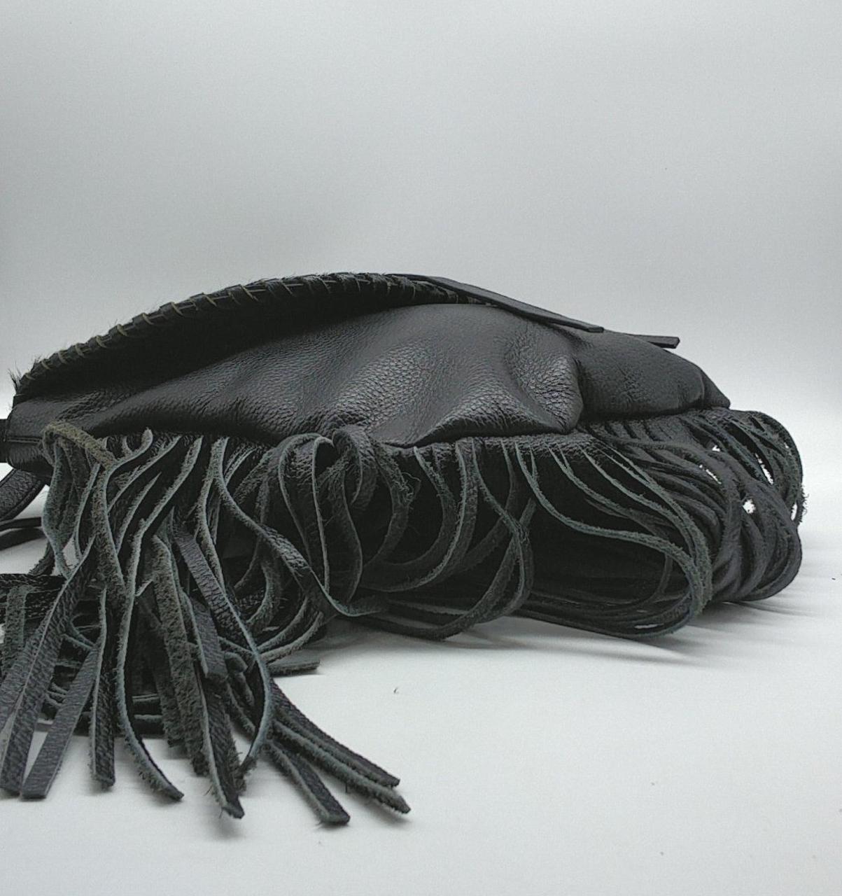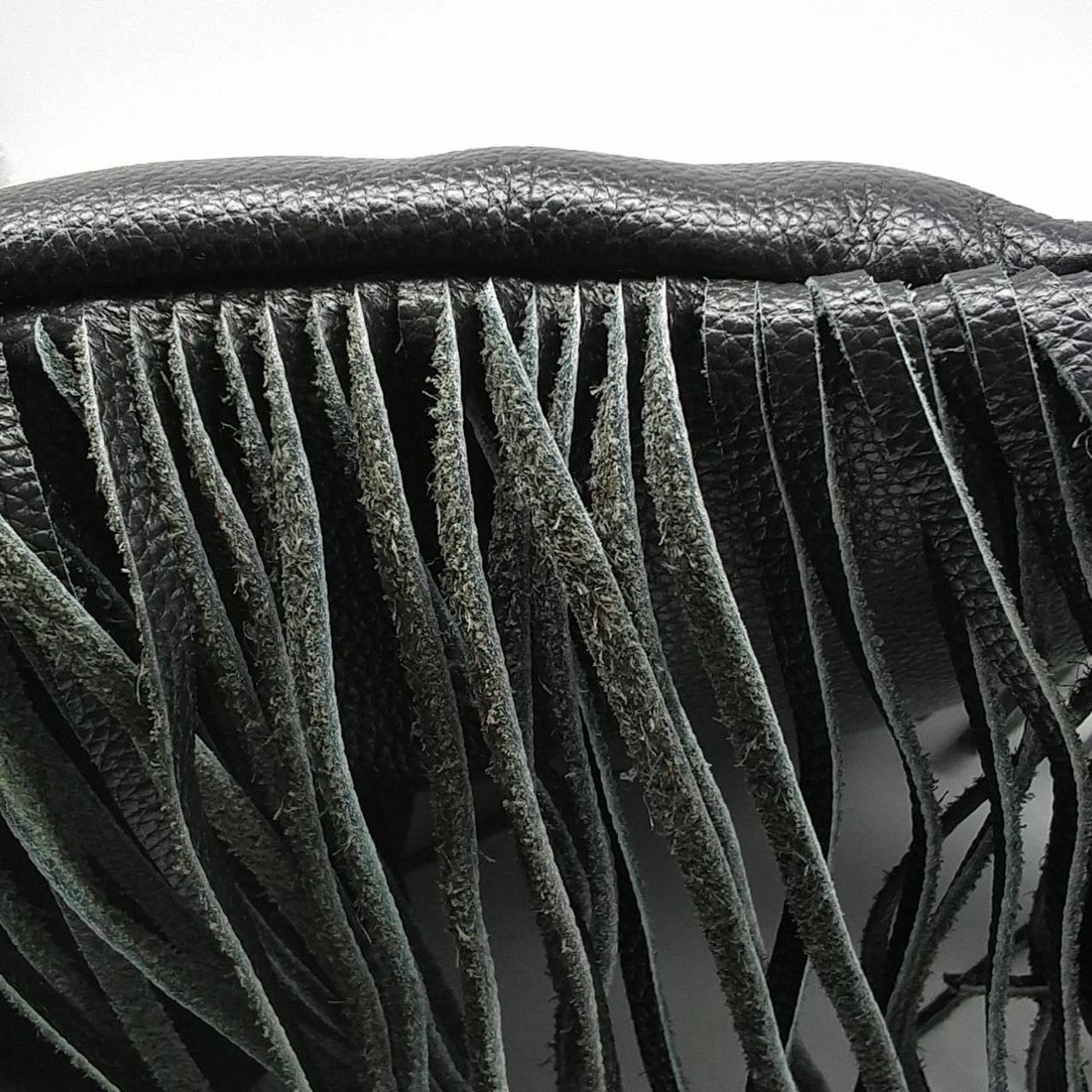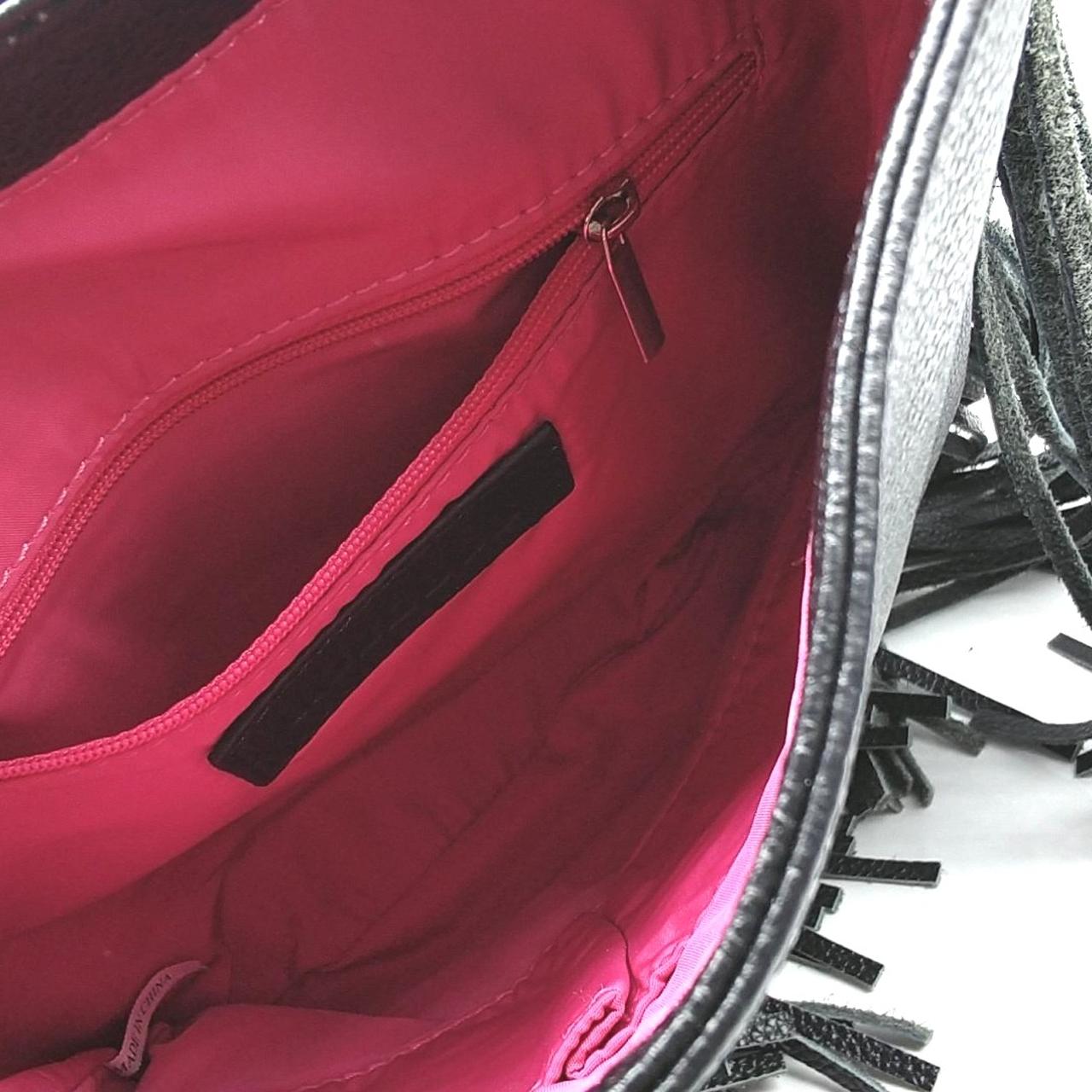 ローズバッドのレザーショルダーバックです。フリンジが目を引く個性的なデザインです。内側はピンク色です。 |