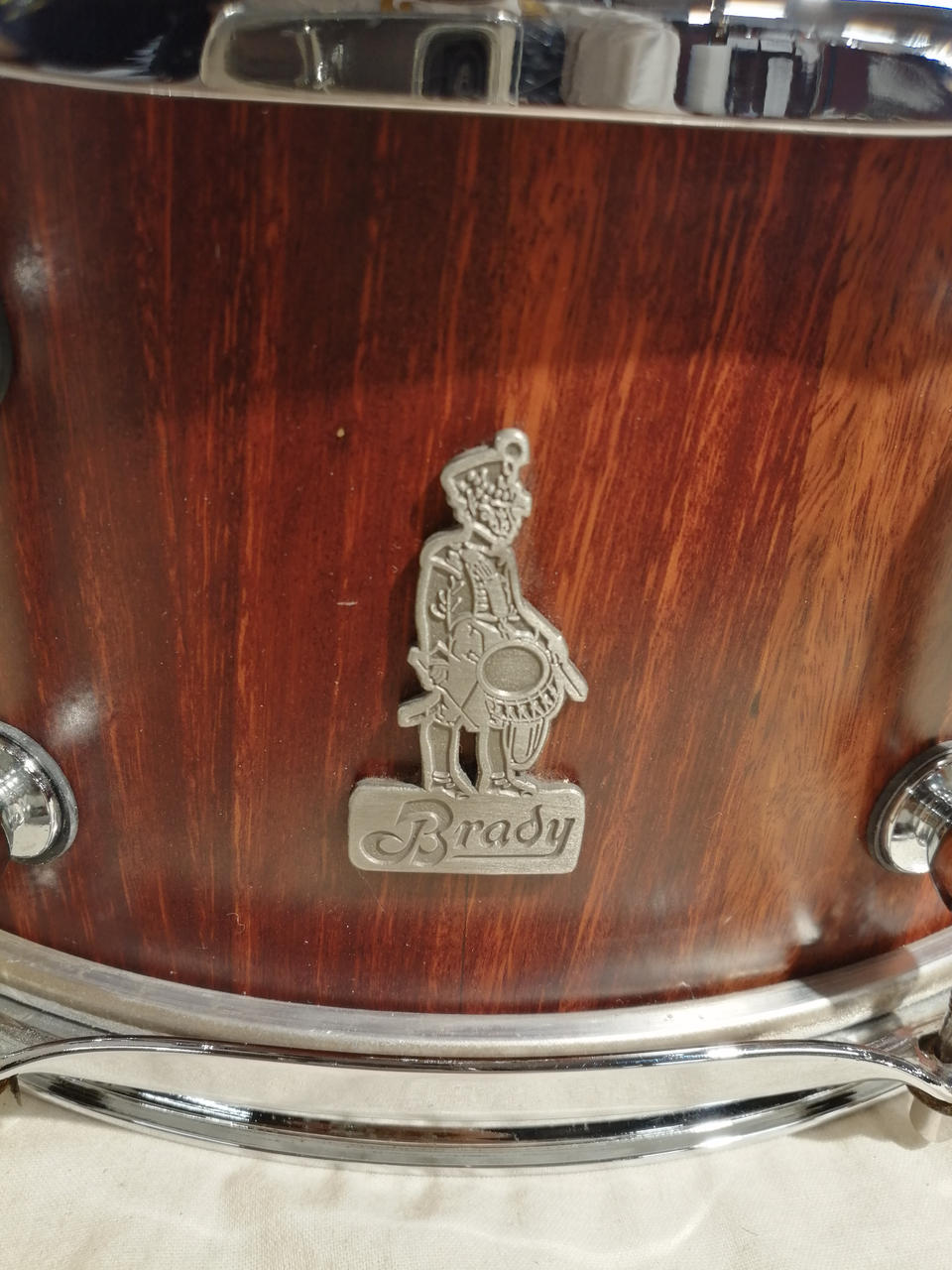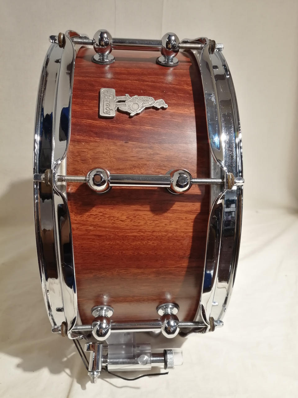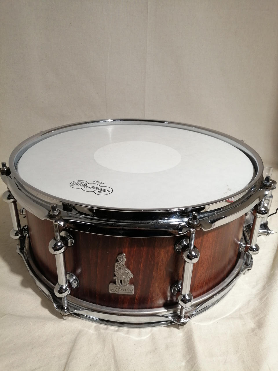 今は事業をたたんでしまい、入手困難になってしまったChris Brady氏のブランド・メーカー、Bradyのスネア。スティーブジョーダン、ジェフポーカロが使用したことでも有名なメーカーです。ブロックシェル仕様でプライシェルよりも素早いディケイで太い音像、安定感のある力強いサウンドが特徴です。 |