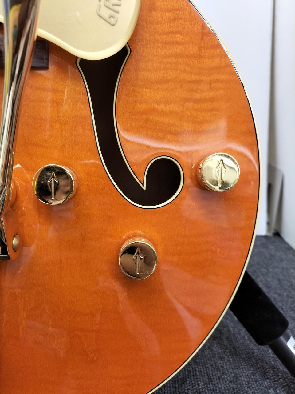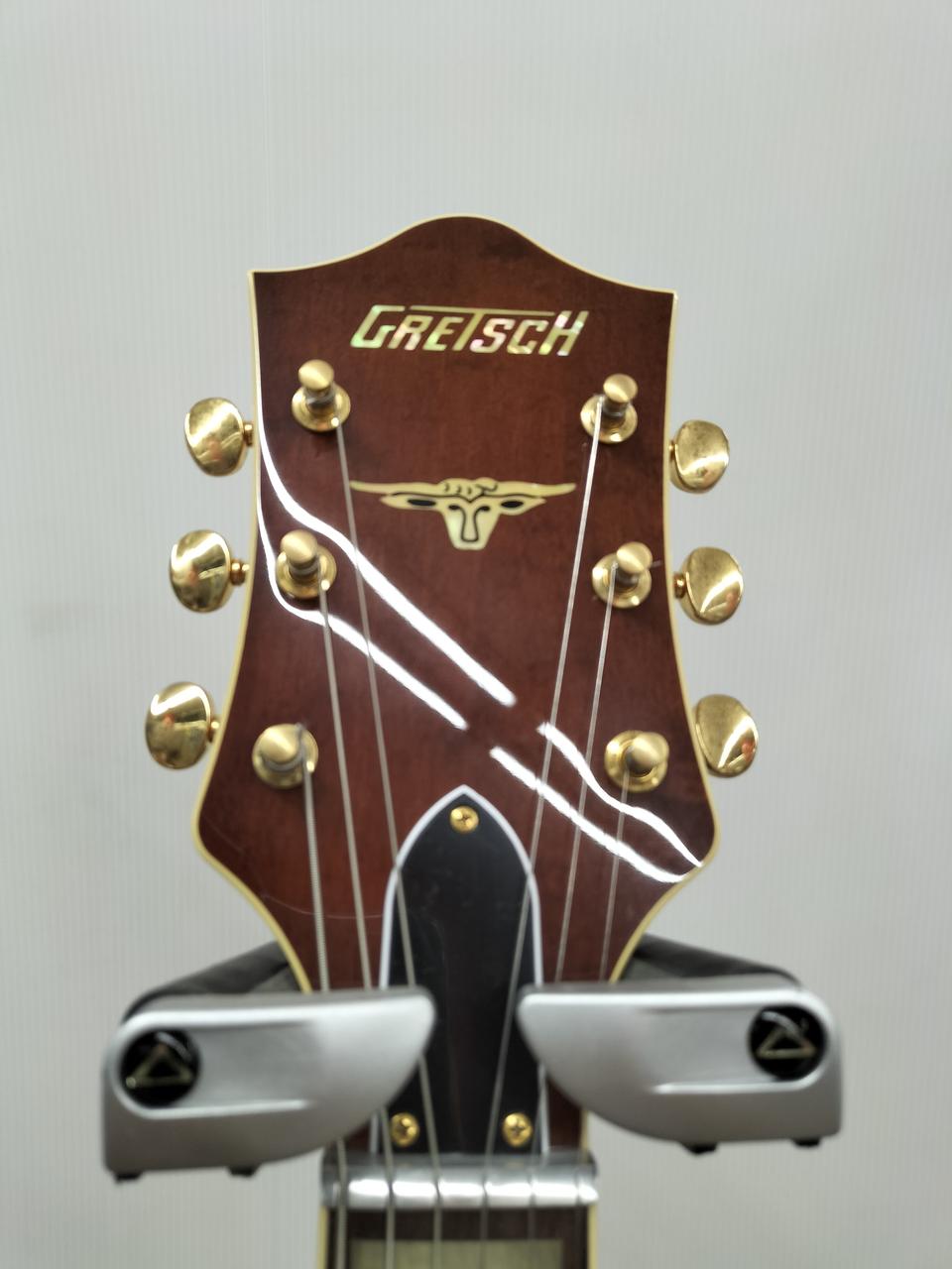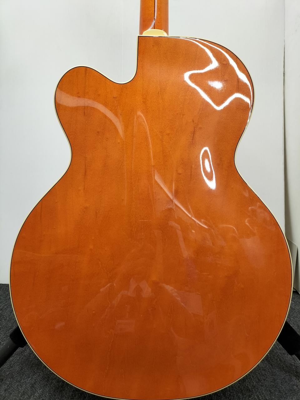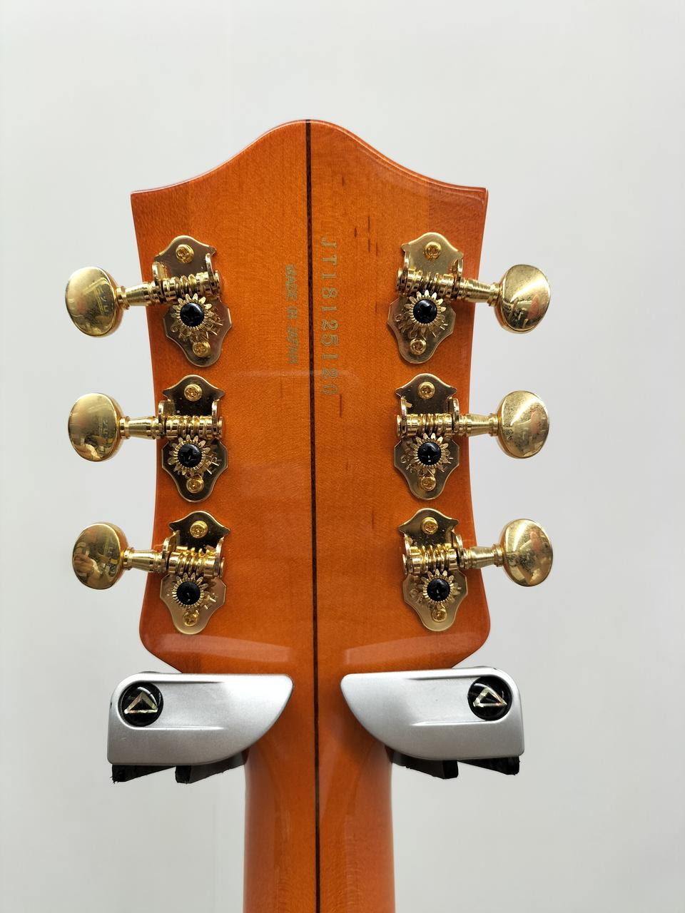 パラレル・トーンバーを用いた16インチ幅のメイプル・ボディのトップには大きなGマークを配し、24.6”(625mm)のスケールを採用、スタンダードUシェイプのメイプル・ネックとローズウッド・フィンガーボードの組合わせはまさに王道スタイル。 |