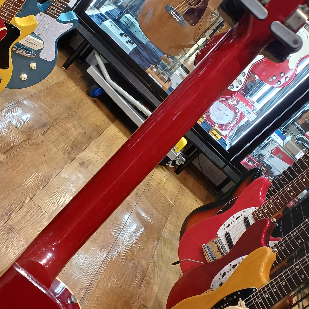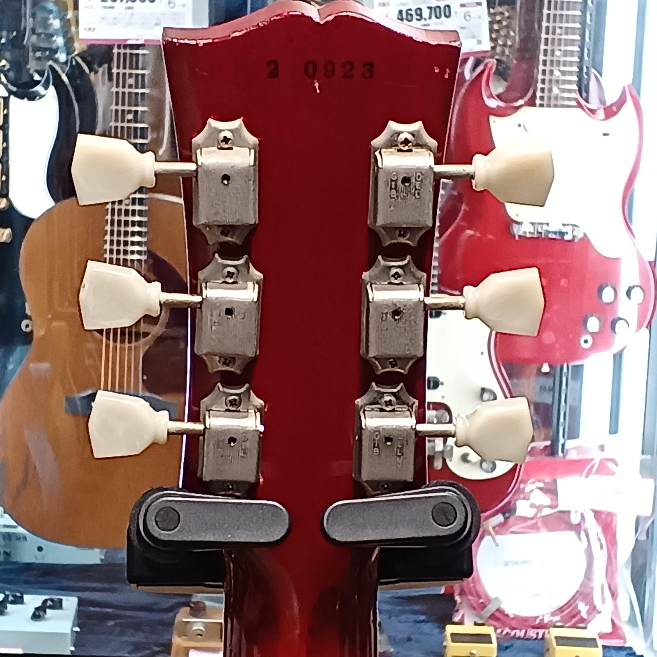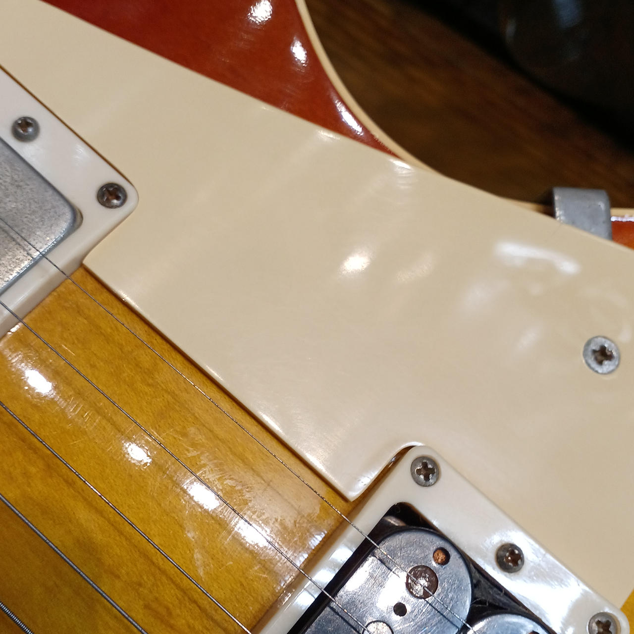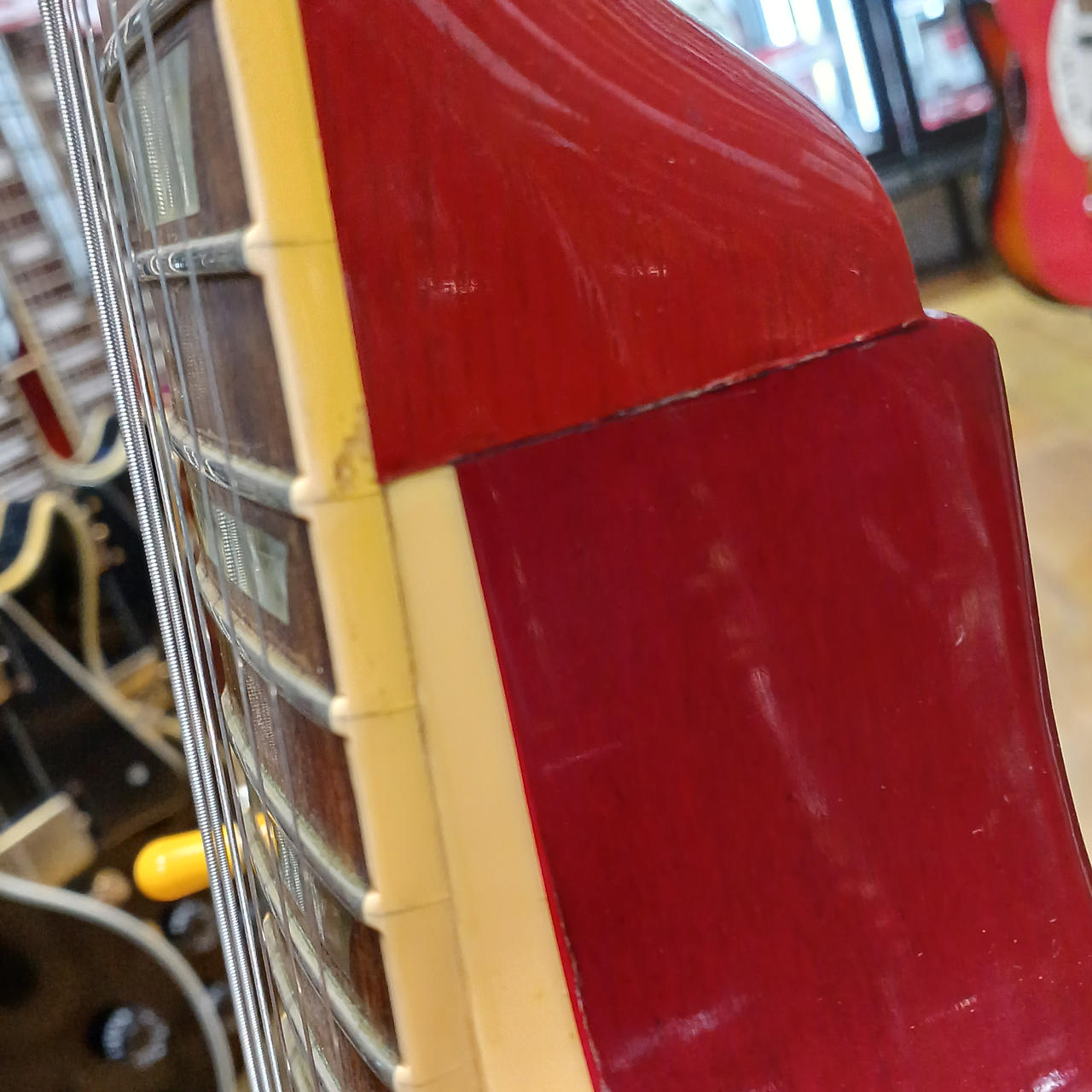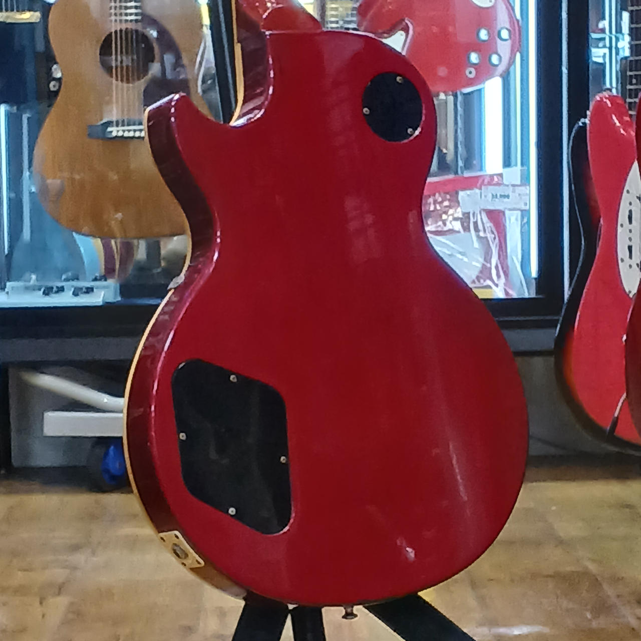 メイプルプレーントップ、マホガニーボディ、マホガニーネック、ローズウッド指板、ピックアップはリアが同社のものに交換されていると思われます。 |