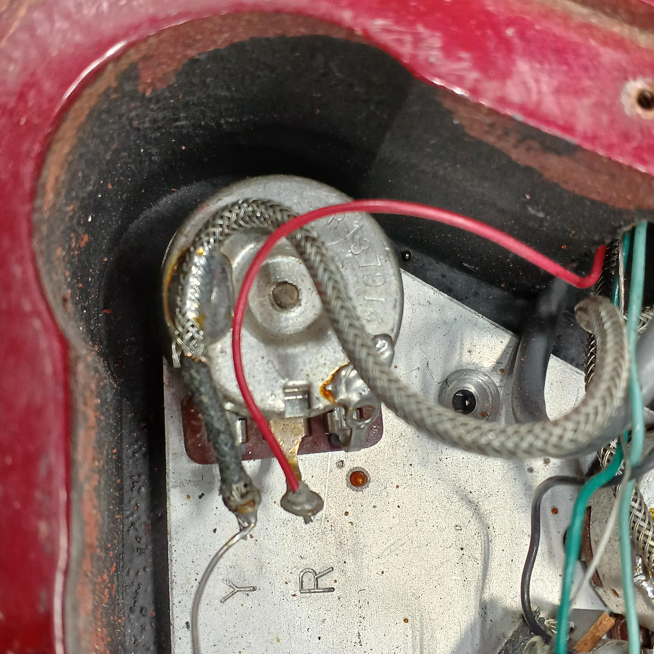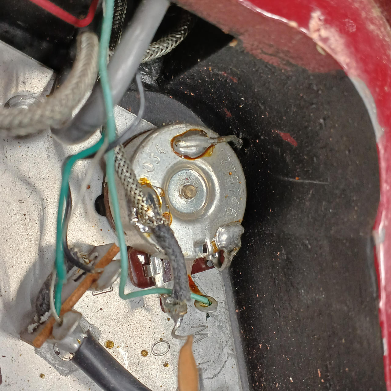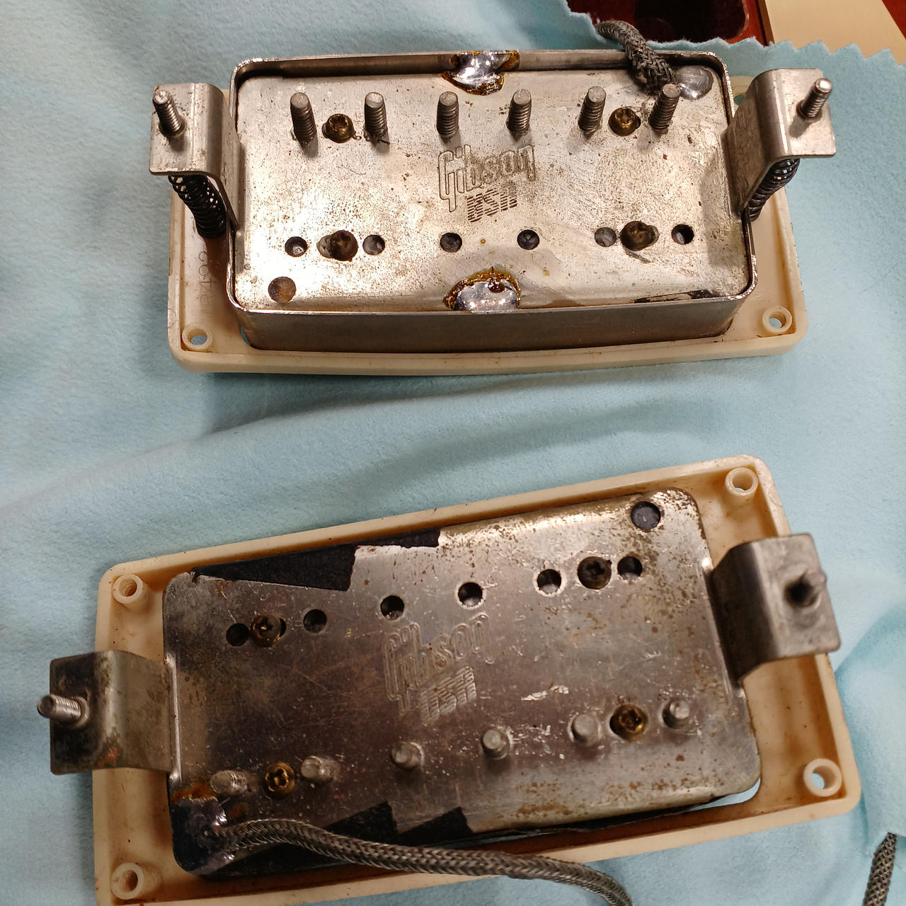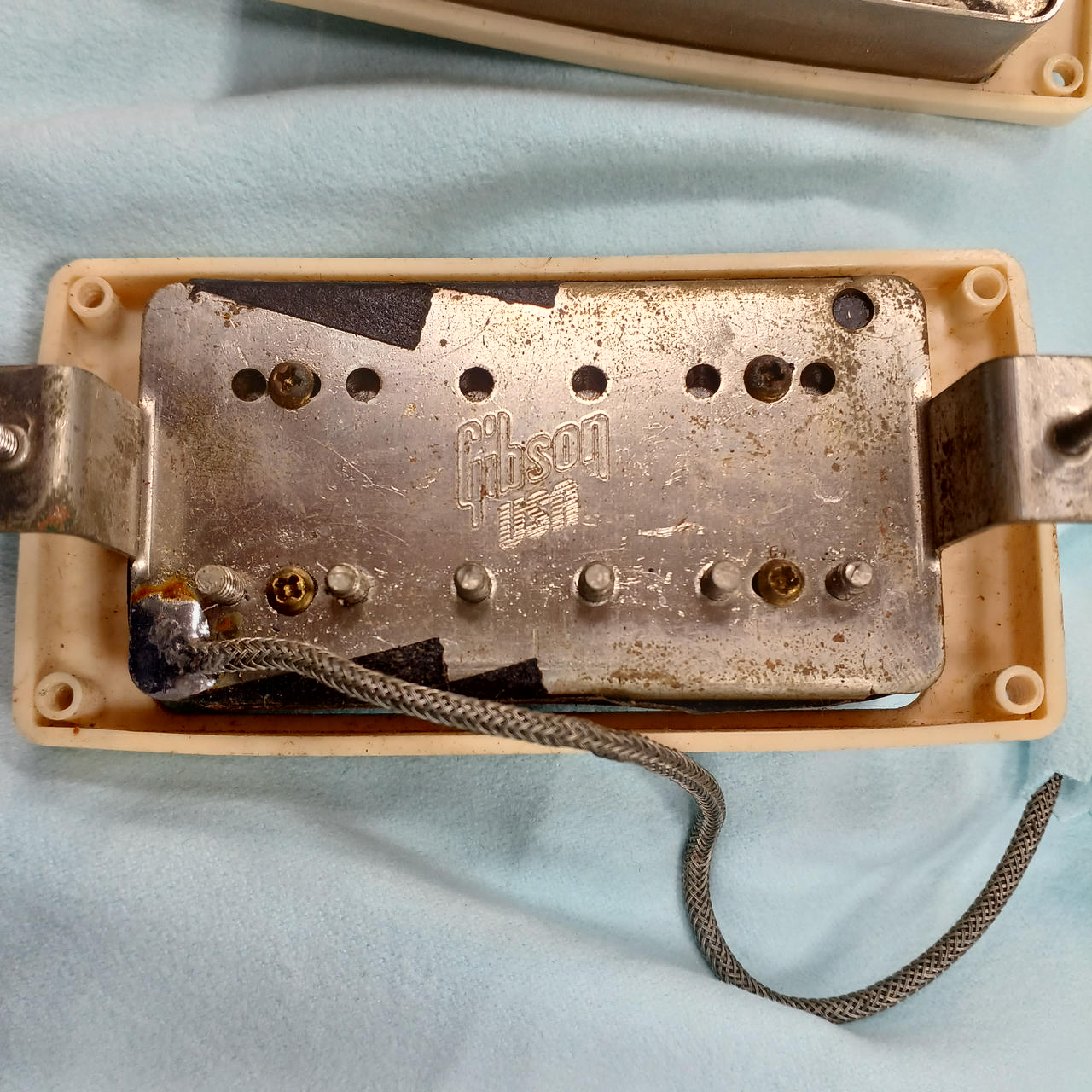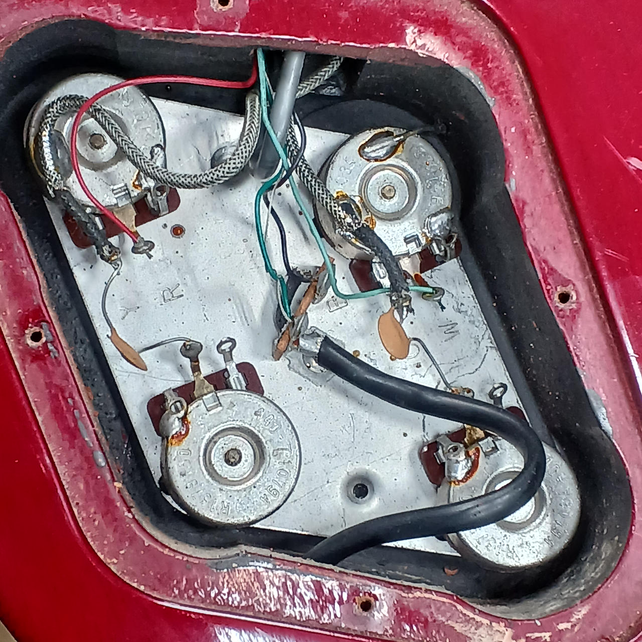 メイプルプレーントップ、マホガニーボディ、マホガニーネック、ローズウッド指板、ピックアップはリアが同社のものに交換されていると思われます。 |