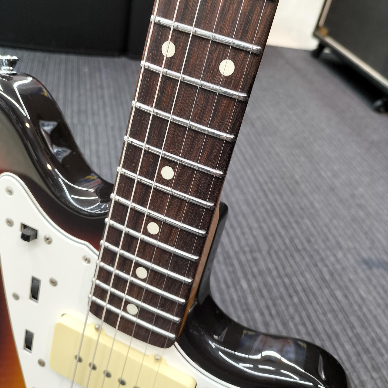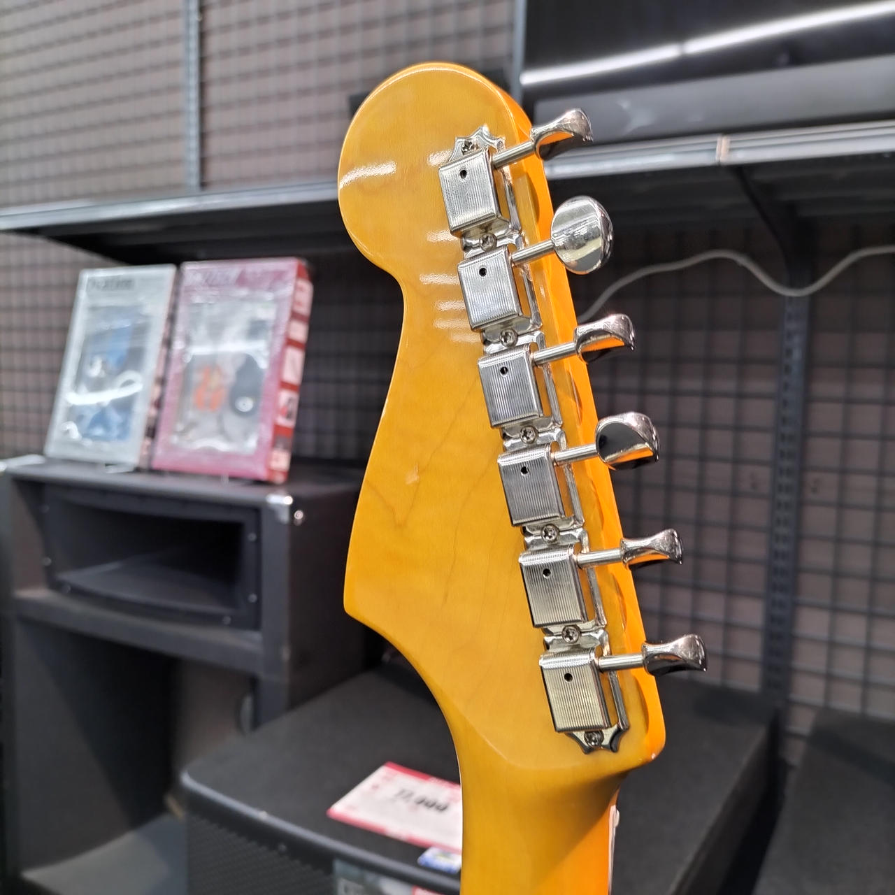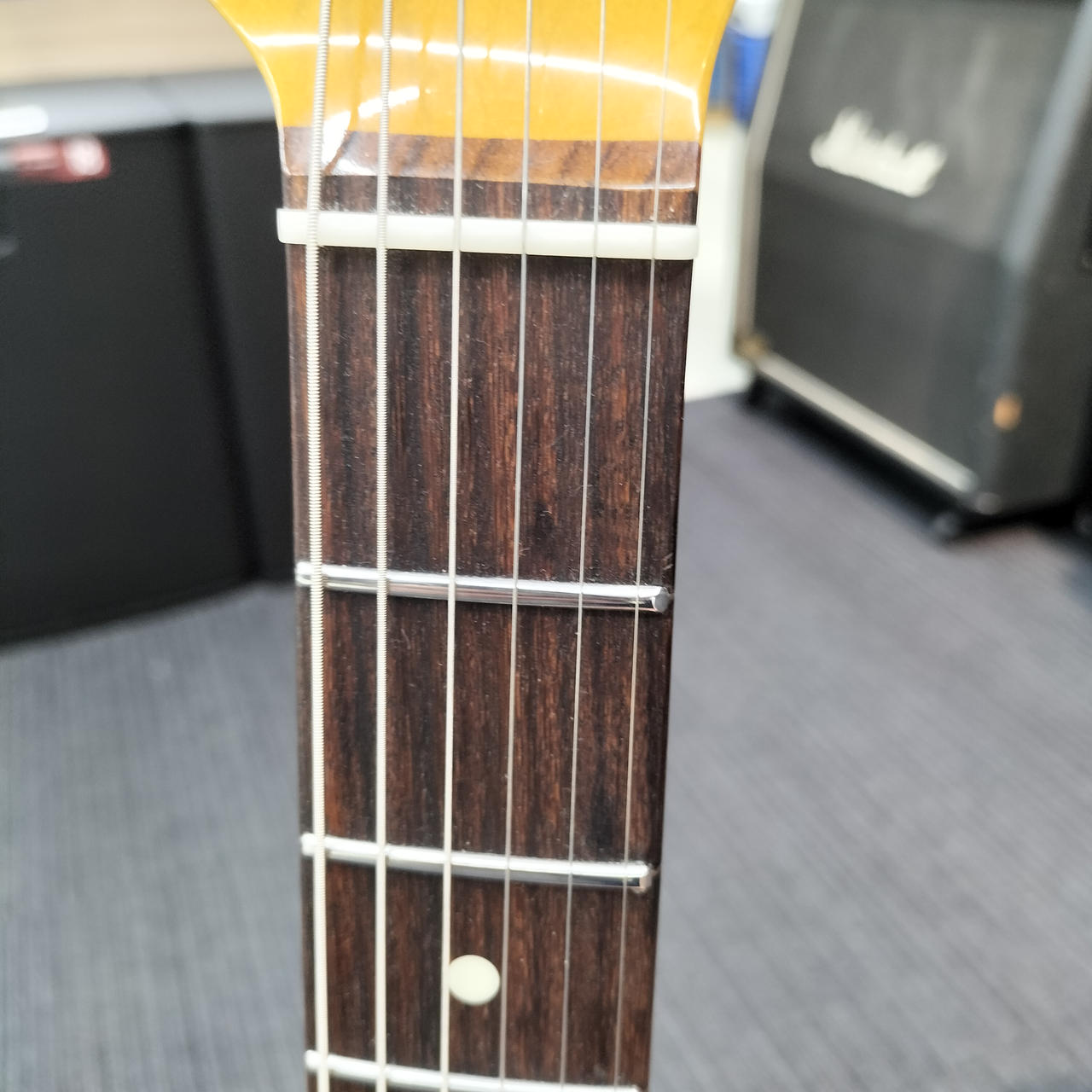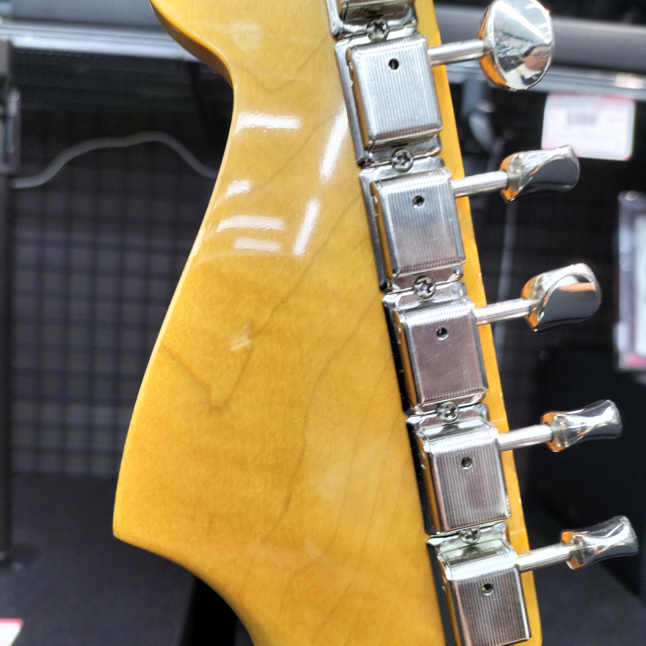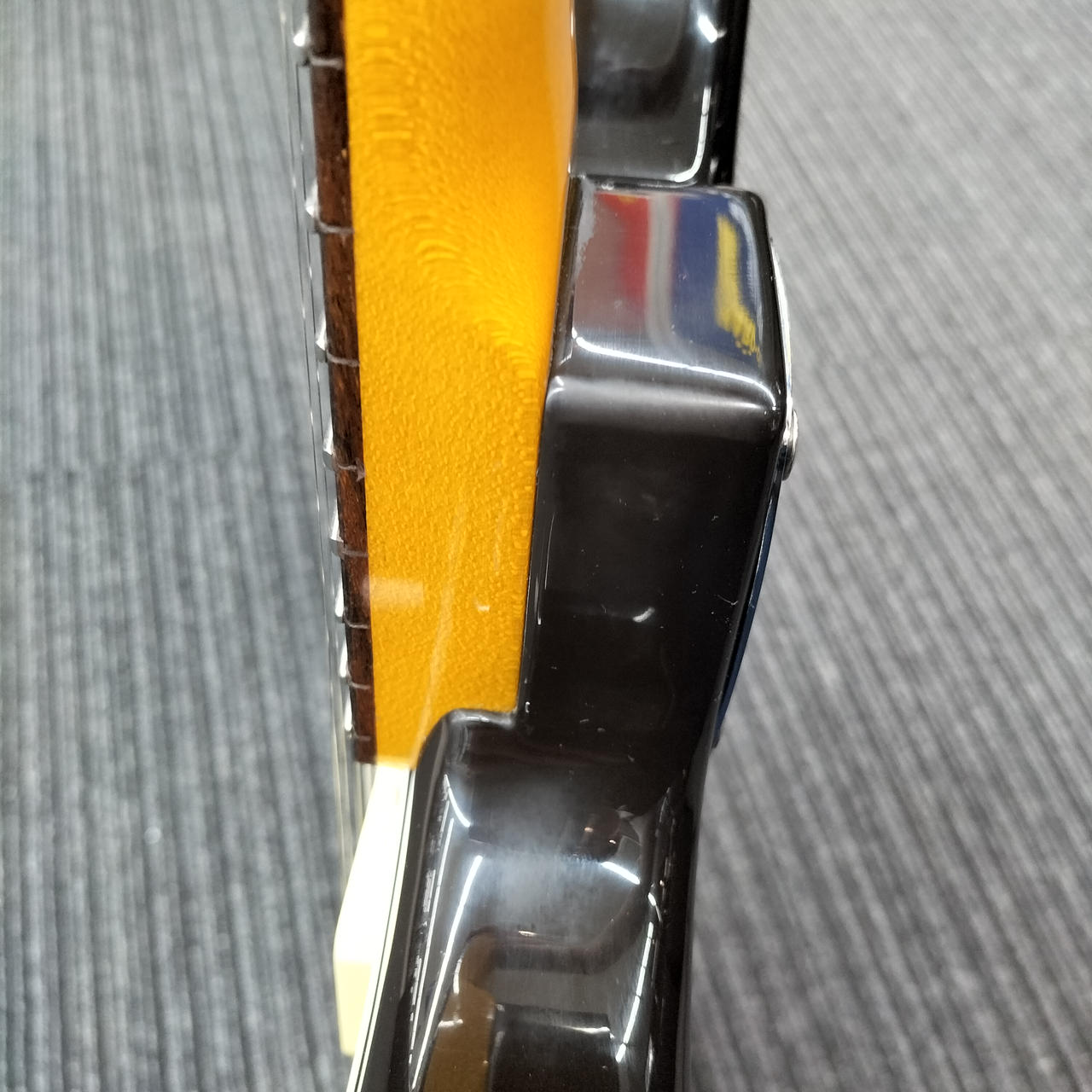ネックはフェンダー製ですがフレットが打ち換えられており、ジャンボフレットになっております。また、フレット全体に浮きが見られます。 |