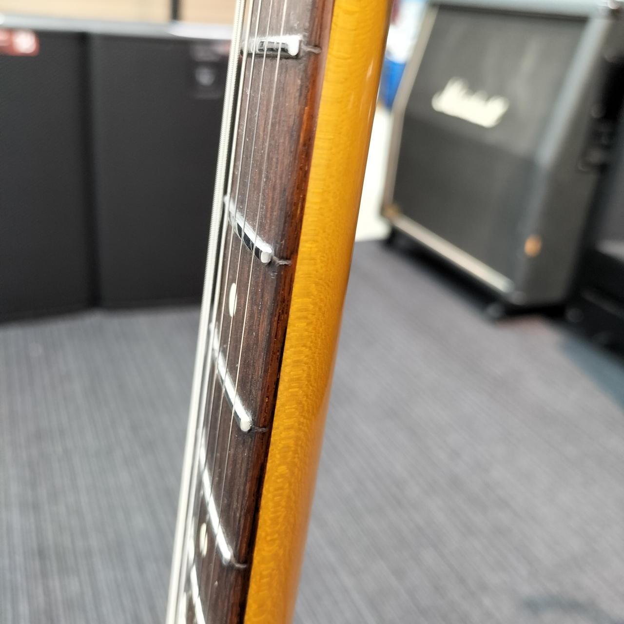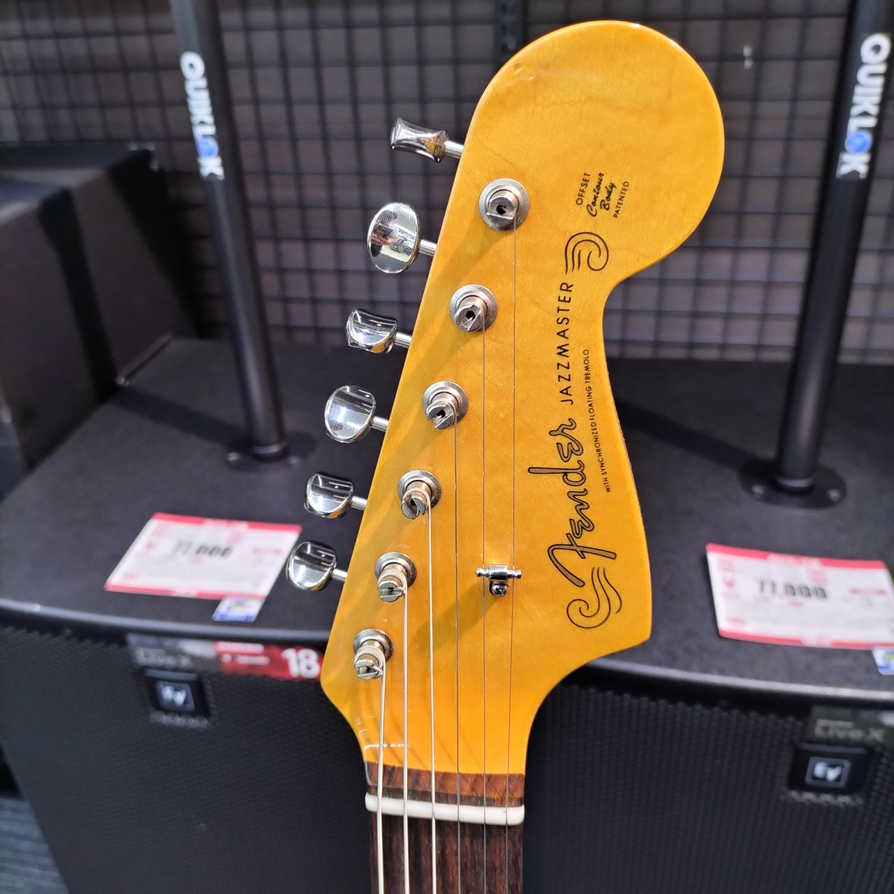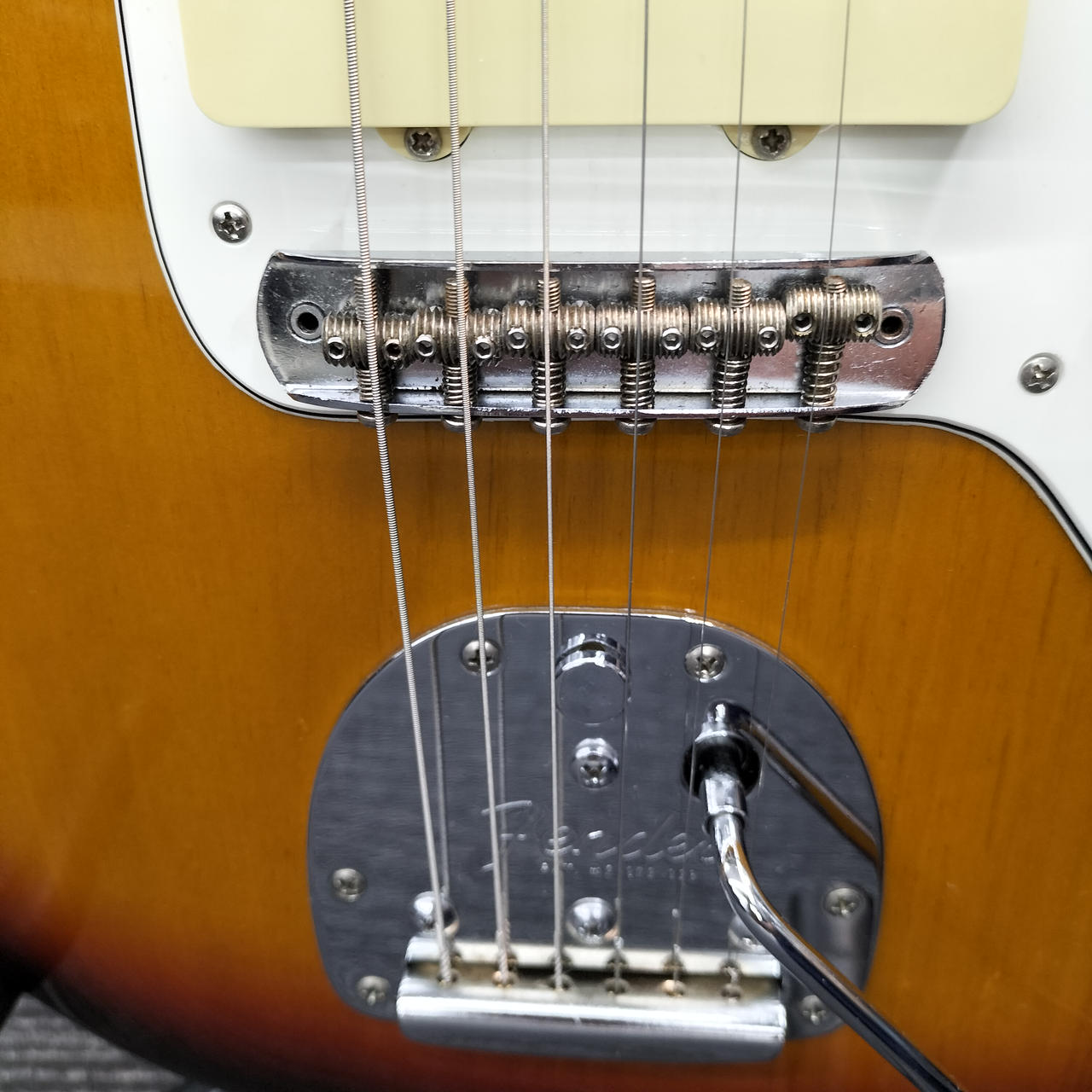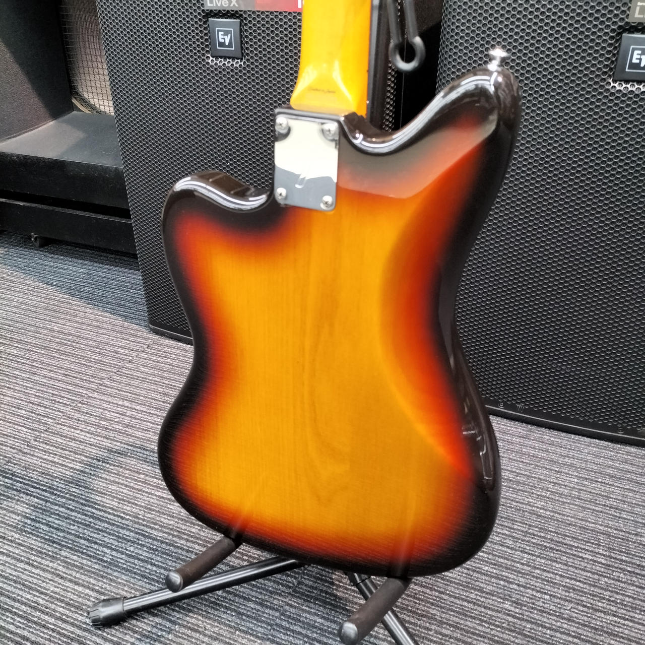 ネックはフェンダー製ですがフレットが打ち換えられており、ジャンボフレットになっております。また、フレット全体に浮きが見られます。 |