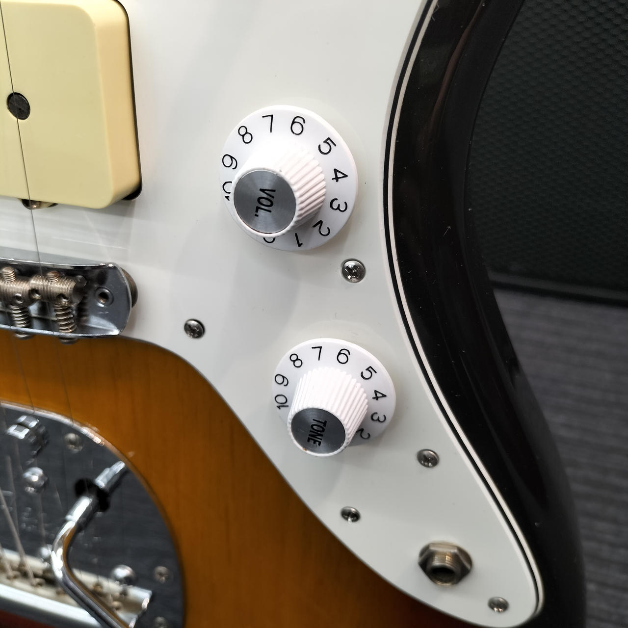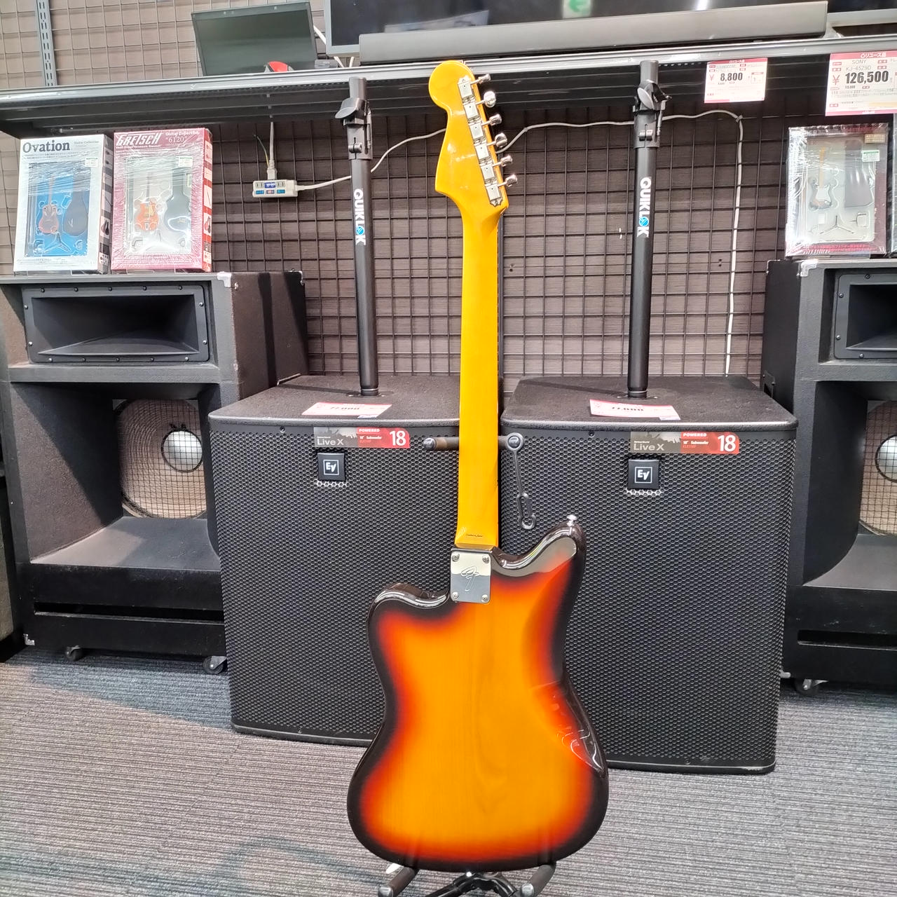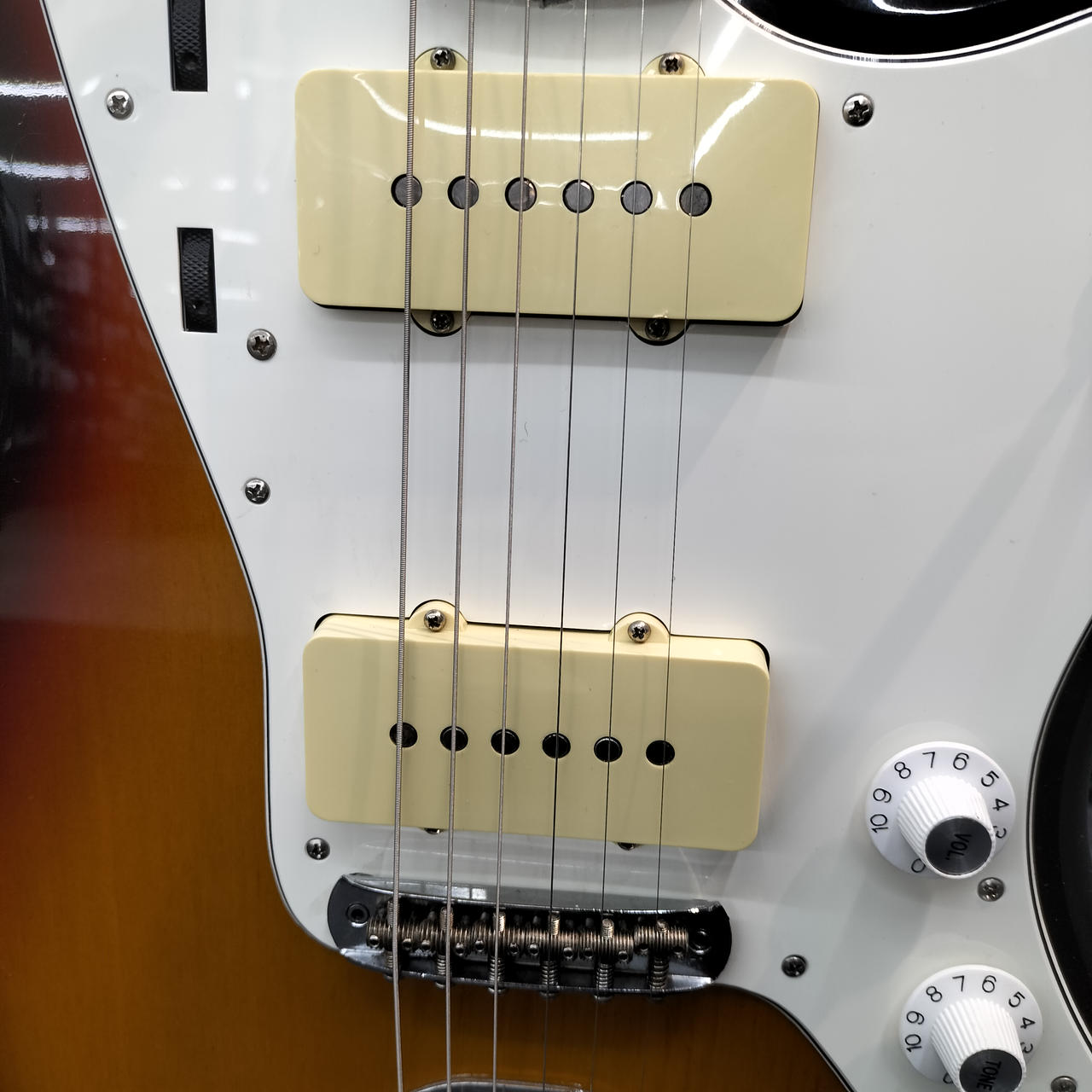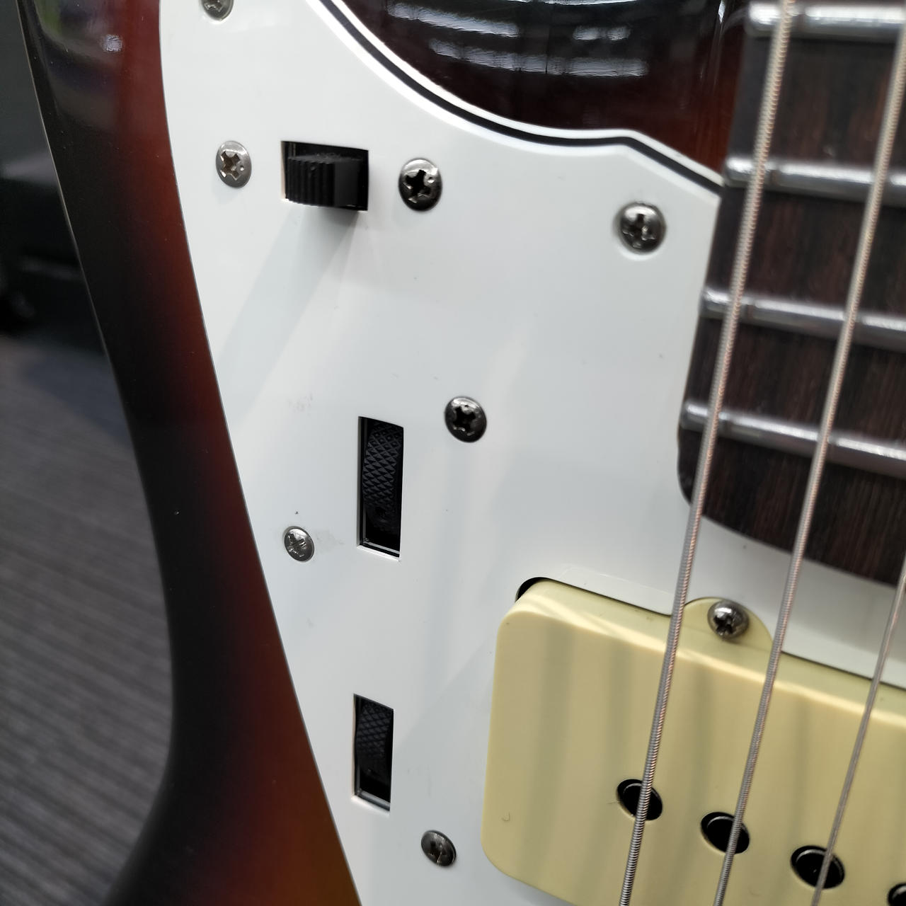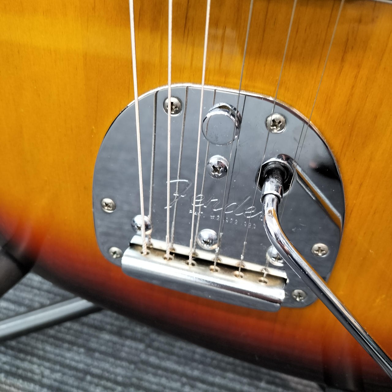 ネックはフェンダー製ですがフレットが打ち換えられており、ジャンボフレットになっております。また、フレット全体に浮きが見られます。 |