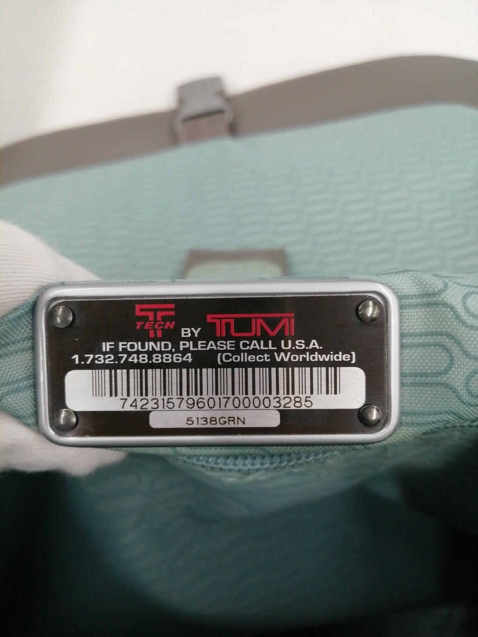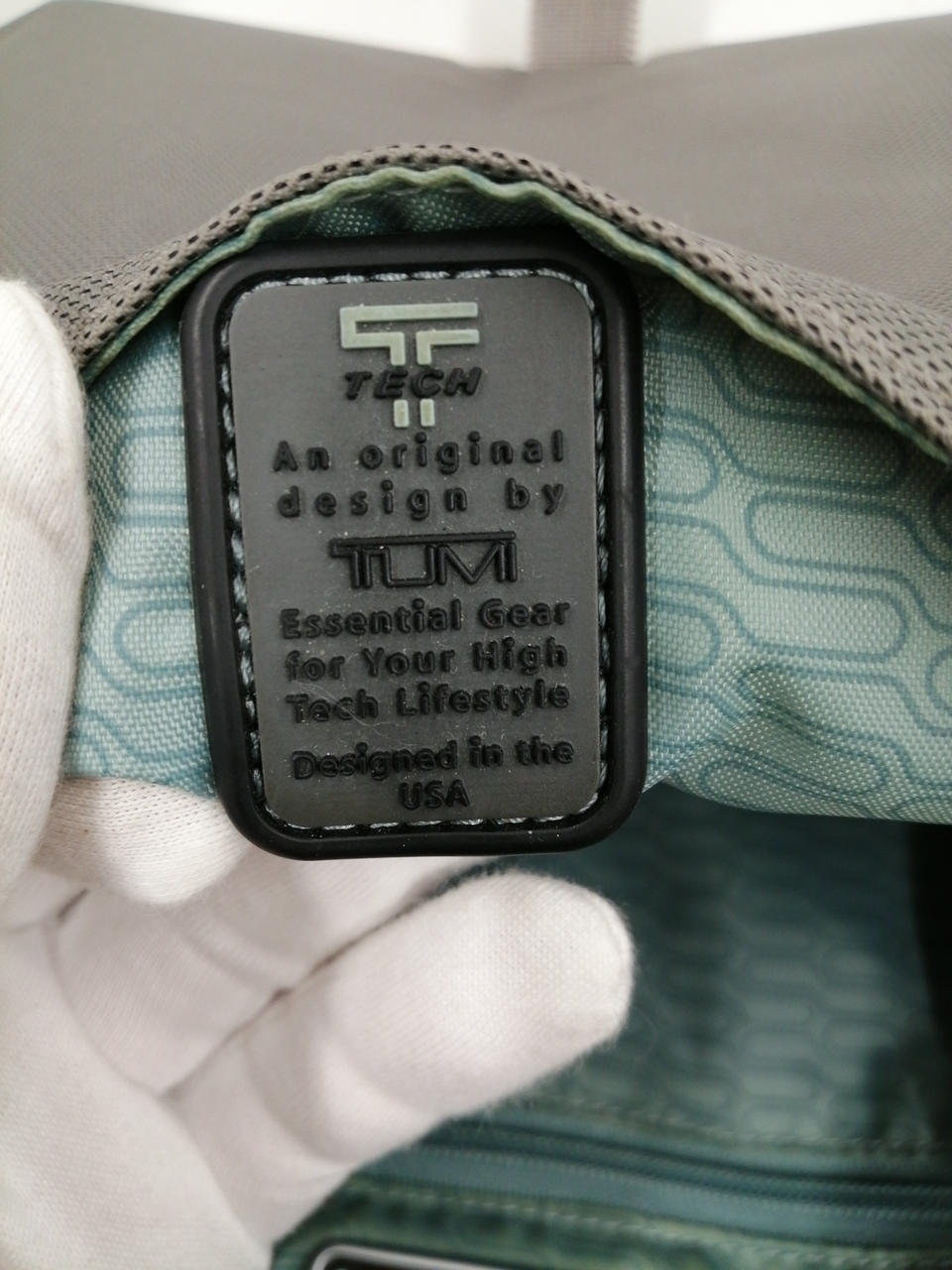 TUMIのゴムタグに接着跡、破損によるTの部分がかなり、ズレてます。(掲載写真参照ください)