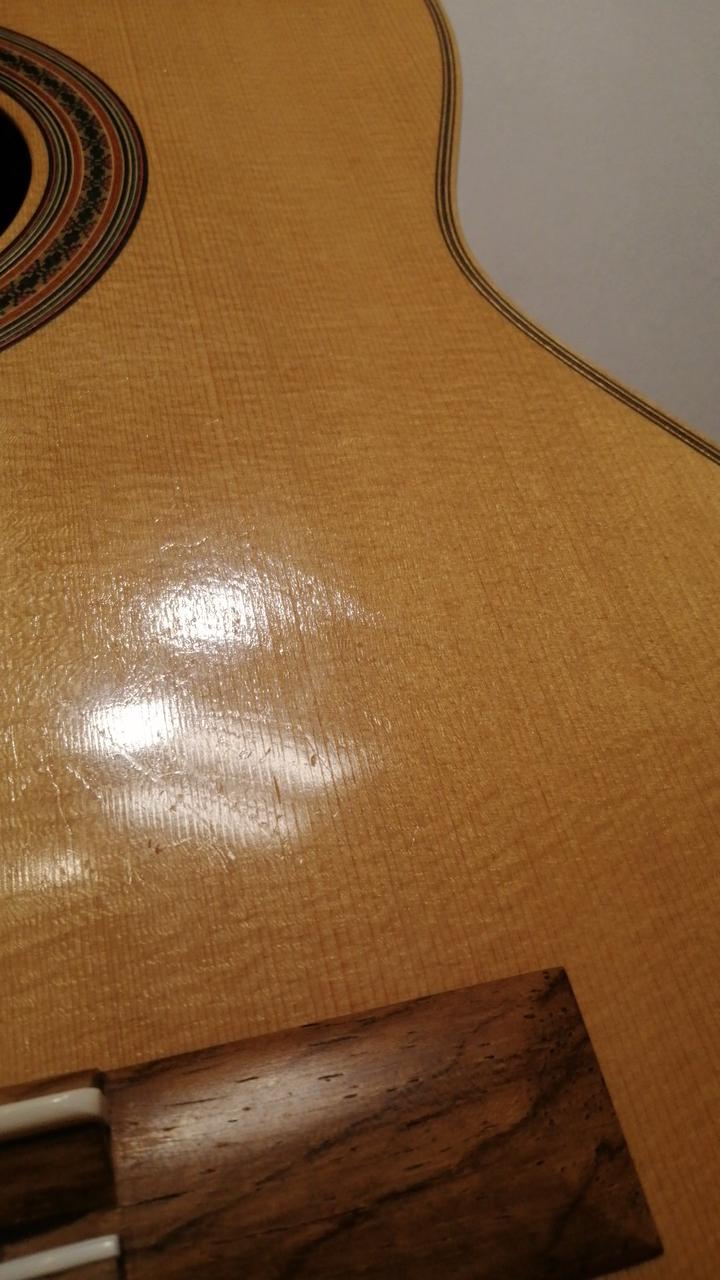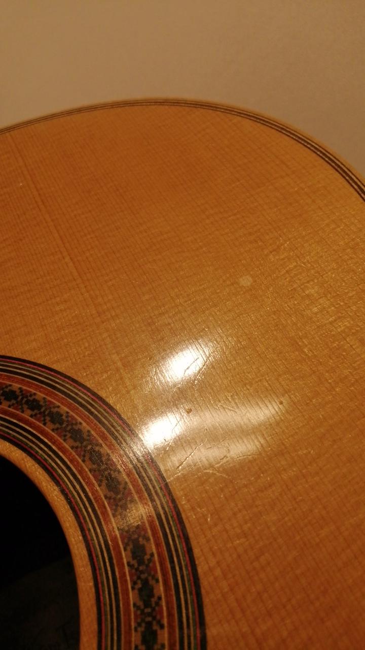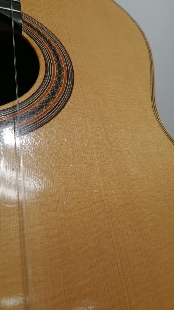 ドイツ松単板トップ、インディアンローズウッド単板サイドバック、弦長650mm、ナット幅52mm、トップは木地からのセラックニス仕上げ。 |