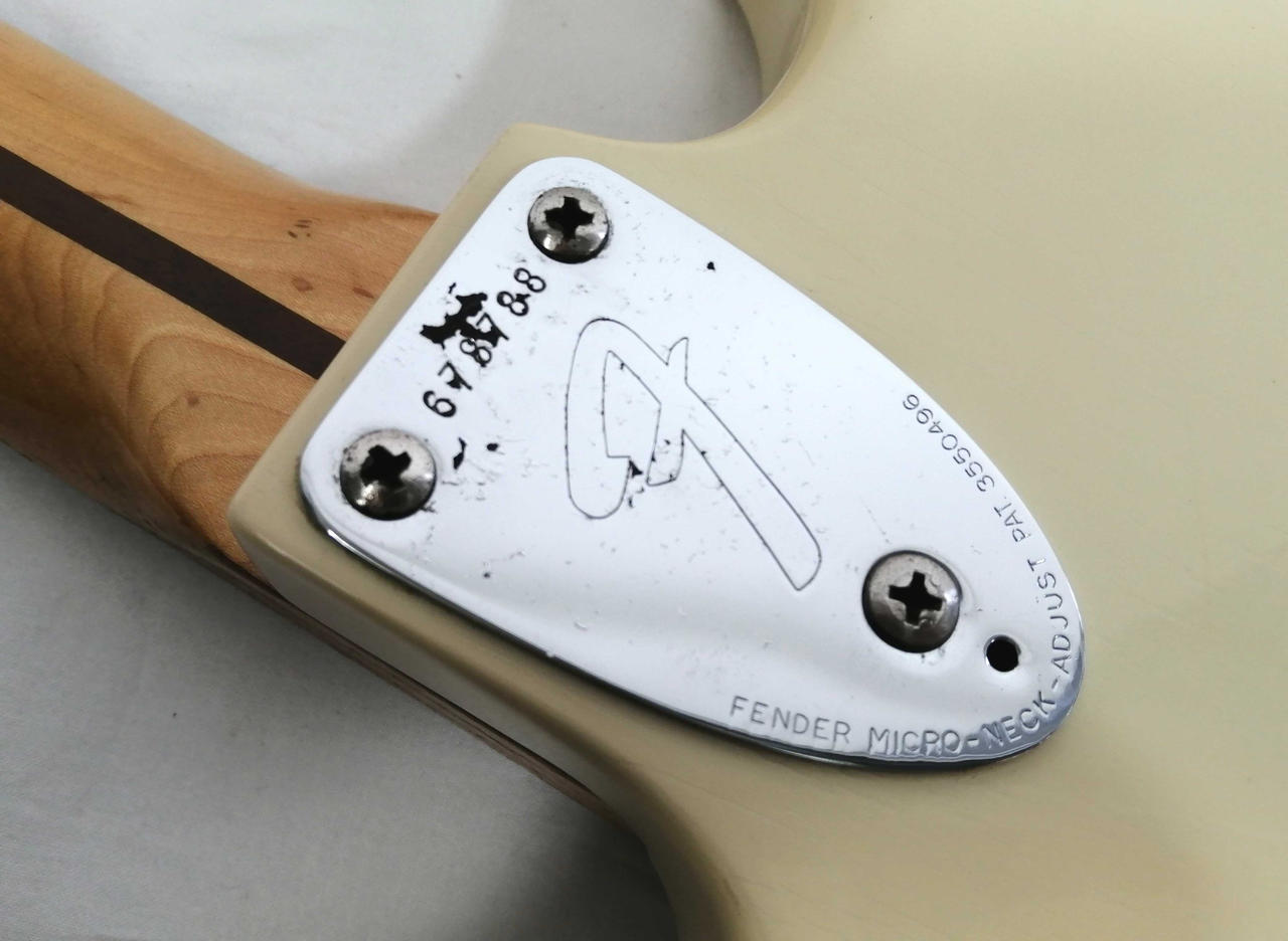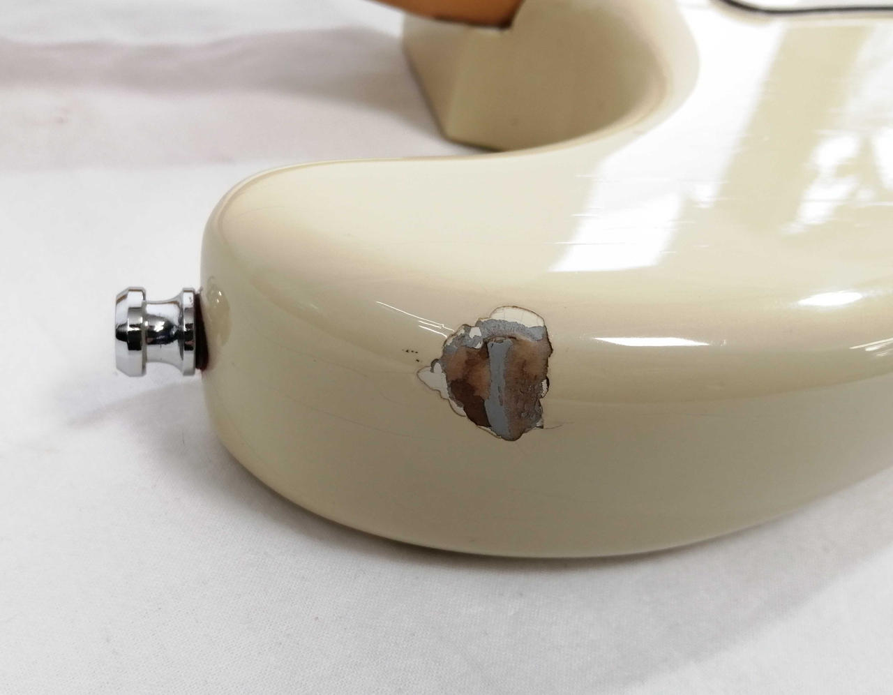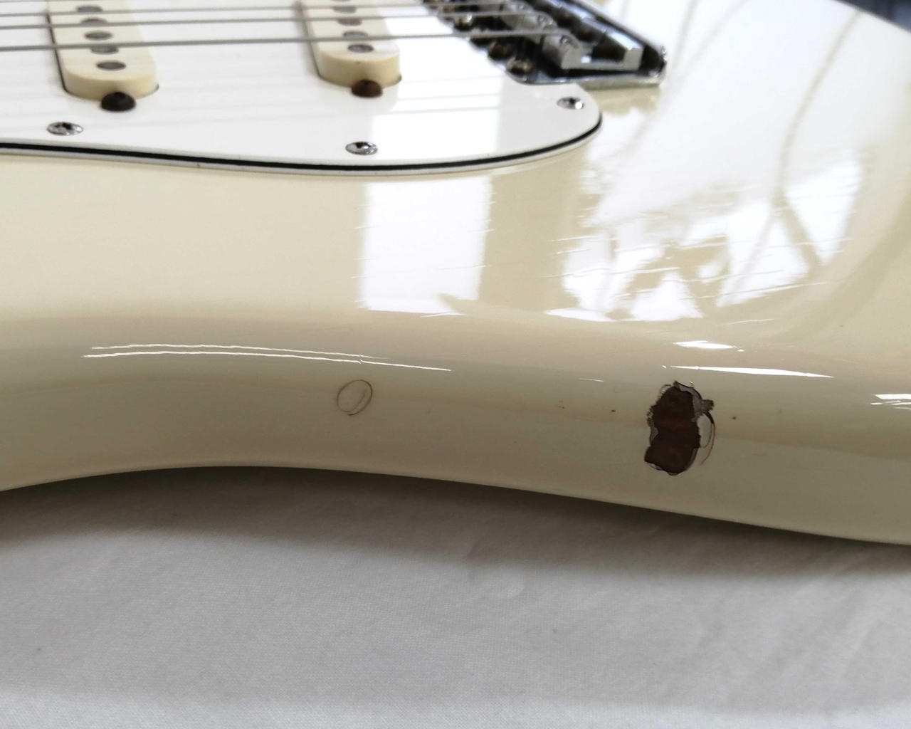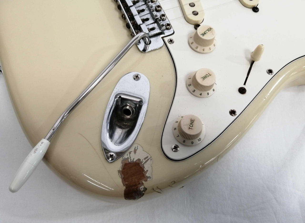 キズ: 全体的に傷や汚れなどのダメージがあります。ボディ表面に打痕と塗装剥がれ4箇所、側面に打痕も傷多数、ボディ裏面に打痕2箇所と傷が多数ございます。ネックの側面の木が削れている箇所が多数、裏に軽度の打痕があります。(ハードケースに割れがあります。写真20枚目をご確認ください) |