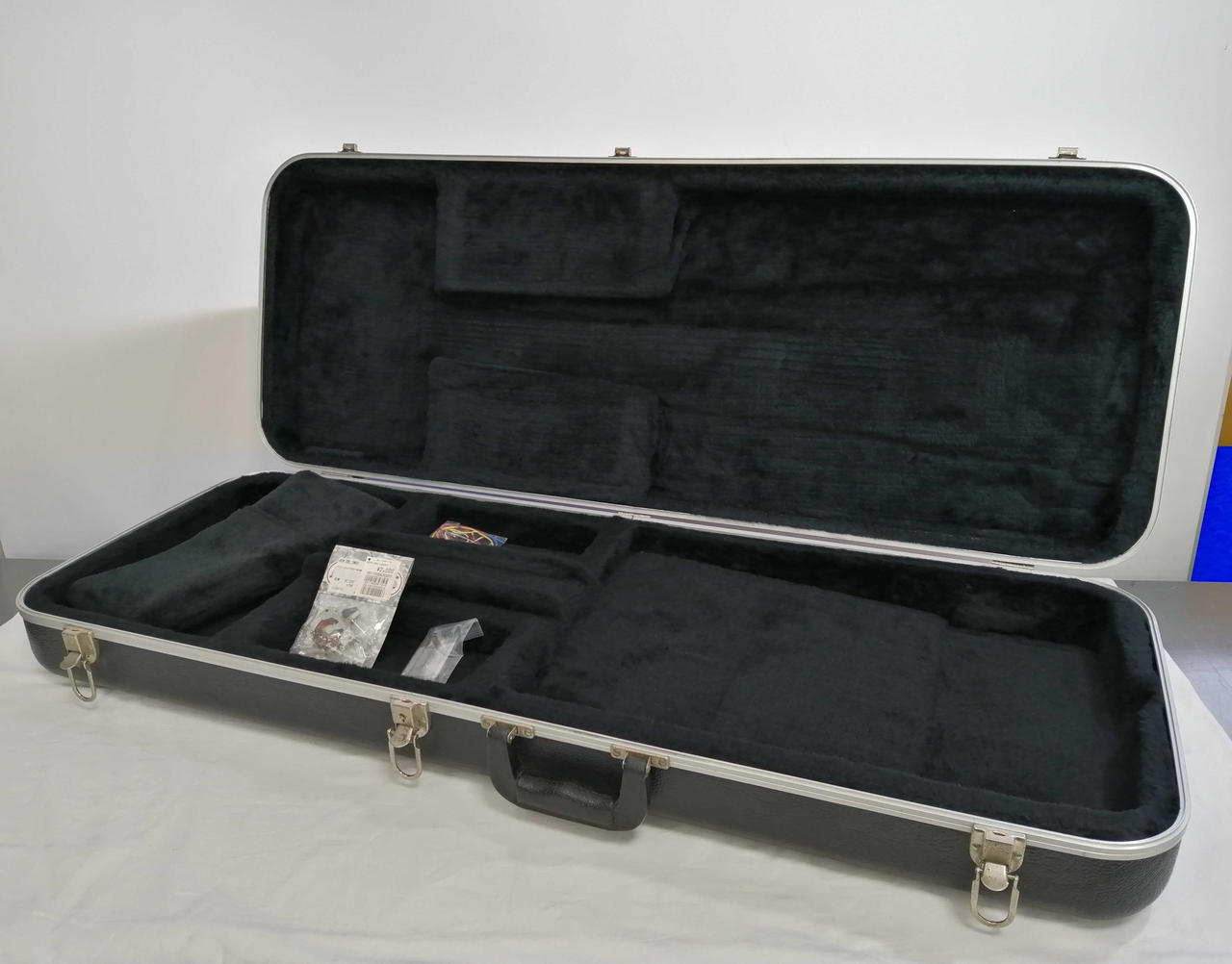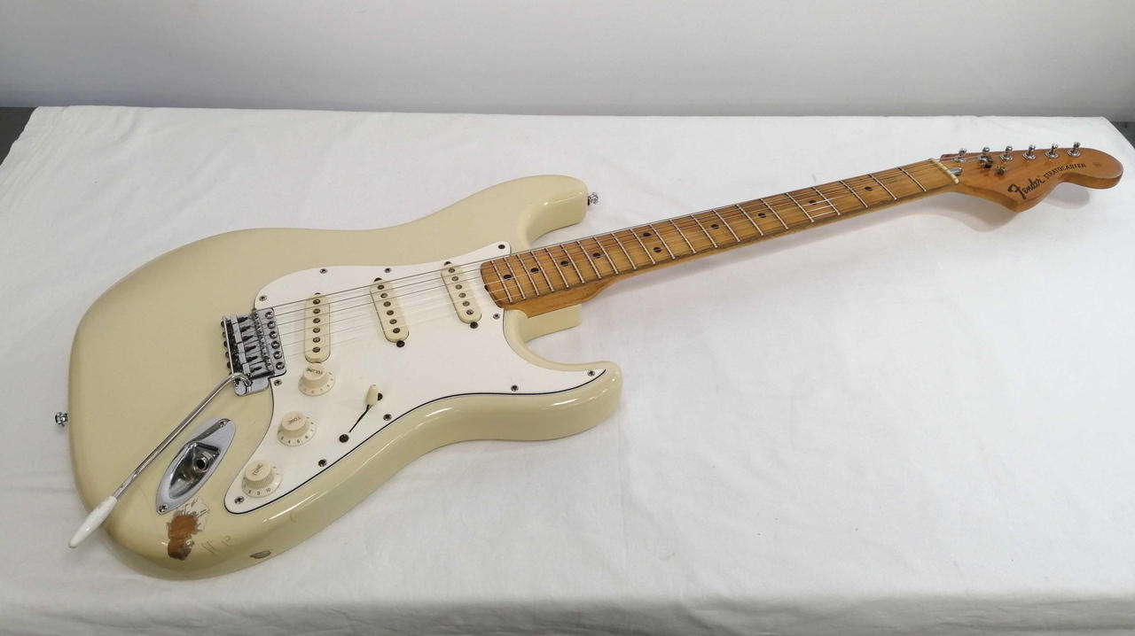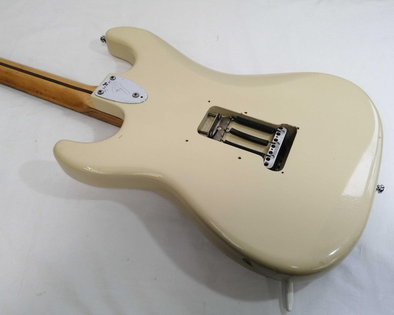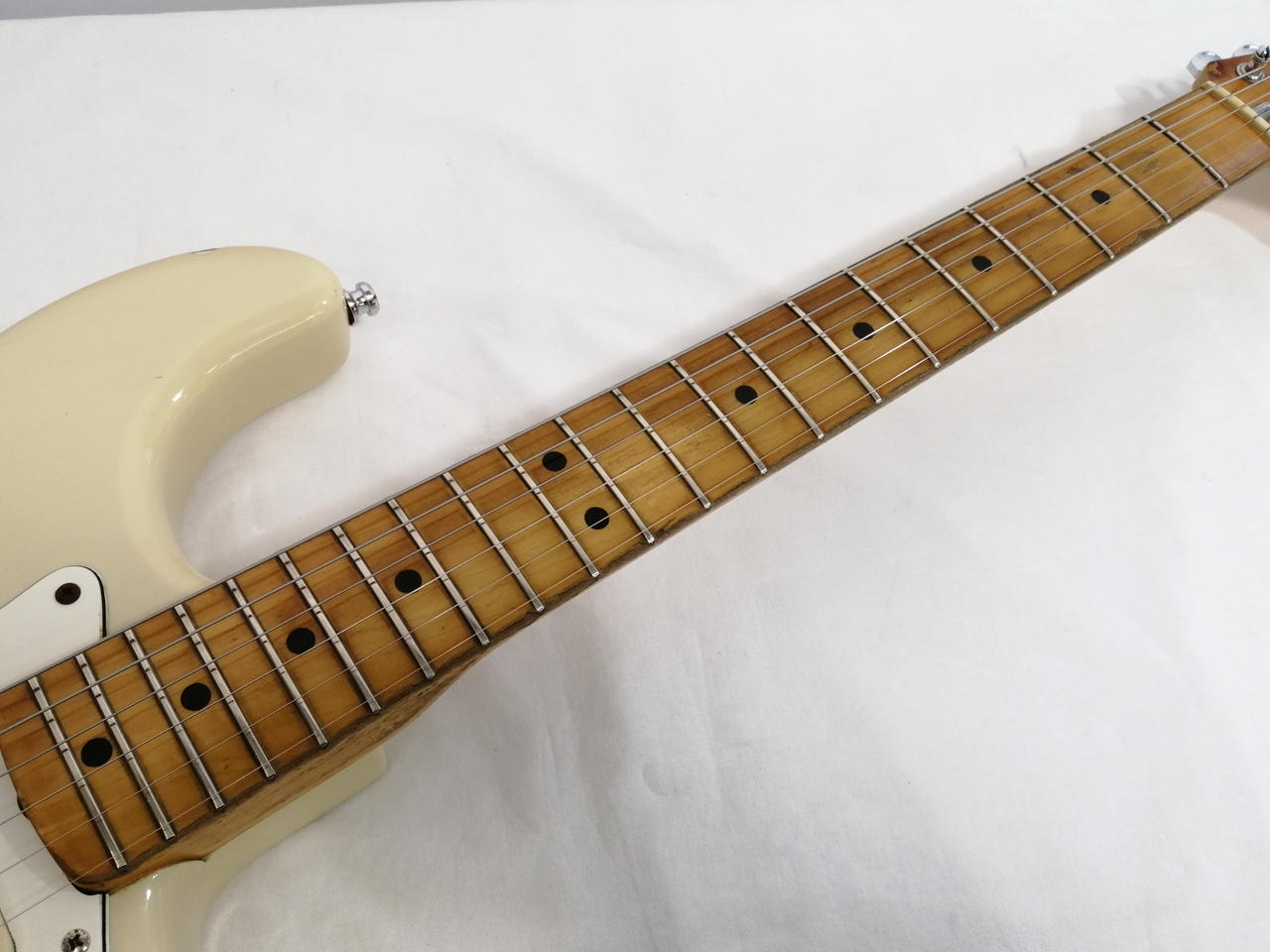 キズ: 全体的に傷や汚れなどのダメージがあります。ボディ表面に打痕と塗装剥がれ4箇所、側面に打痕も傷多数、ボディ裏面に打痕2箇所と傷が多数ございます。ネックの側面の木が削れている箇所が多数、裏に軽度の打痕があります。(ハードケースに割れがあります。写真20枚目をご確認ください) |