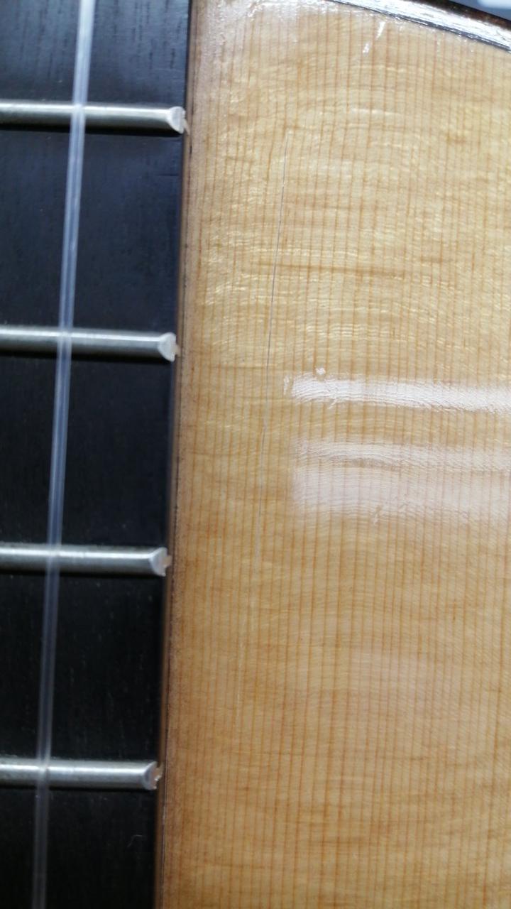 ※向かって右側ボディ右上指板サイドにクラックが発生し、202506に黒澤楽器にて接着、割れ止め2ヵ所(再塗装無し)を実施しました。 |