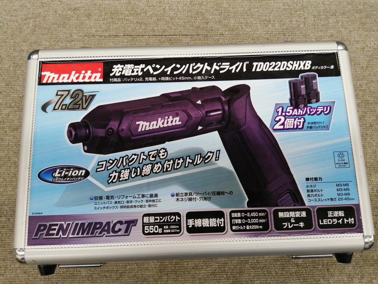 対応電圧:7.2V 最大締め付けトルク:25N・m 回転数/分:0~2450 |