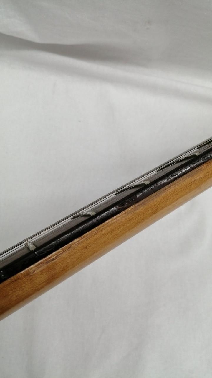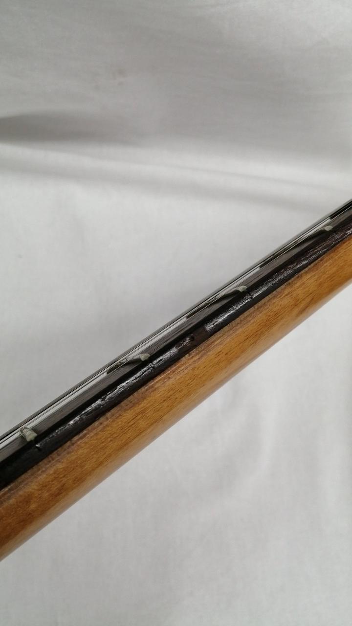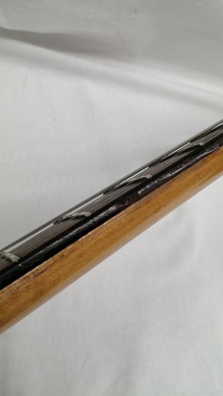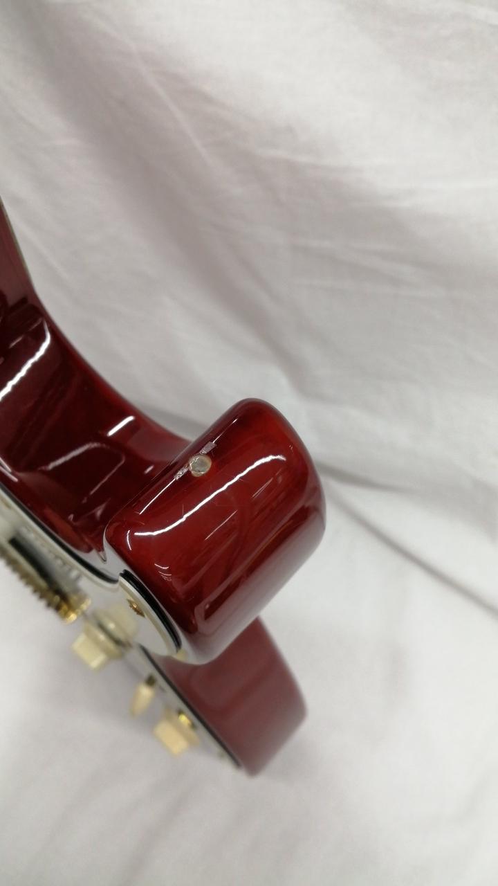 注意事項:過去に左利き用にDIY加工されていた形跡あり。①向かって右側のボディ角先端にストラップピン穴開け跡を埋めた形跡あり ②ナット幅を無理に合わせた削り跡あり ③かなり強めにストロークしたと見られフレット全域に凹み型偏摩耗が発生しています。一番深い所で六割残りの印象です。④一弦側フレットサイドにポジションマーク用途で小さな穴を開けたり削った形跡あり |