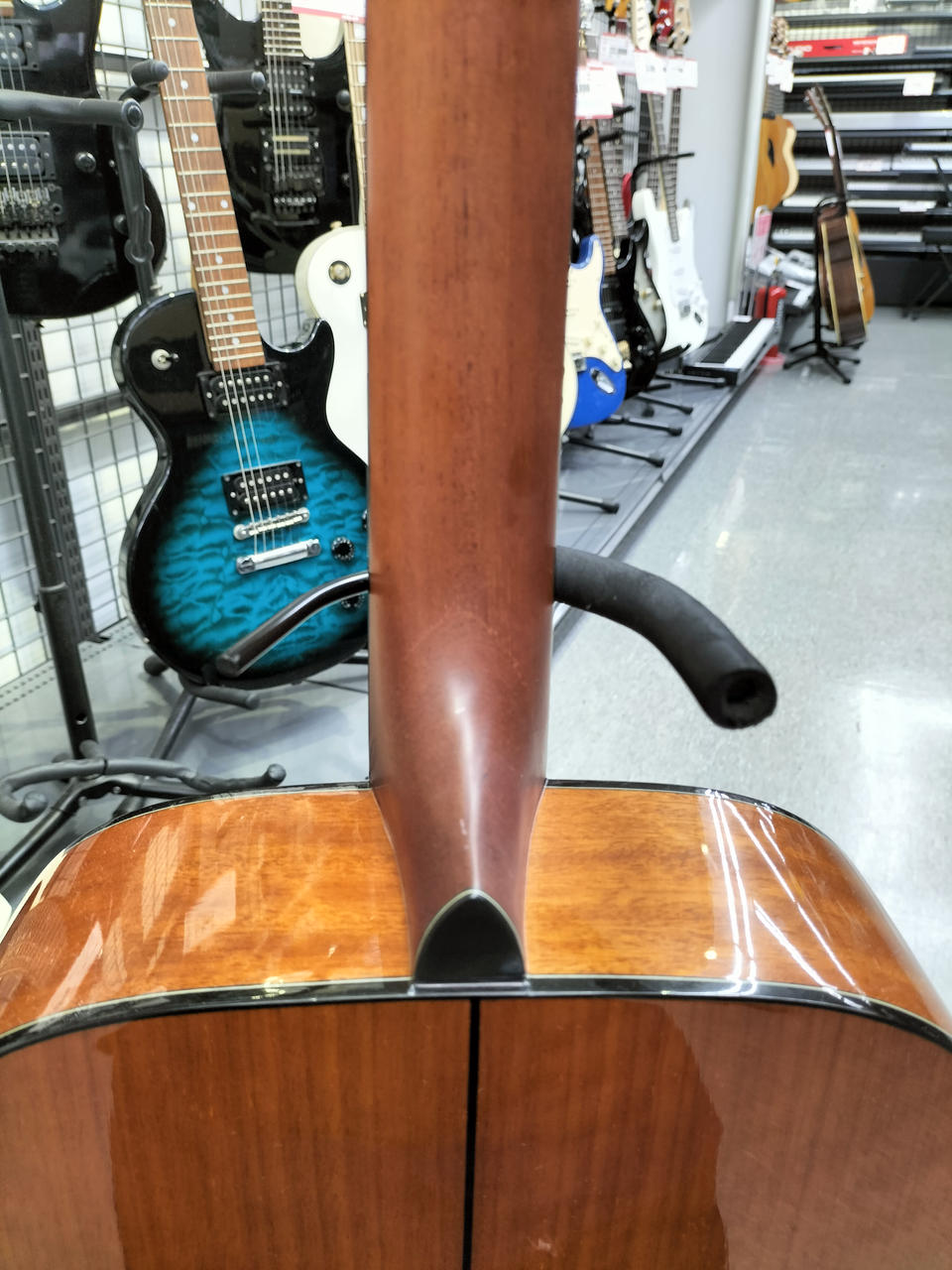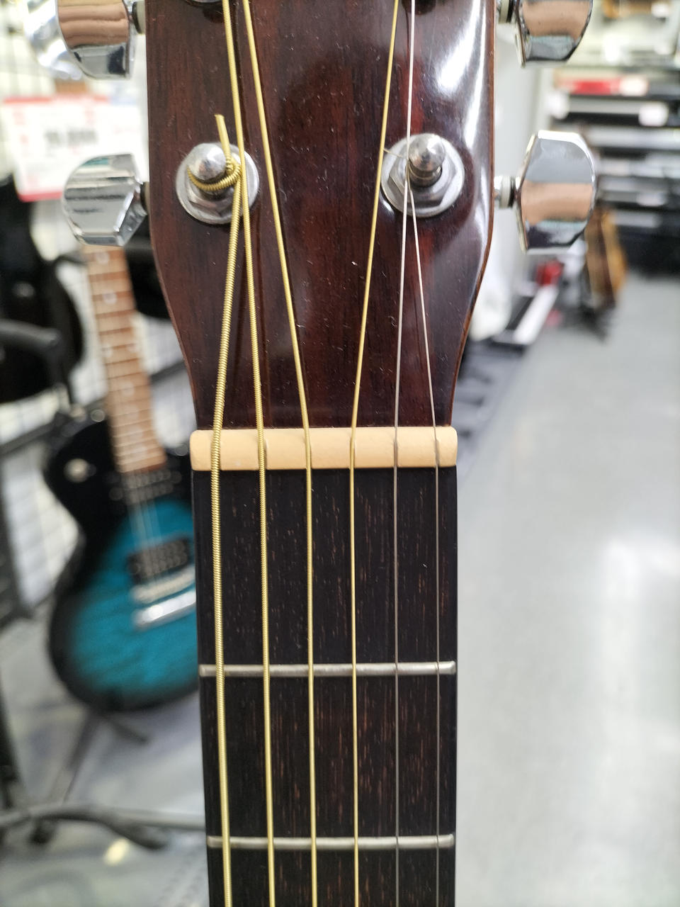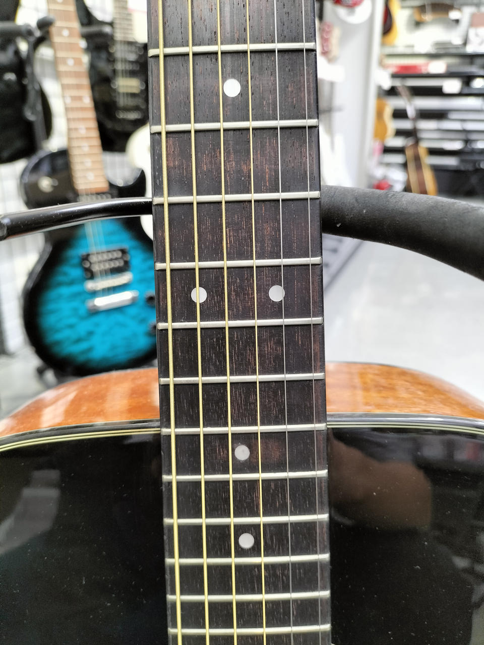 ネックが反っている為、ハイフレットになるほど、弦高が高くなります。 |