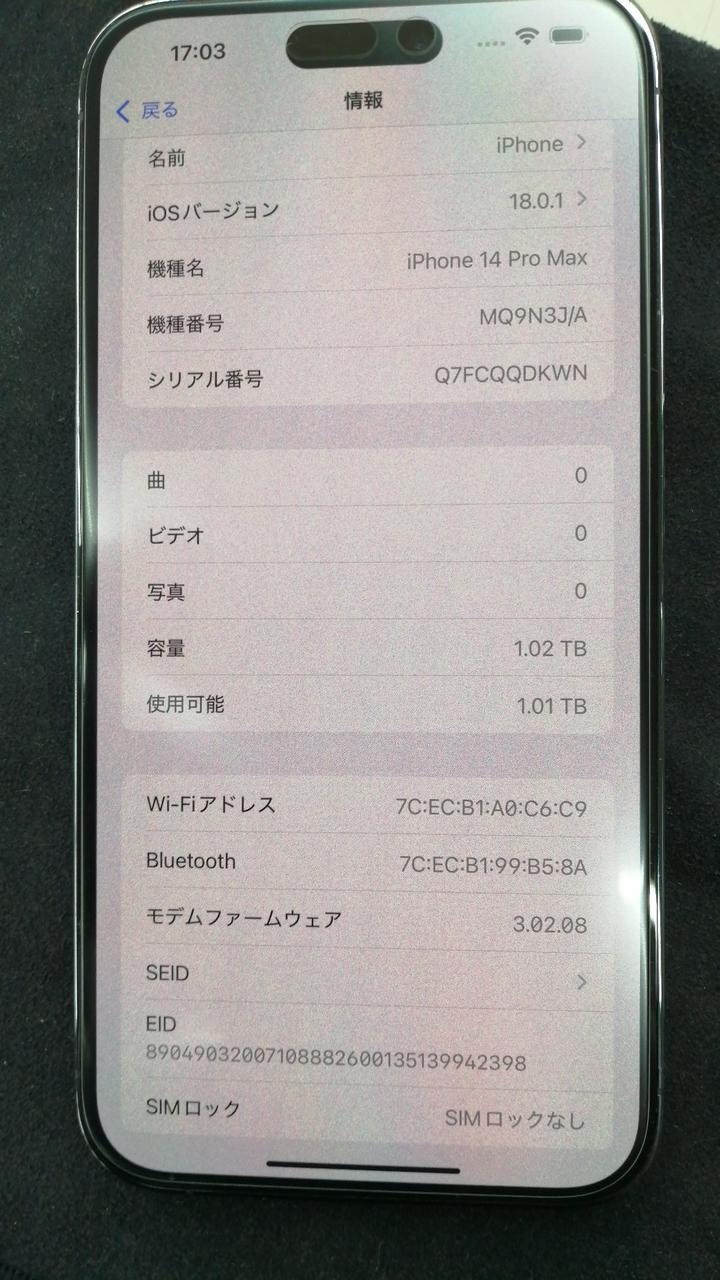 iOS:18.0.1 ストレージ:1TB AU:△ SIMロック:なし バッテリー最大容量:86% |