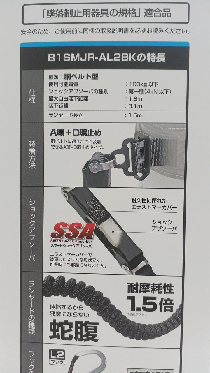 ランヤード長さ:1.5m 最大自由落下距離:1.8m |