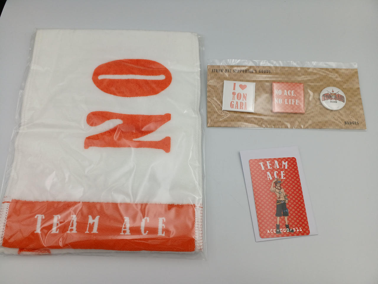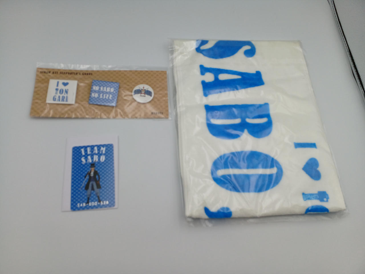 麦わらサポーターグッズ3種のセットです。サボ、エース、トラファルガー・ローの3人分となります。 |