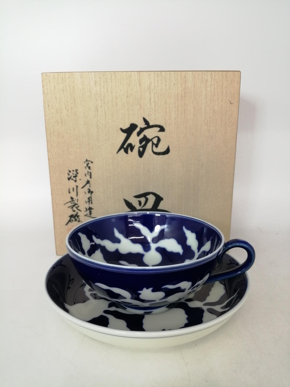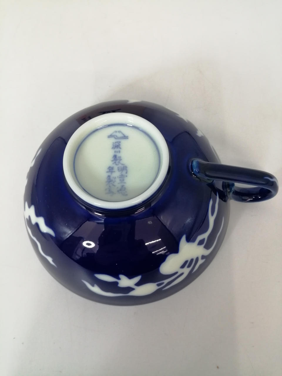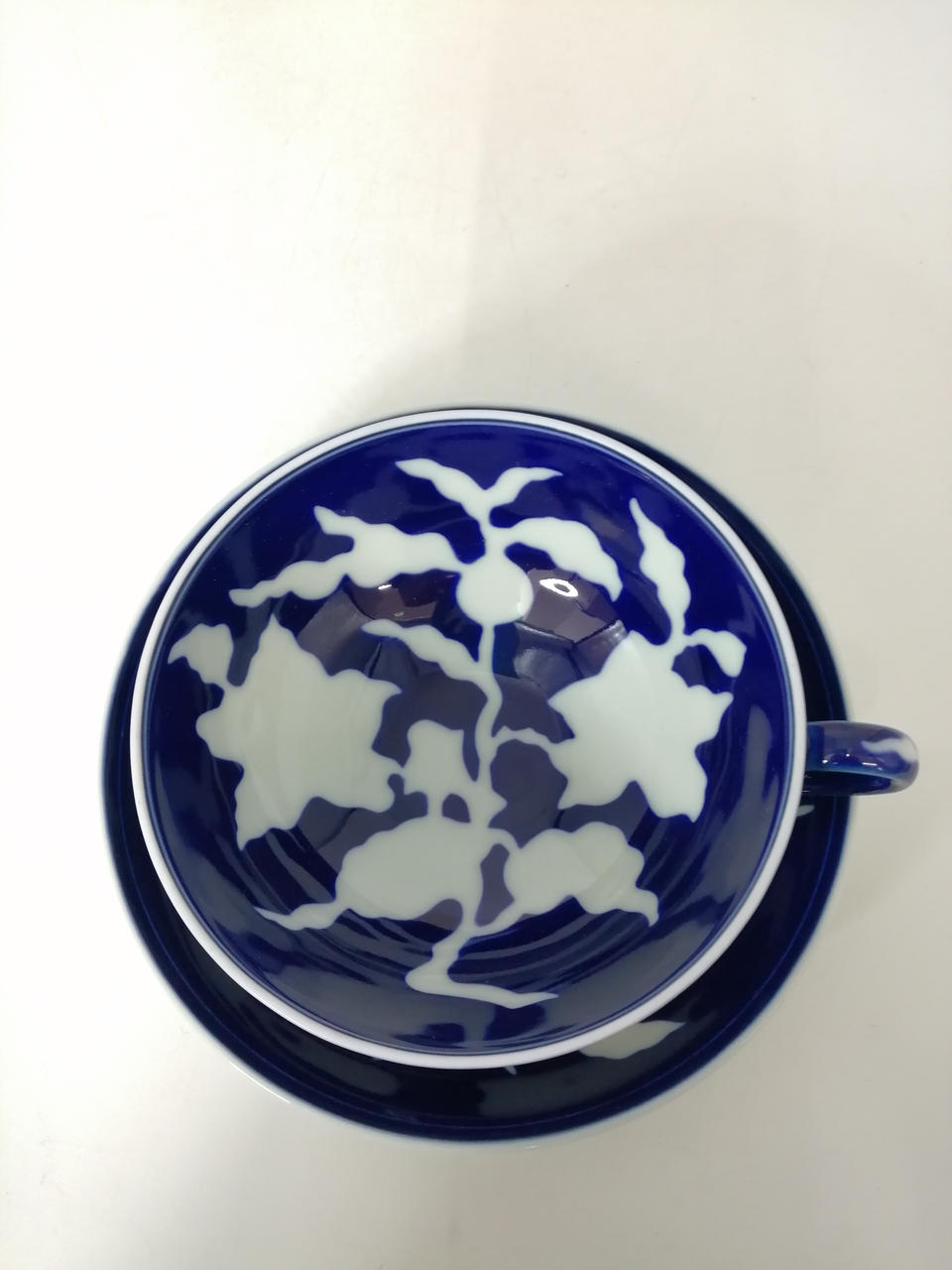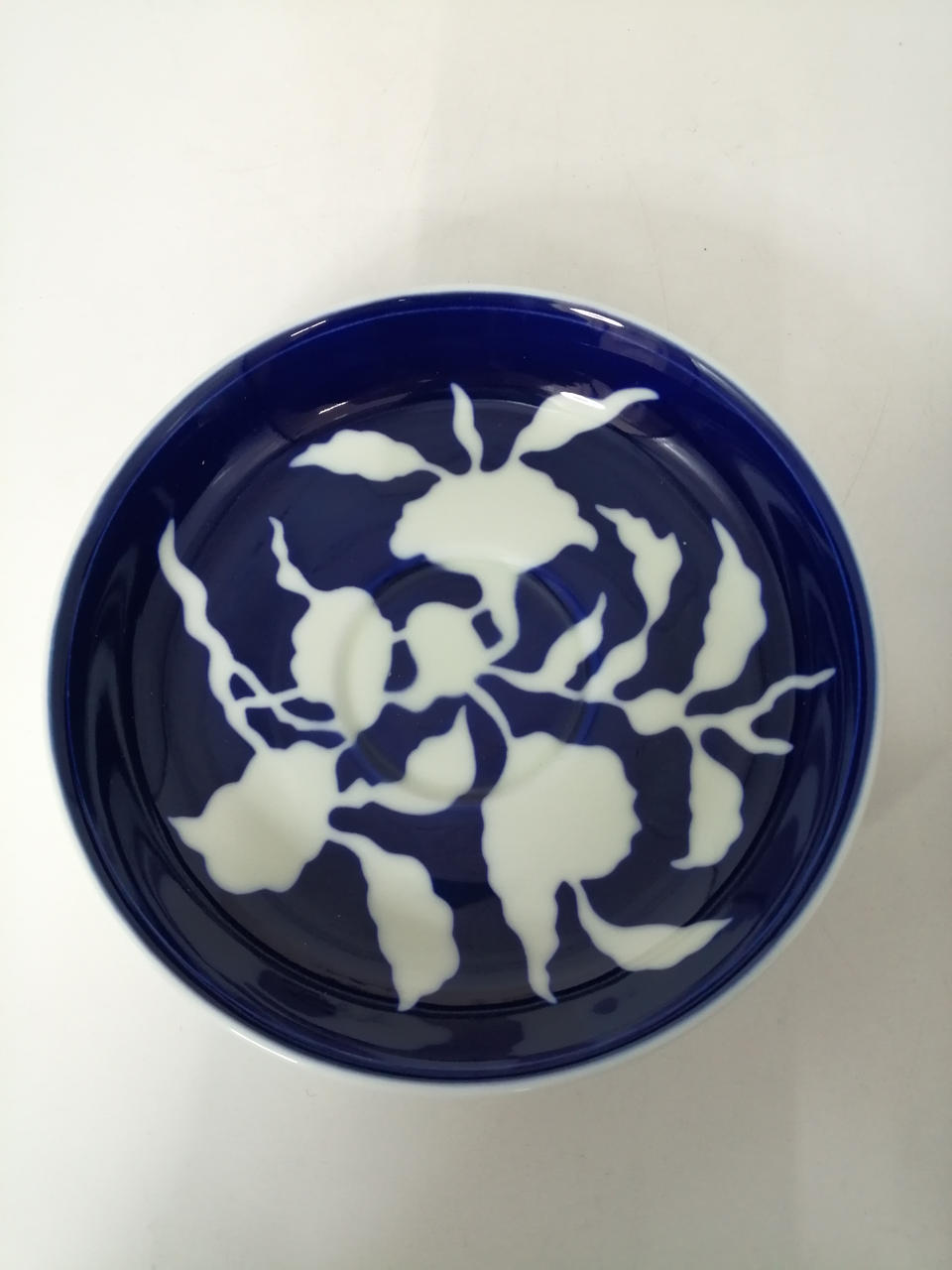 深みのある瑠璃地に、白抜きで花と葉をつけたざくろの折枝を表現してあります |