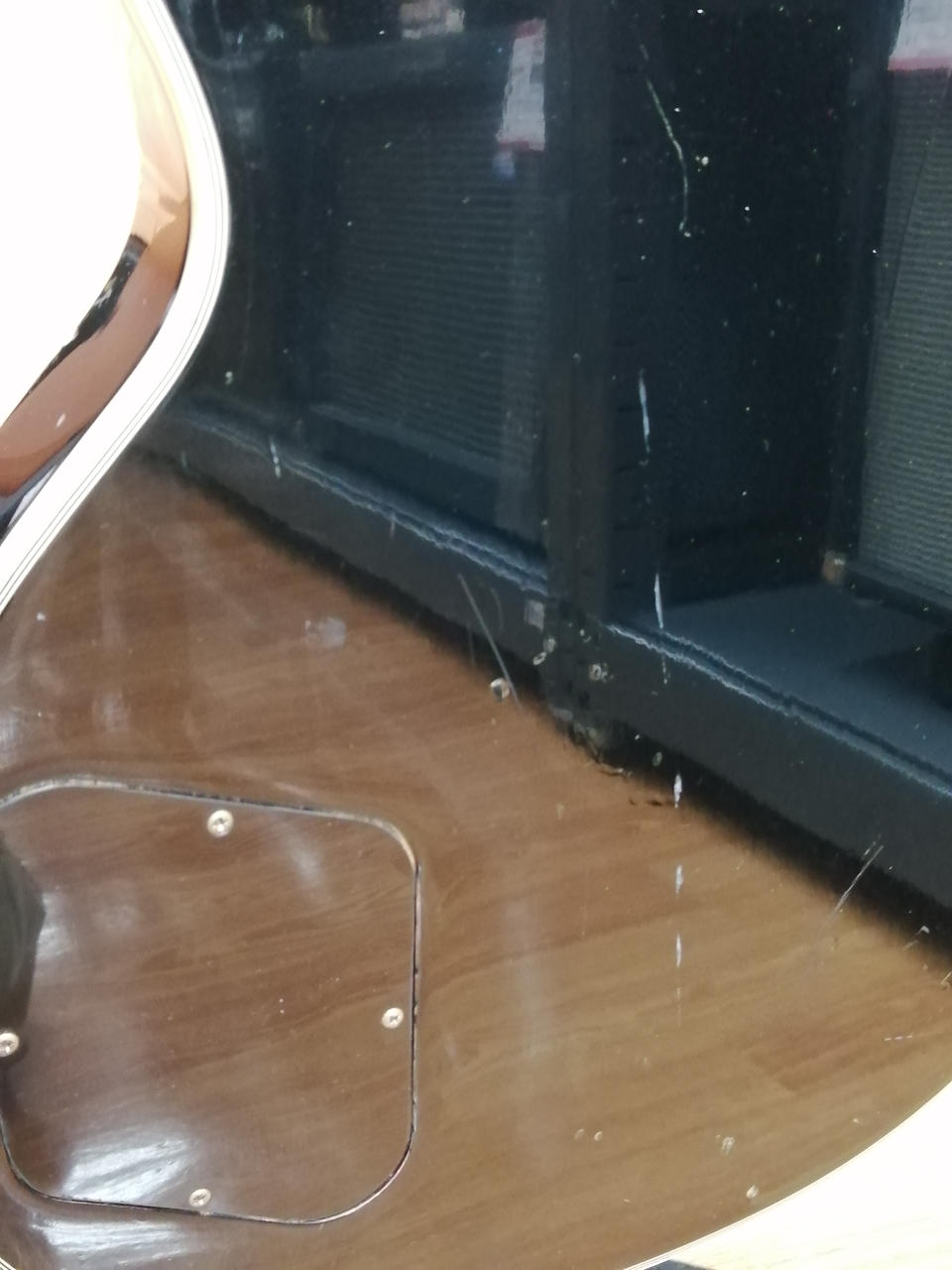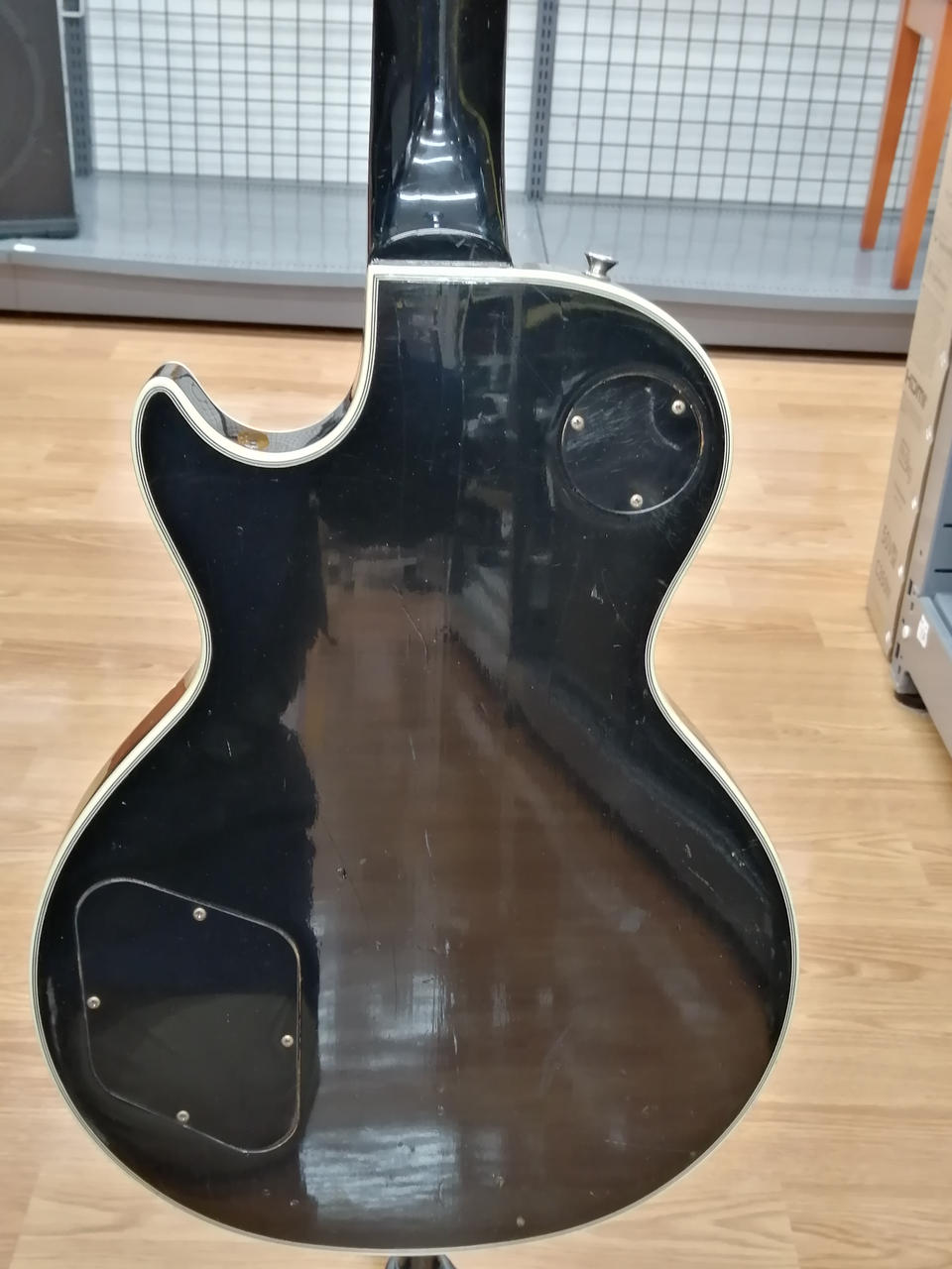 グレコのエレキギター80年代ジャパンビンテージ。レスポール・カスタムタイプ。背面のキズ、その他使用感つよいです。ピックアップカバー欠品。トラスロッド半周程度余裕あり。社外ソフトケース付属します。 |