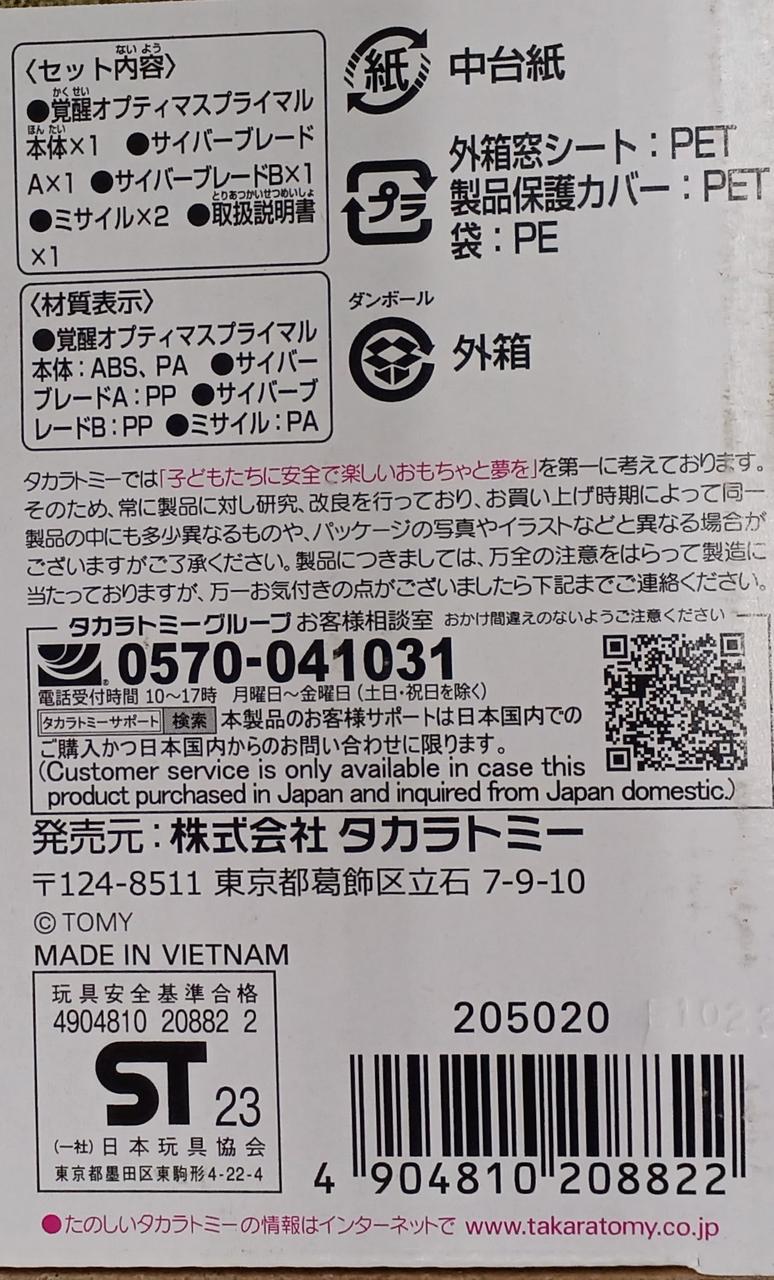 覚醒オプティマスプライマル本体(1),サイバーブレードA(1),サイバーブレードB(1),ミサイル(2),取扱説明書(1) |