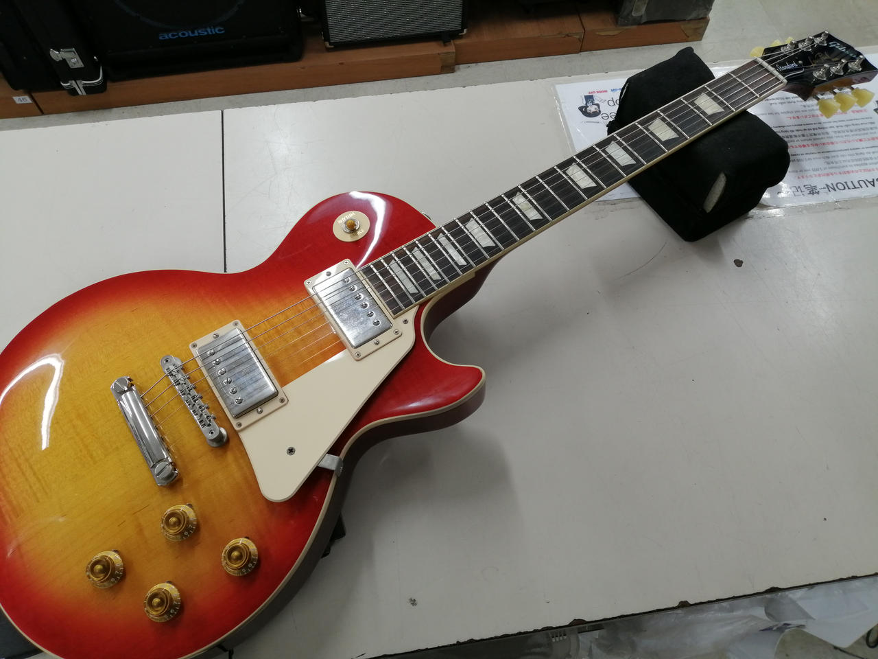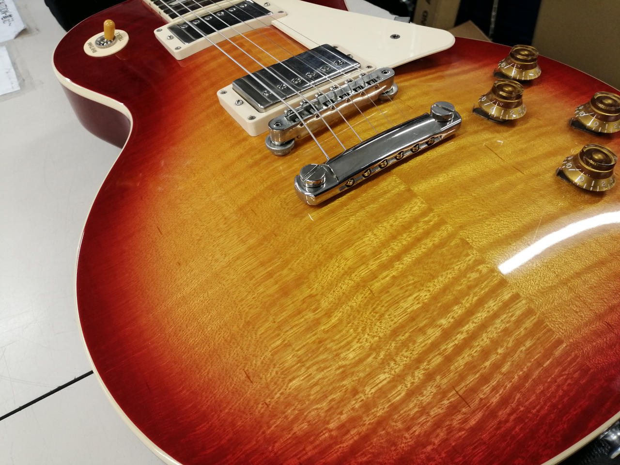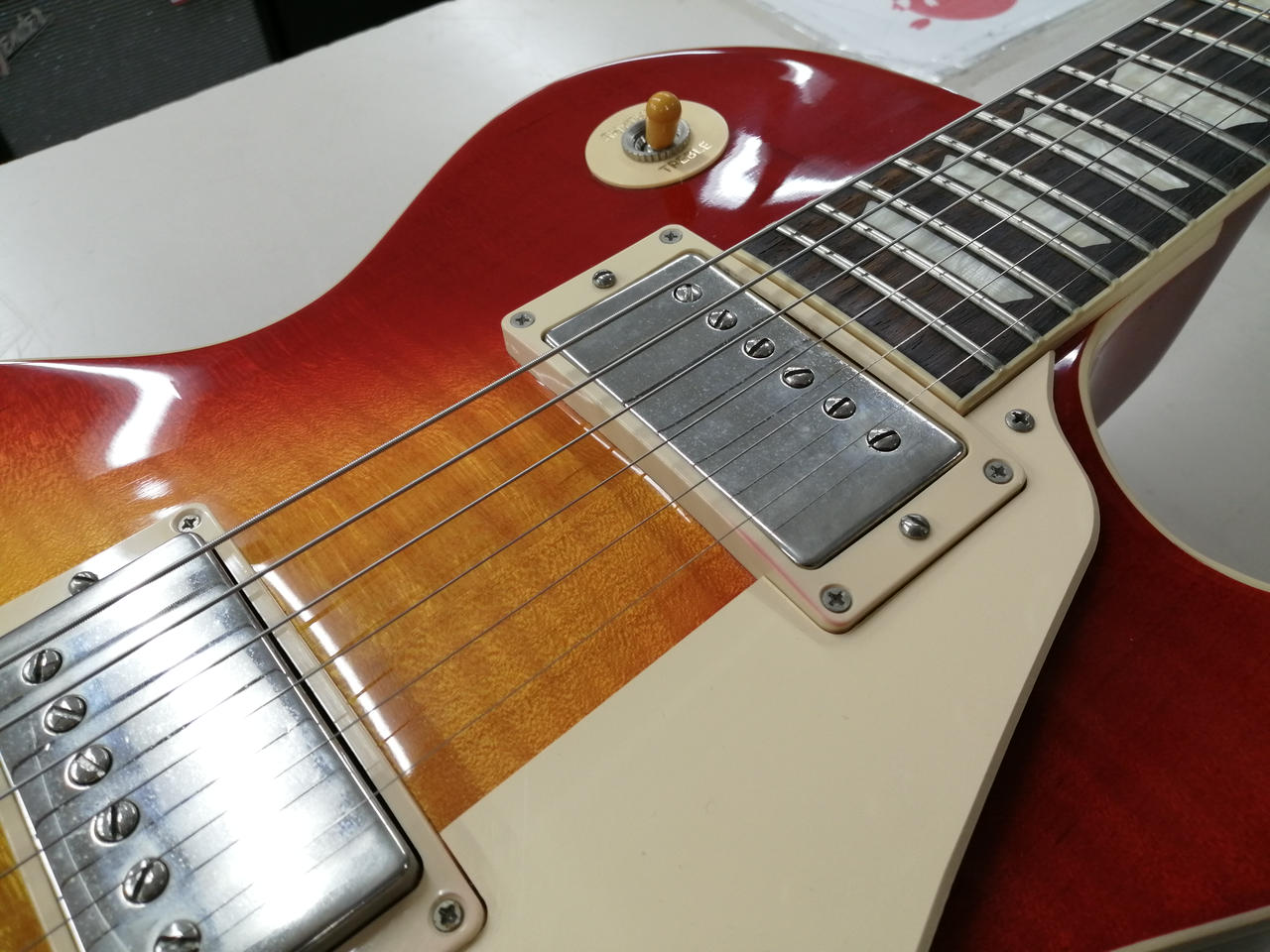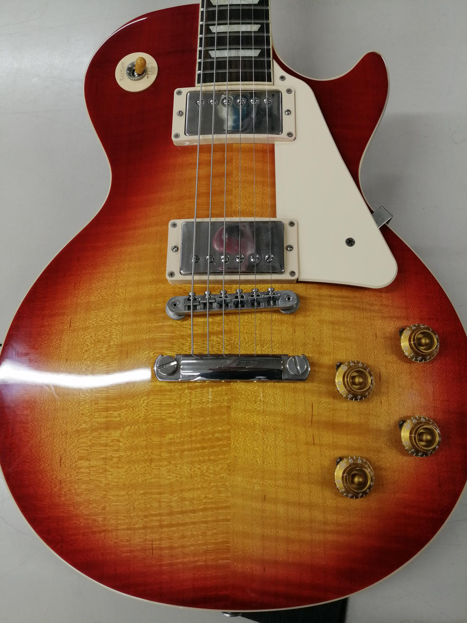王道中の王道、Gibson Les Paul Standard!こちらは50年代仕様になります。しっかり握りこむ太めのネックにGibsonと言えばのクルーソンペグ、鮮やかなチェリーサンバーストが目を惹きます。ピックアップはBURST BUCKER1、2がそれぞれ搭載、程よい出力とビンテージライクのサウンドでクリーンからドライブまで多彩に対応できます。2022年モデルは「Figured」ではありませんが、それでもなかなかに杢も出た個体ではないでしょうか。 |