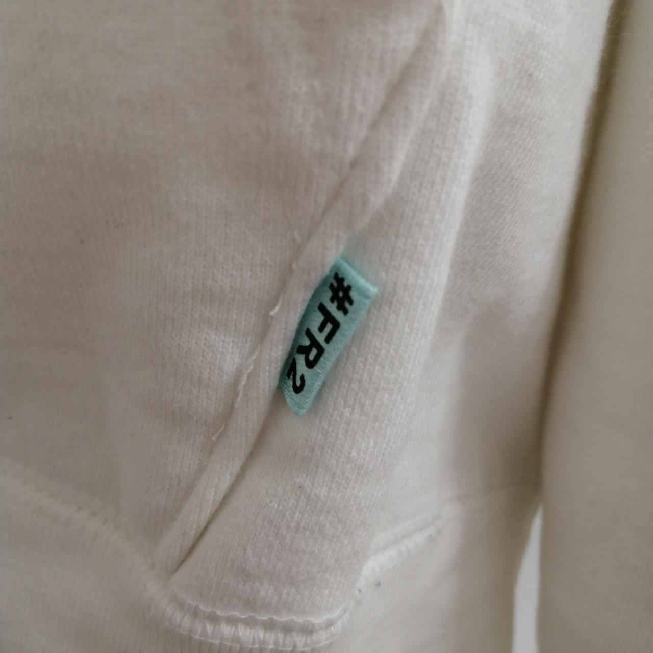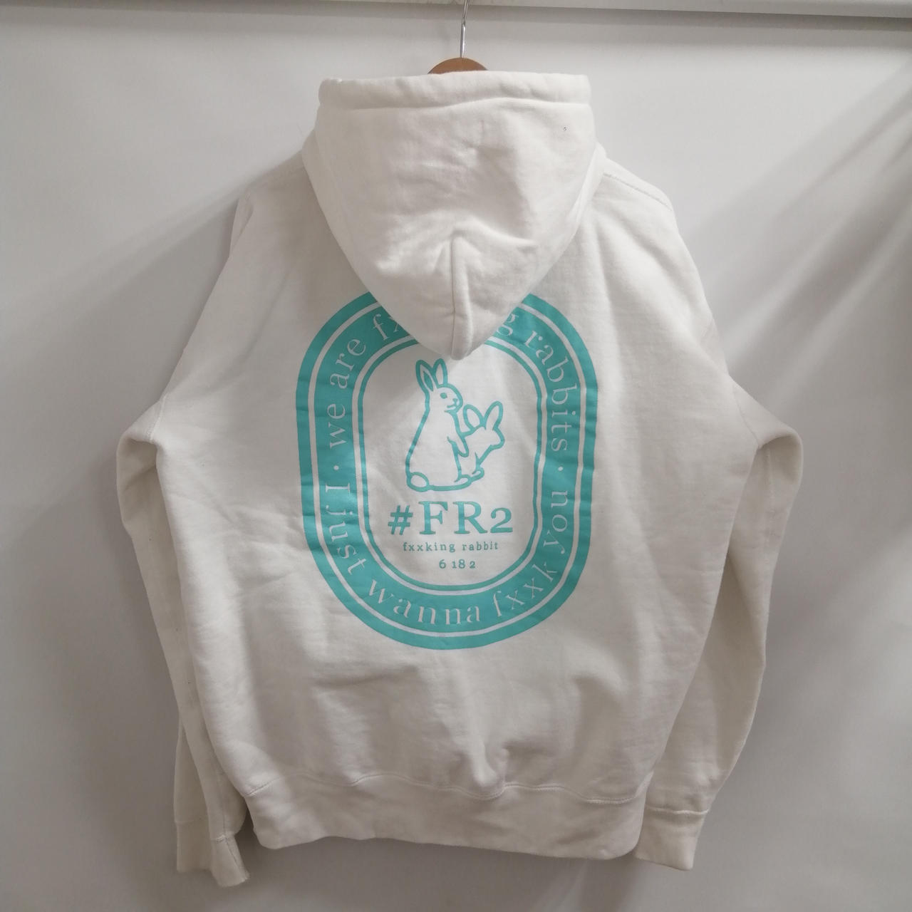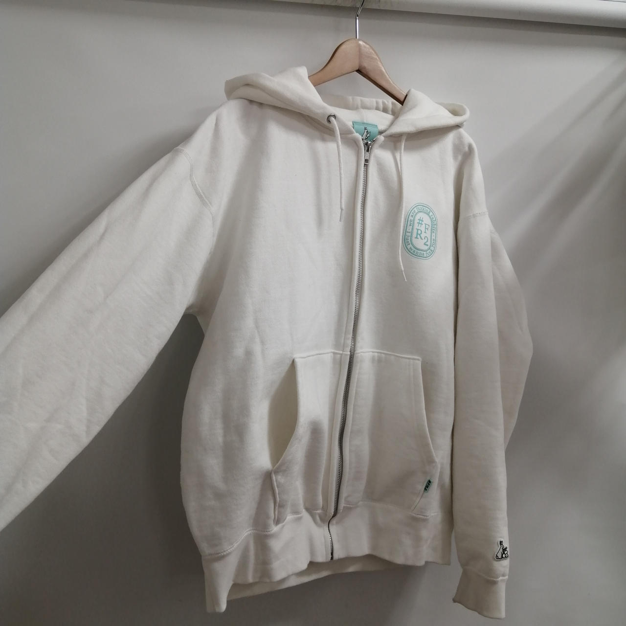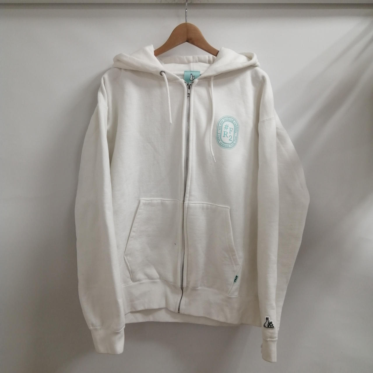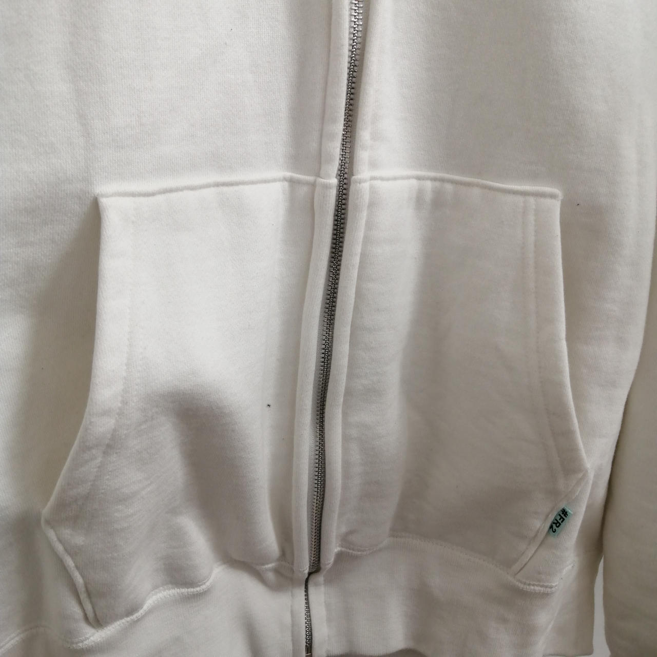 #FR2 フルジップパーカー ホワイト L 全体的に着用感のあるお品物です。フロントポケット近くに小さなシミがございます。あくまでも中古品ですので画像をよくご参照ください。また店頭にて展示販売しておりますので状態が変化する場合がございます。あらかじめご了承ください。 |