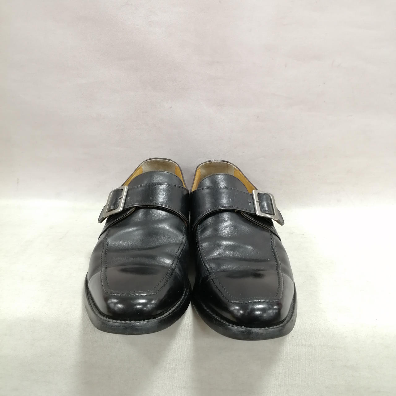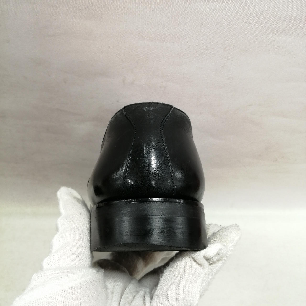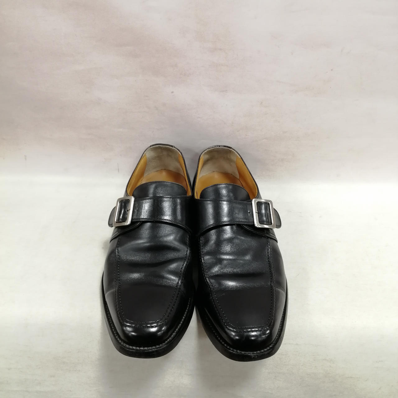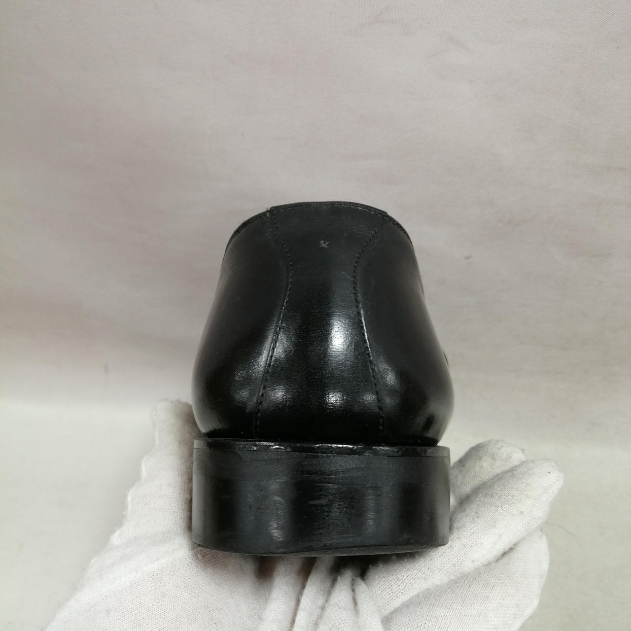 表面に履きジワ、スレがあります。内側に汚れ、履きジワがあります。ソールの減りがあります。かかと部分に小さい穴があります。金具にキズ、汚れがあります。 |