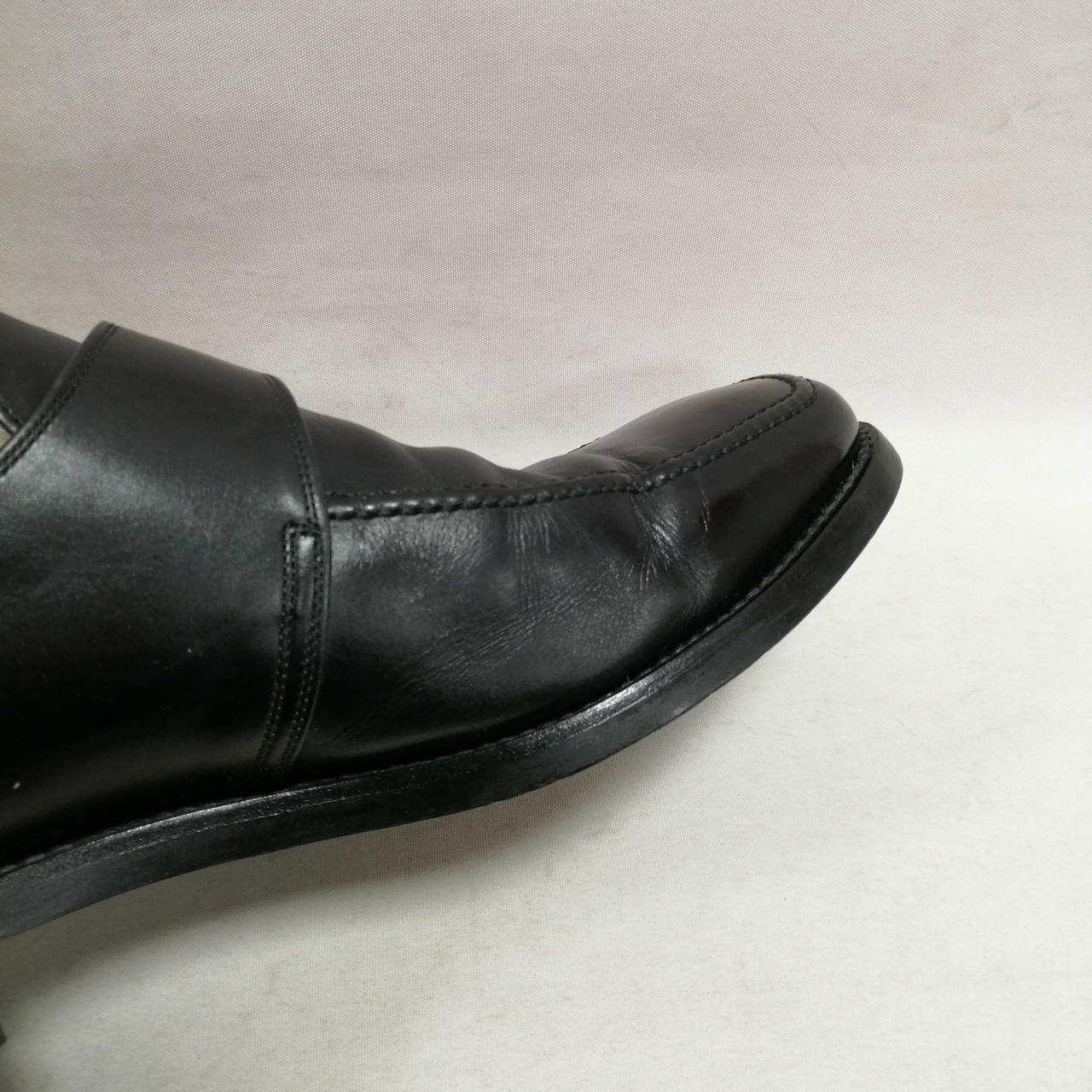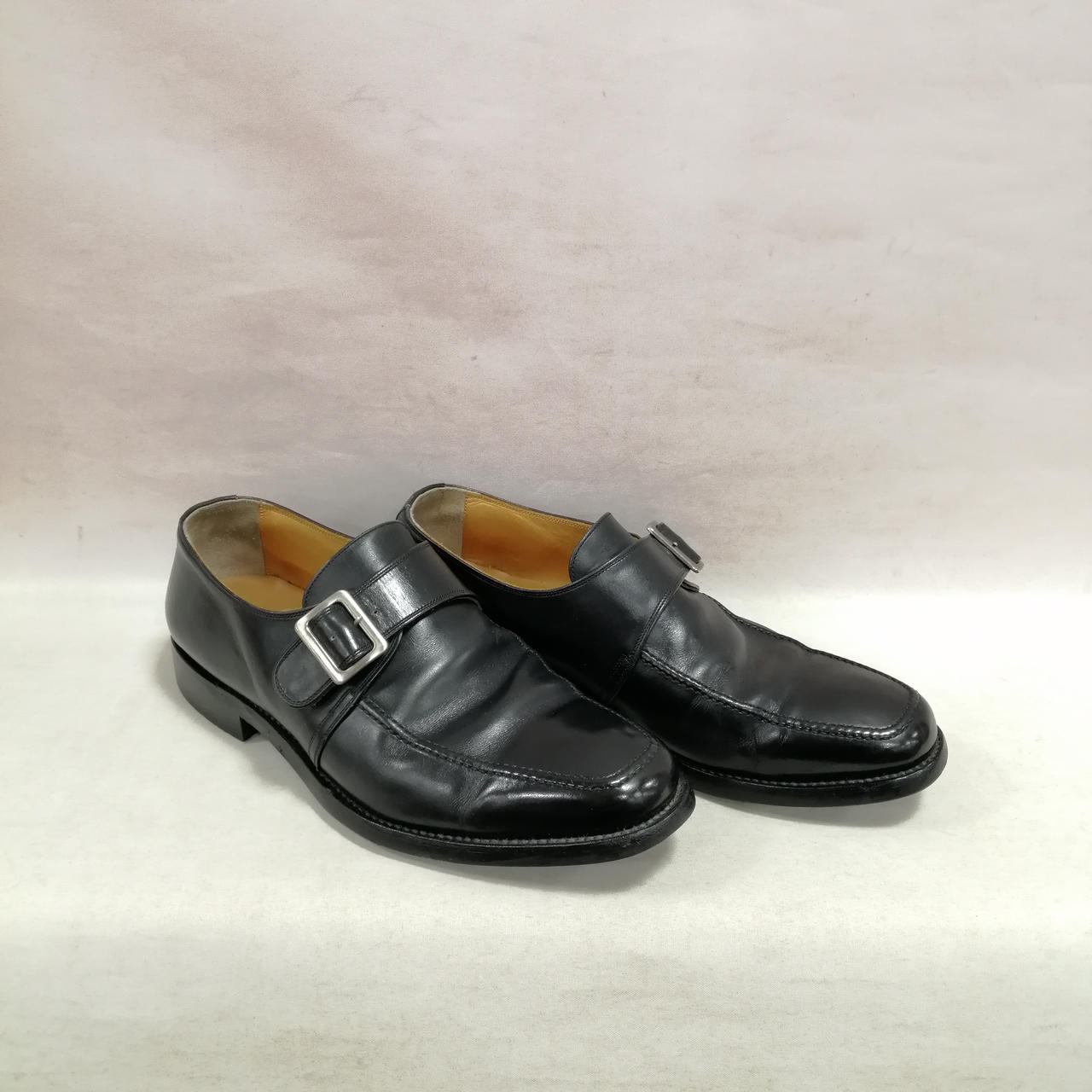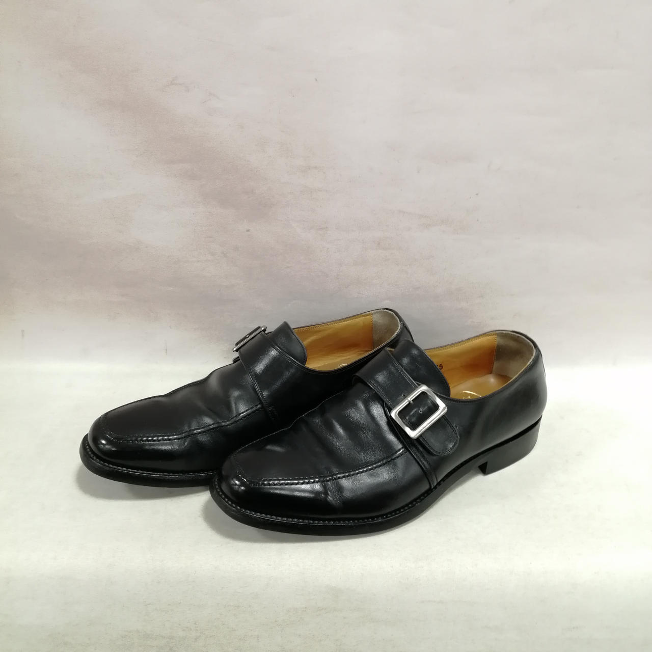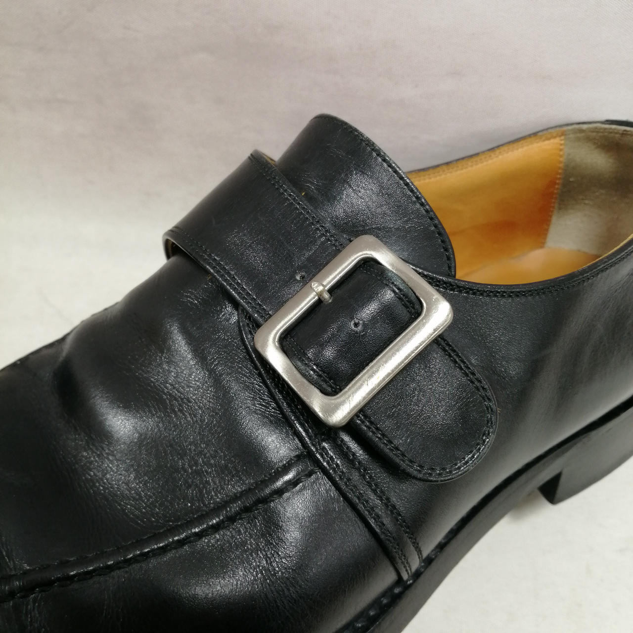 表面に履きジワ、スレがあります。内側に汚れ、履きジワがあります。ソールの減りがあります。かかと部分に小さい穴があります。金具にキズ、汚れがあります。 |