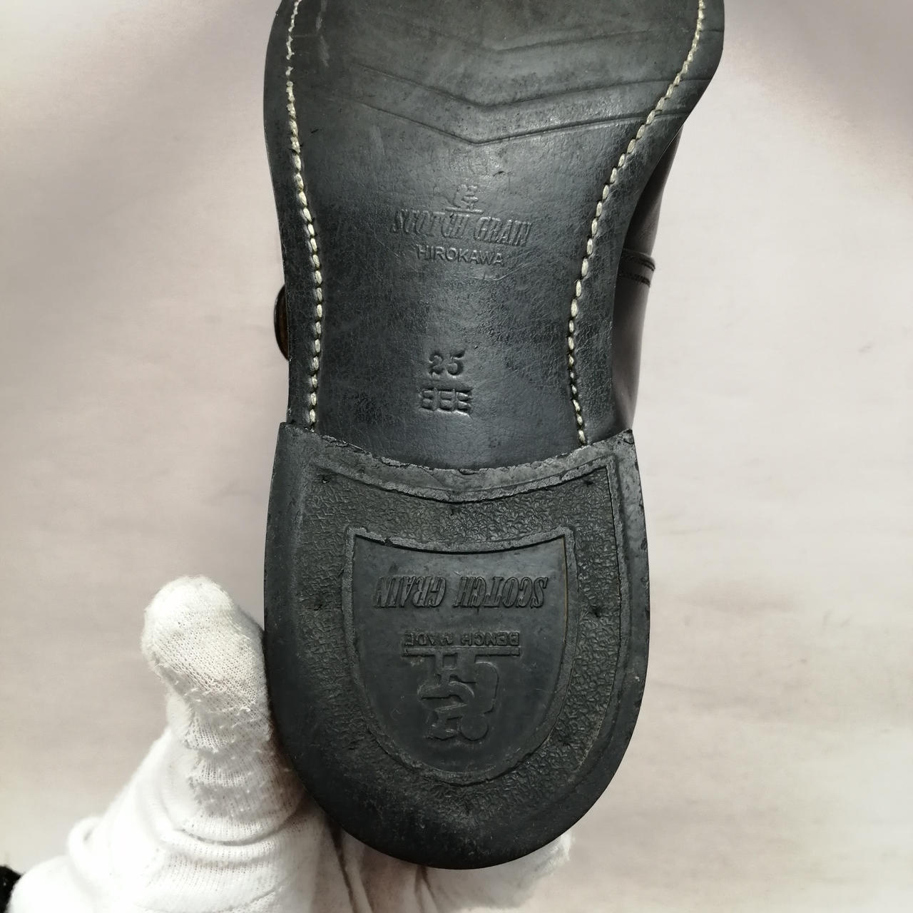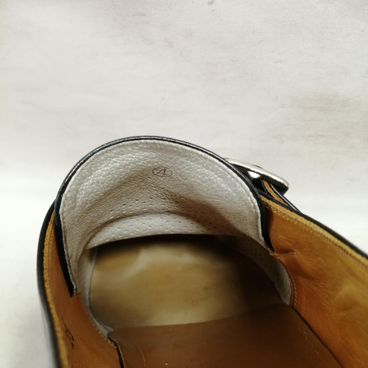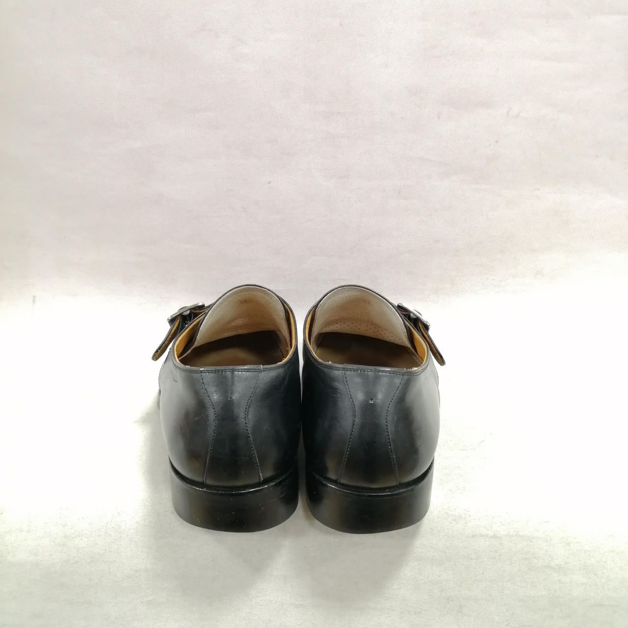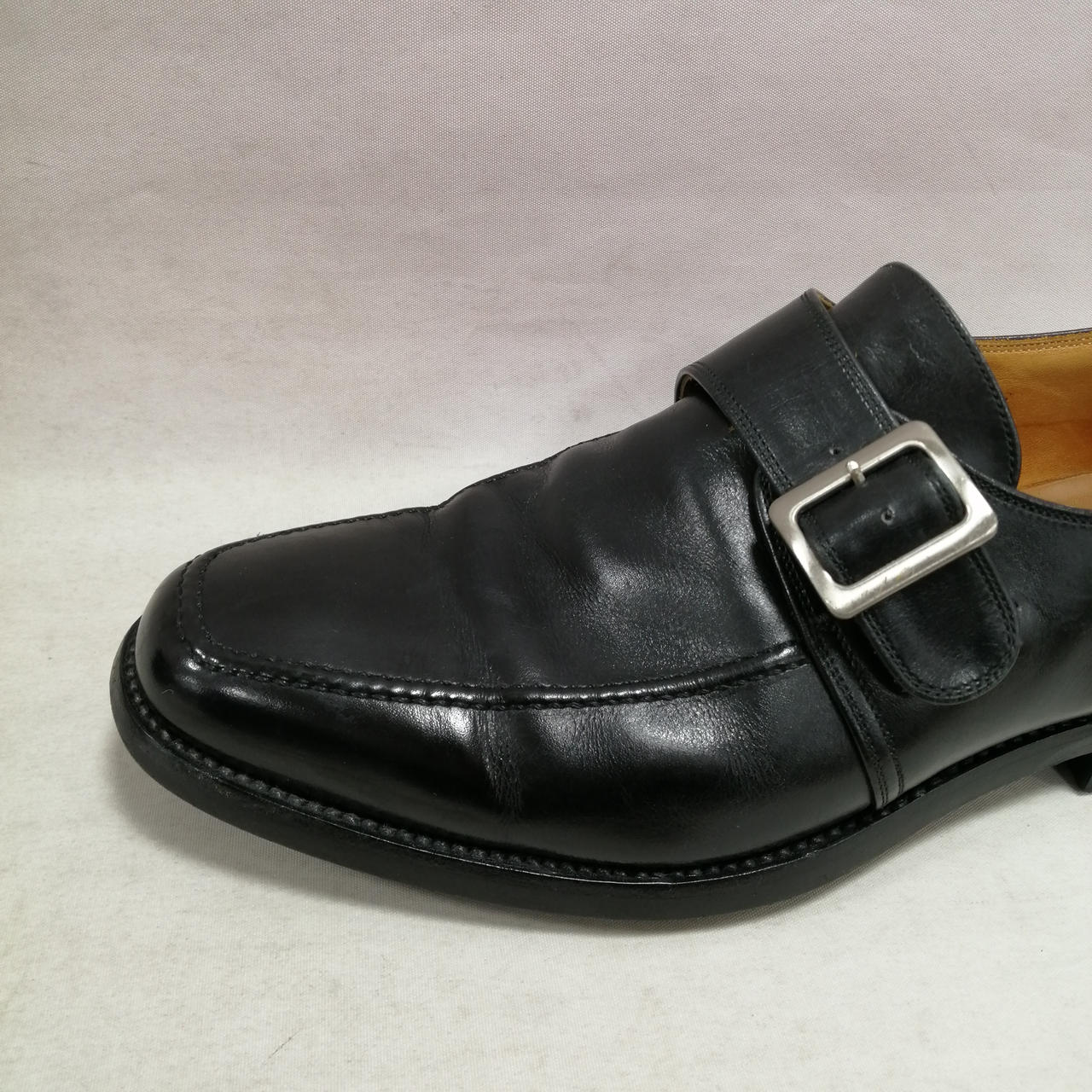 表面に履きジワ、スレがあります。内側に汚れ、履きジワがあります。ソールの減りがあります。かかと部分に小さい穴があります。金具にキズ、汚れがあります。 |