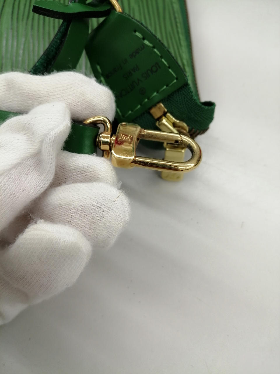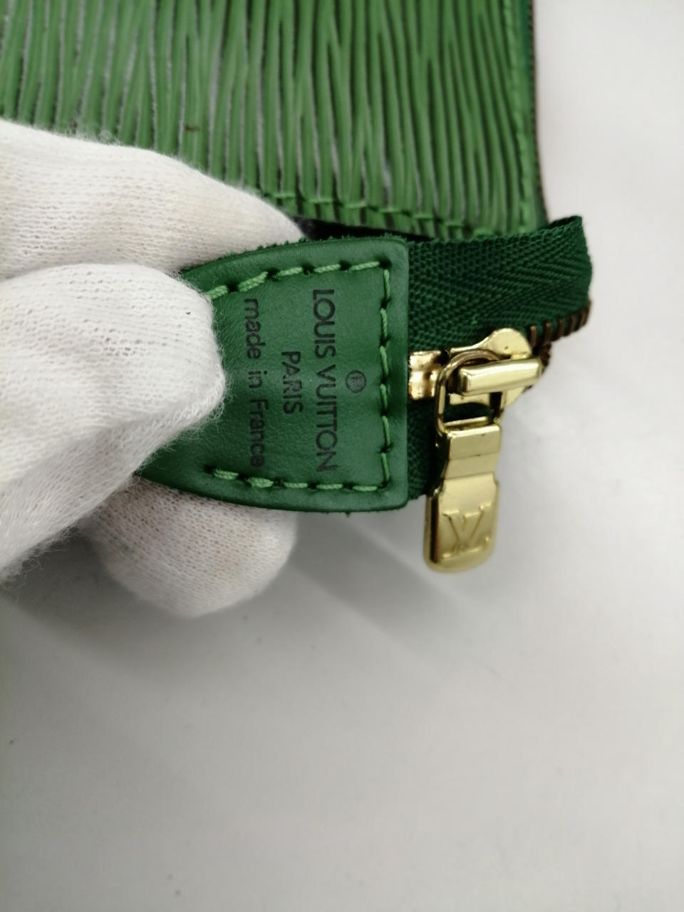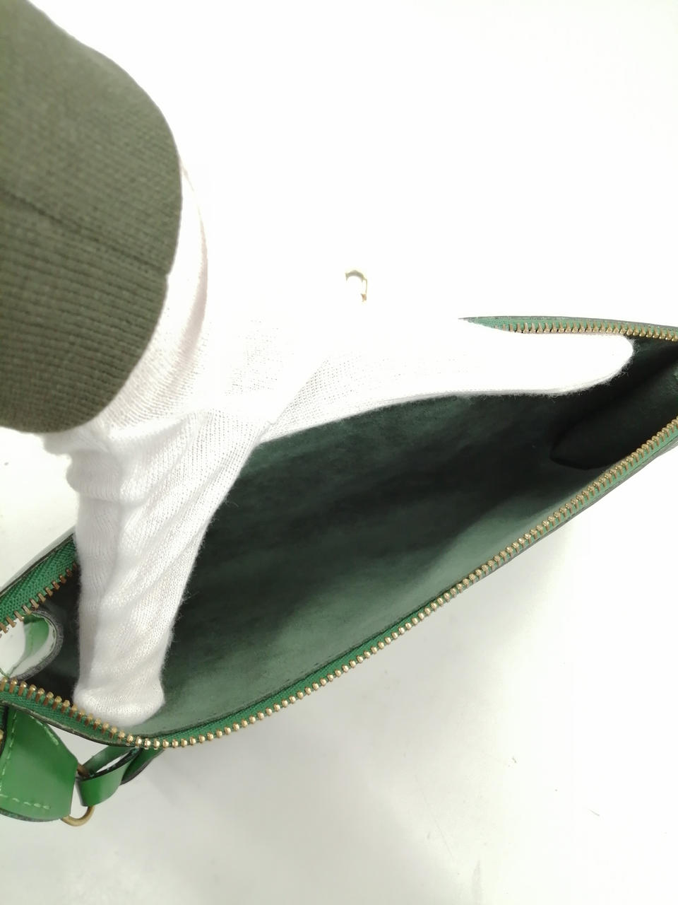 ルイヴィトンのロゴがワンポイントのポシェットです!緑なので目を引くデザインになっています!!