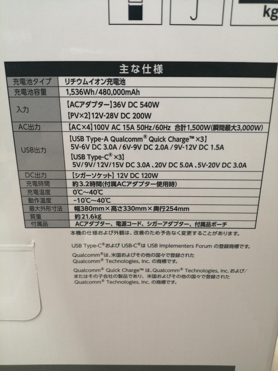 充電池容量 480,000mAh/1,536Wh |