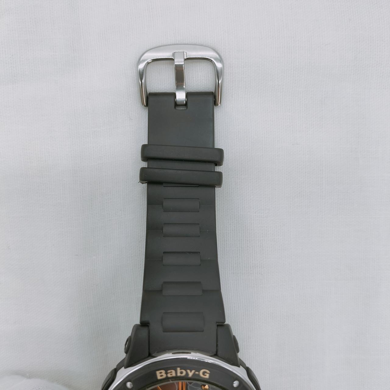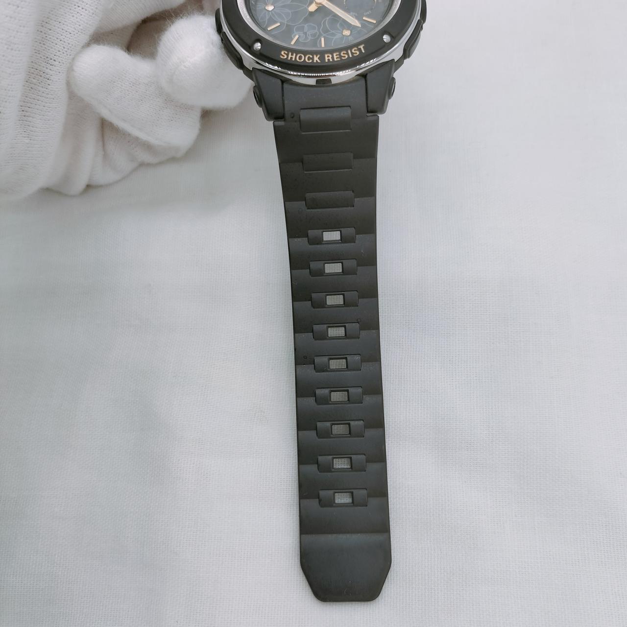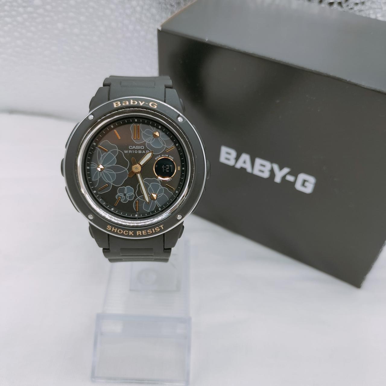 ブラックのベースにシックなフラワー柄の文字盤が華やかなベイビーGの腕時計です。