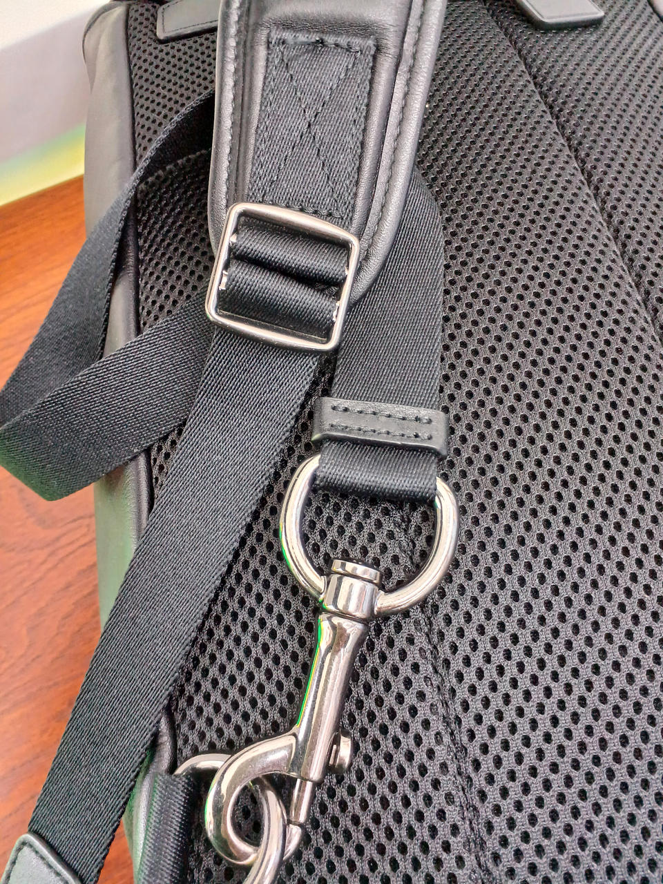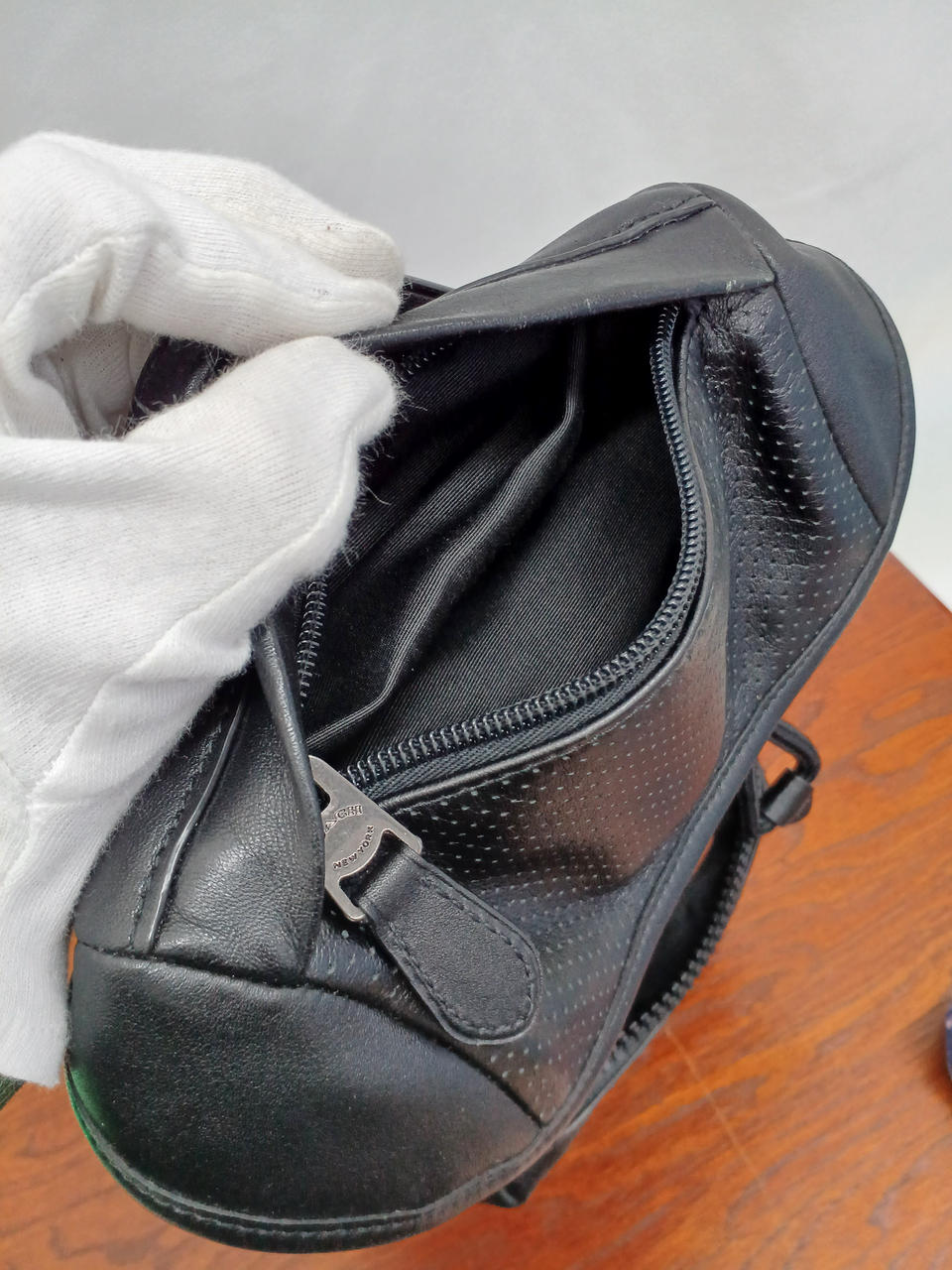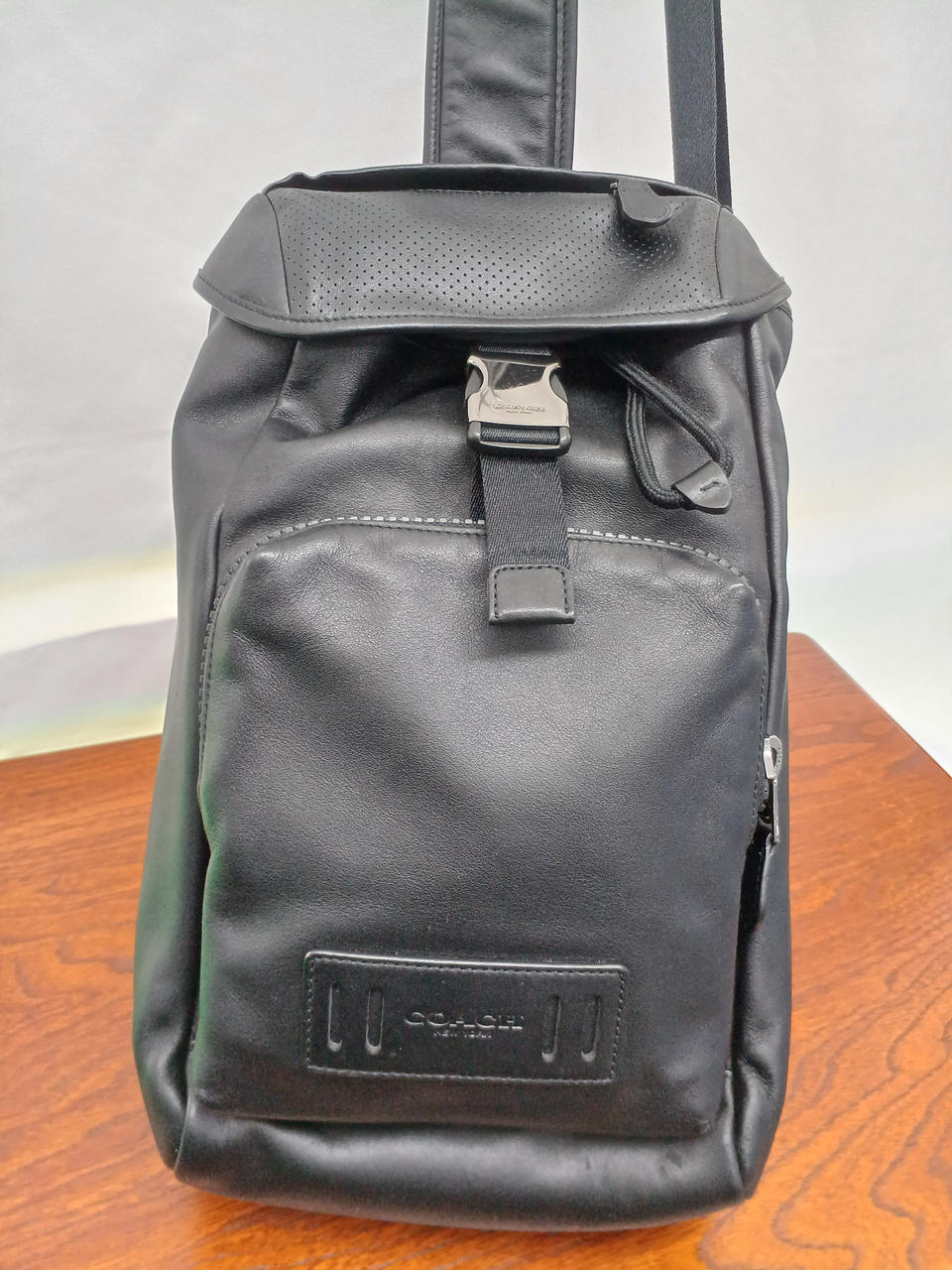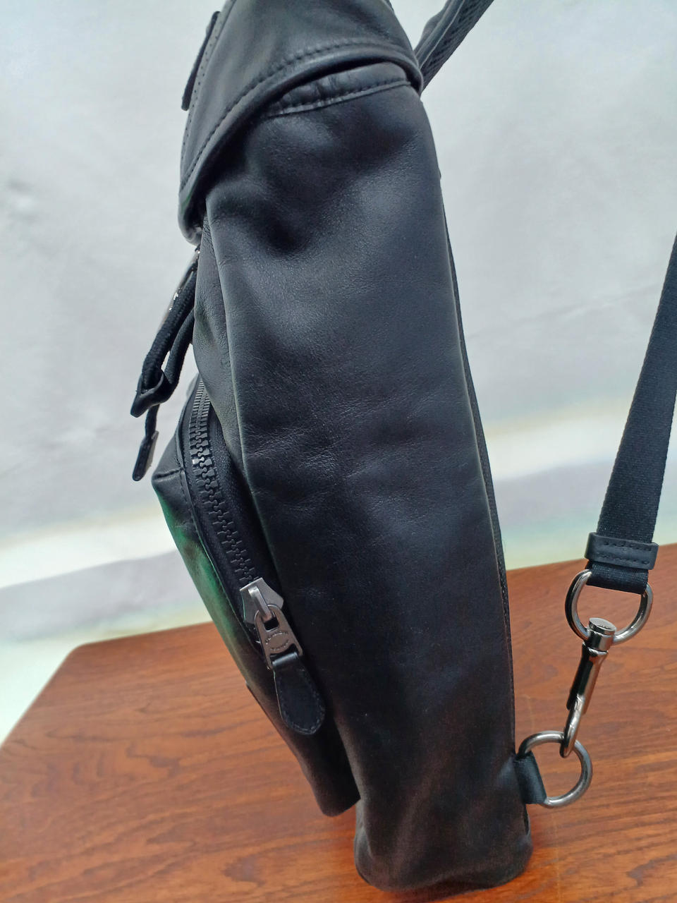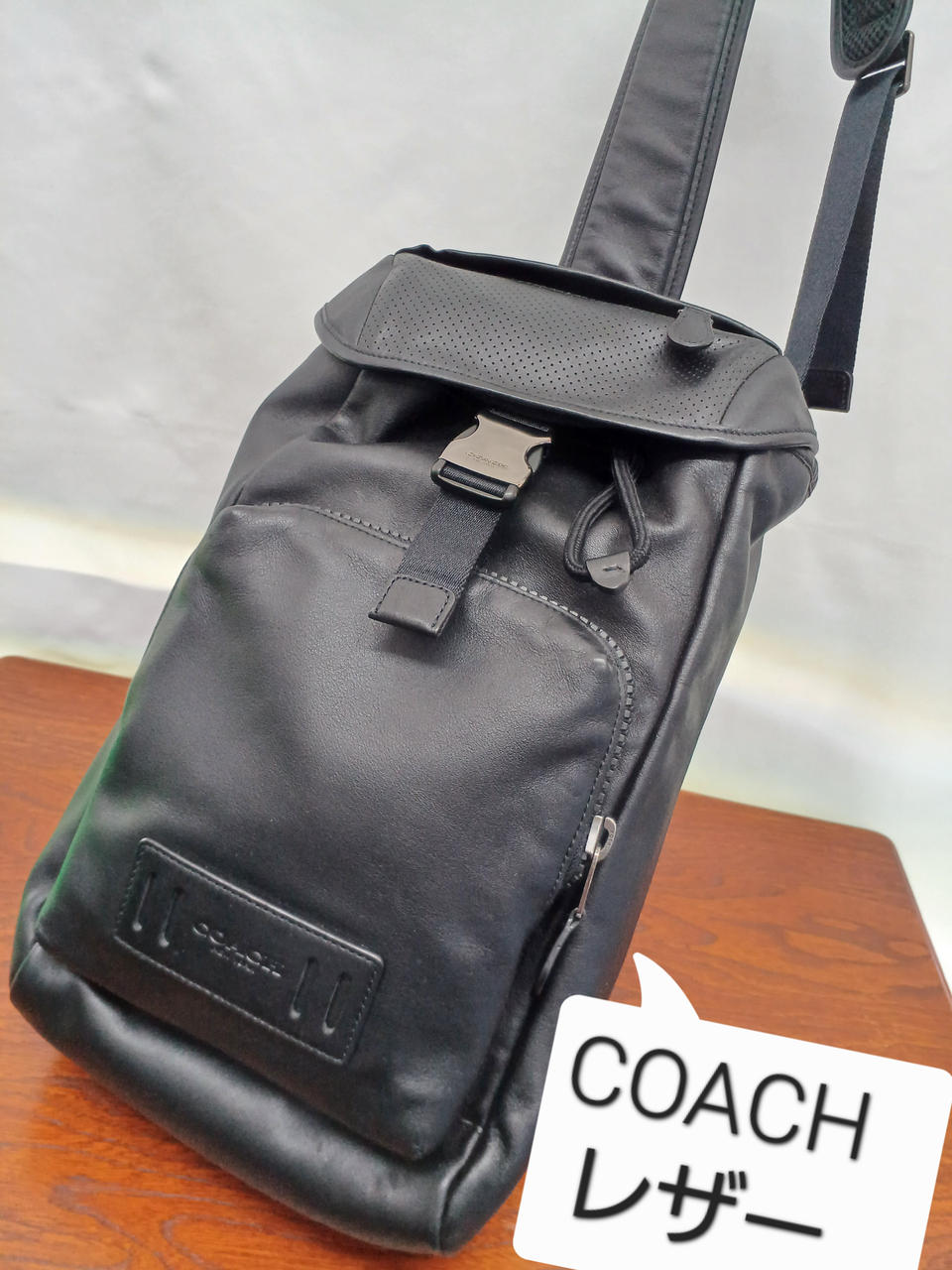 左右どちらにも付け替えできるレザーの斜め掛けバッグ。 |