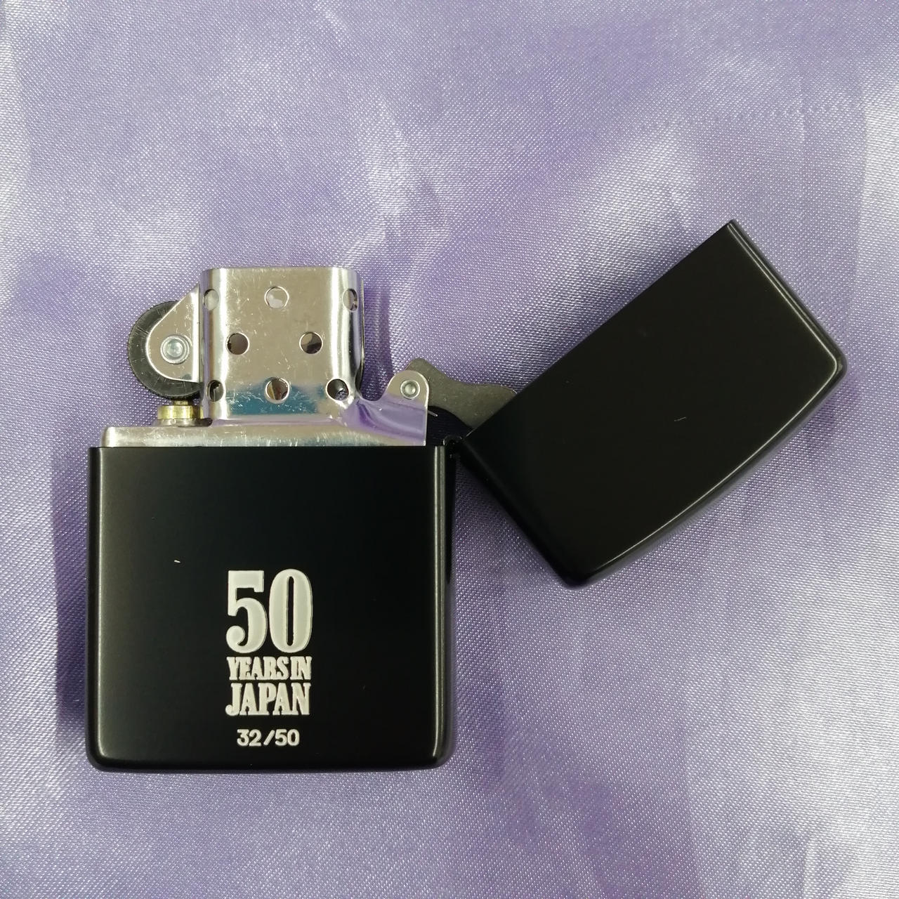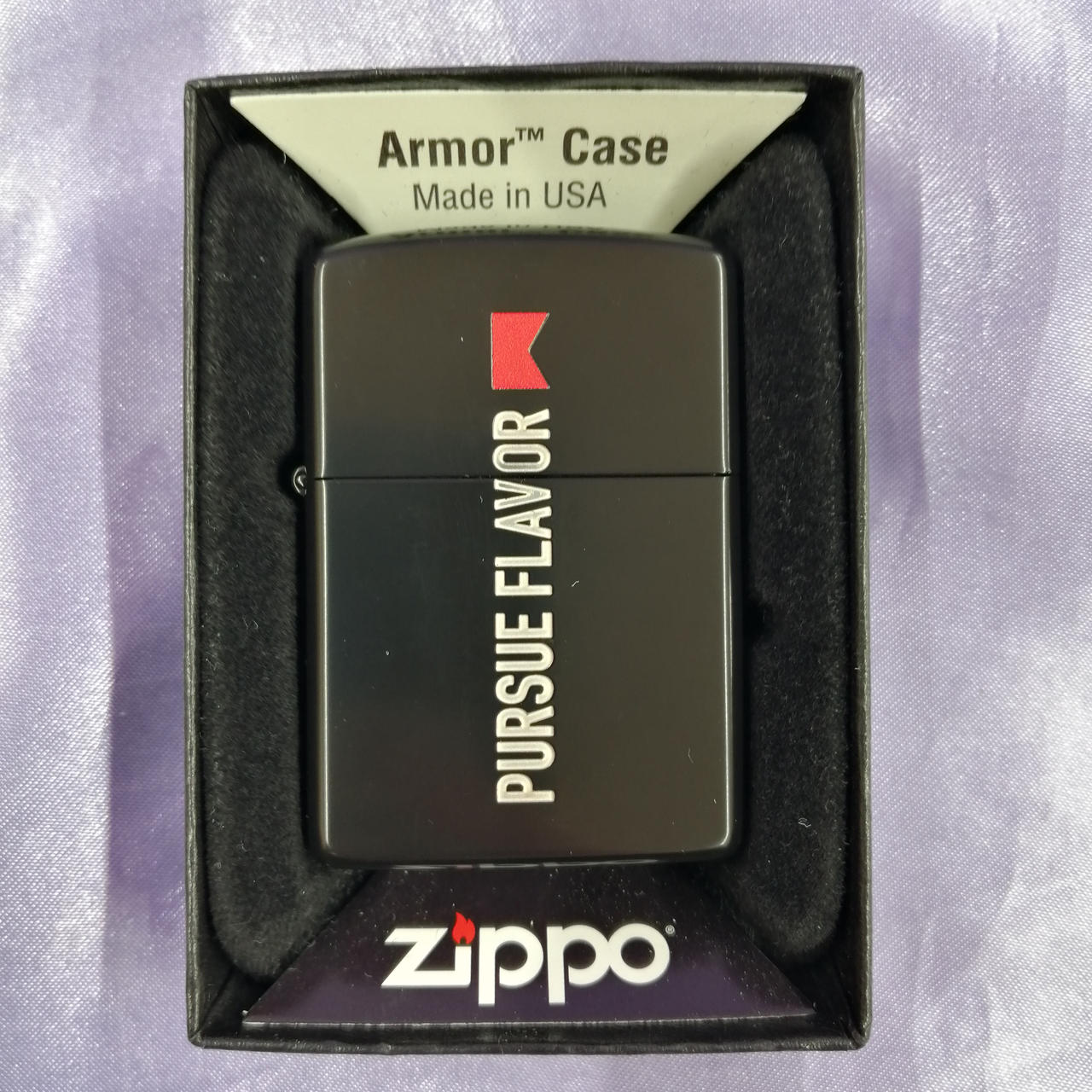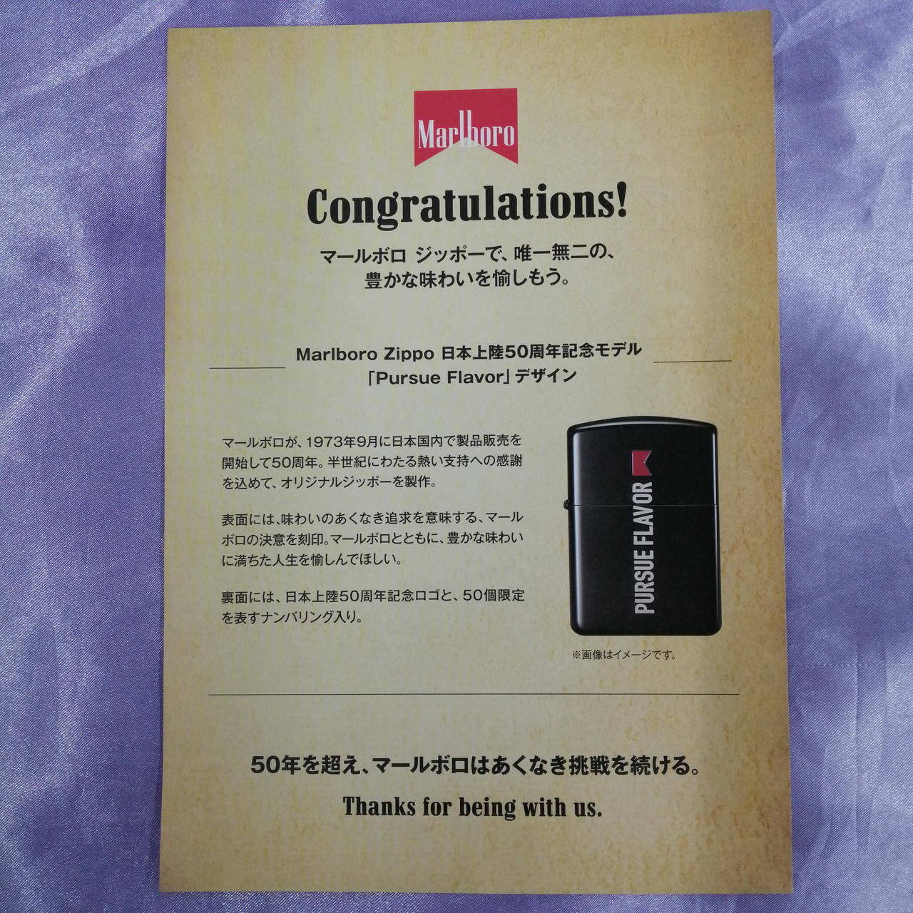 Marlboro Zippo 日本上陸50周年記念モデル 「Pursue Flavor 」デザイン。裏面には50個限定を表すナンバリング入り。(32/50) |