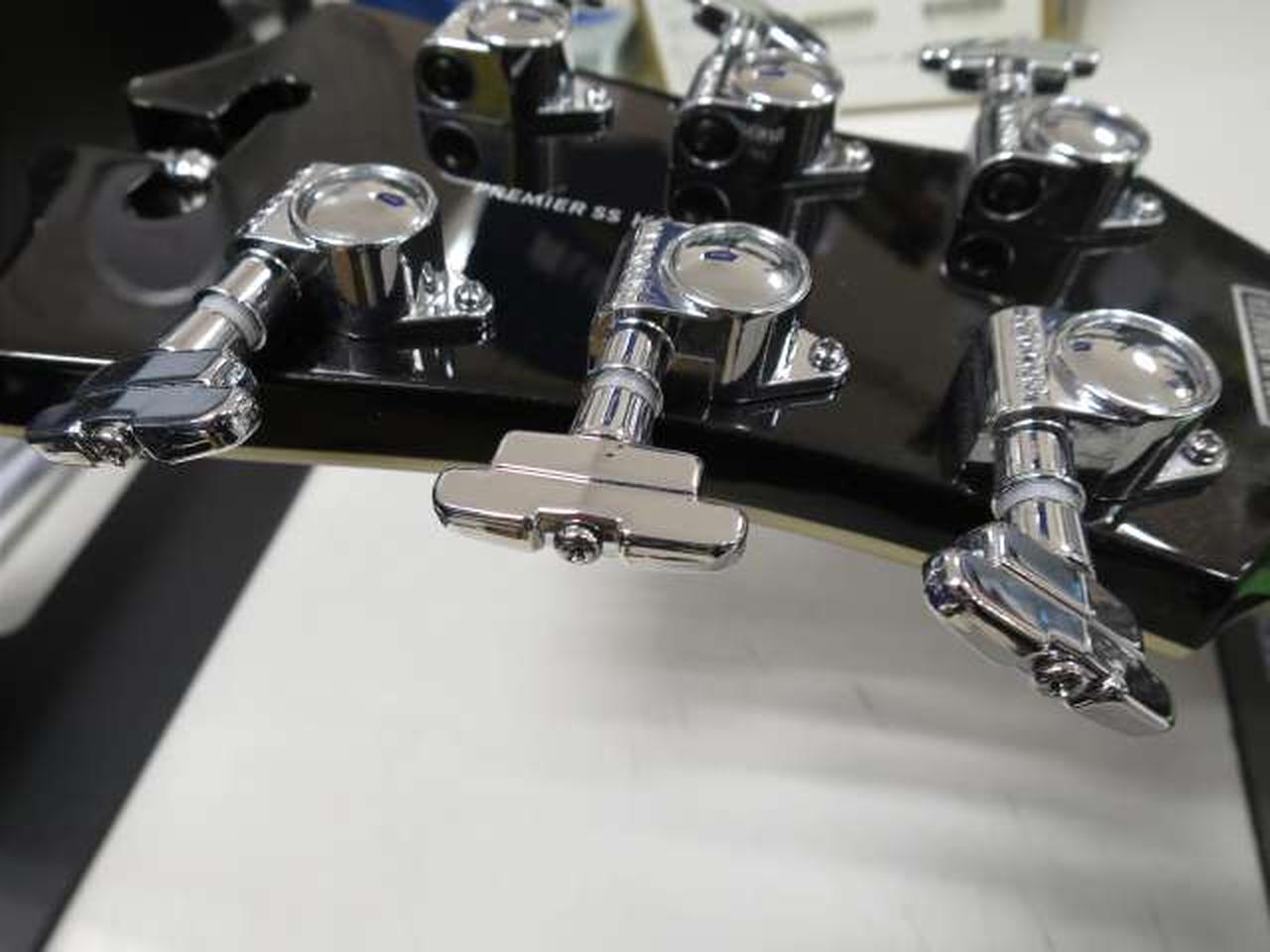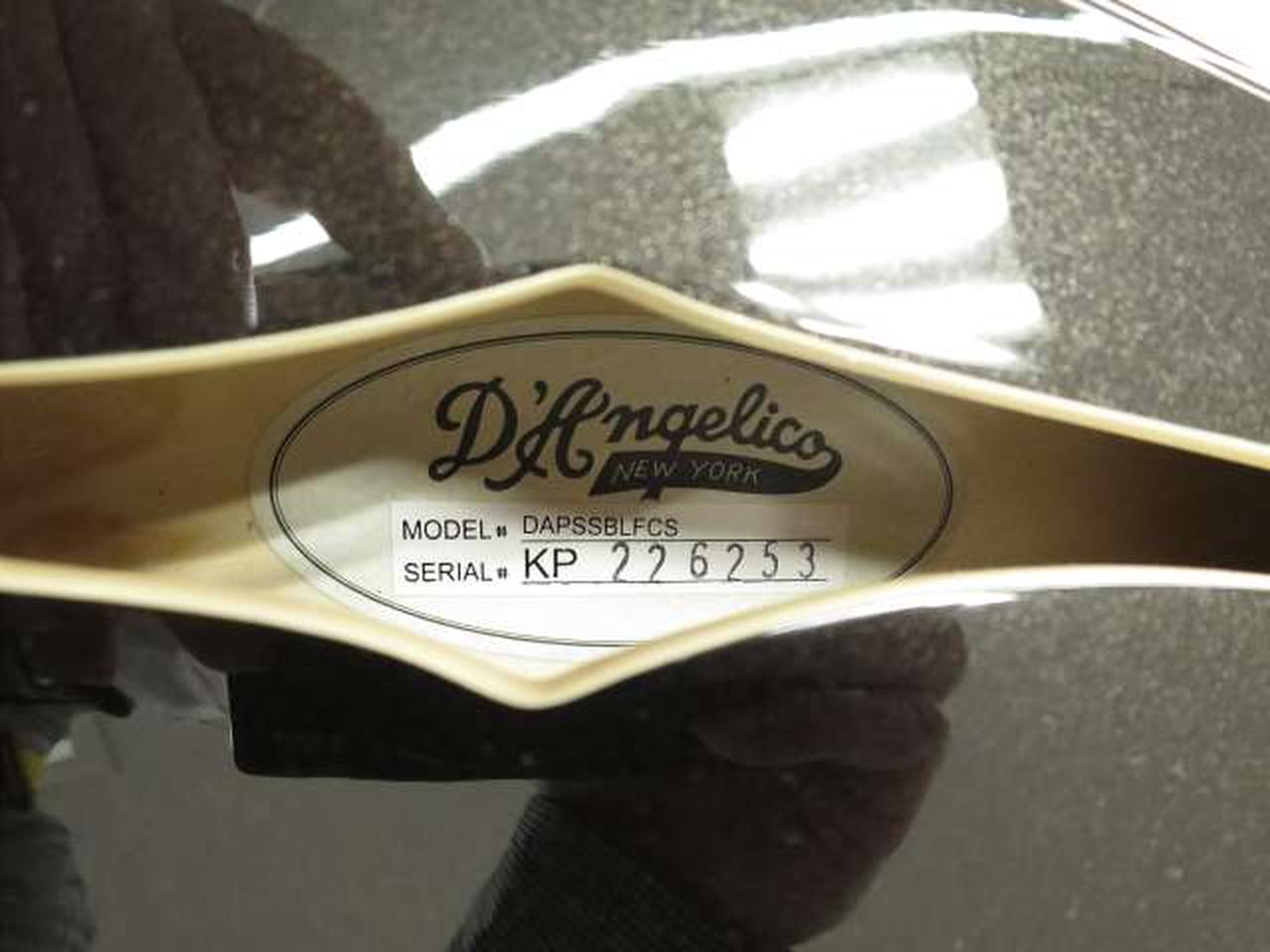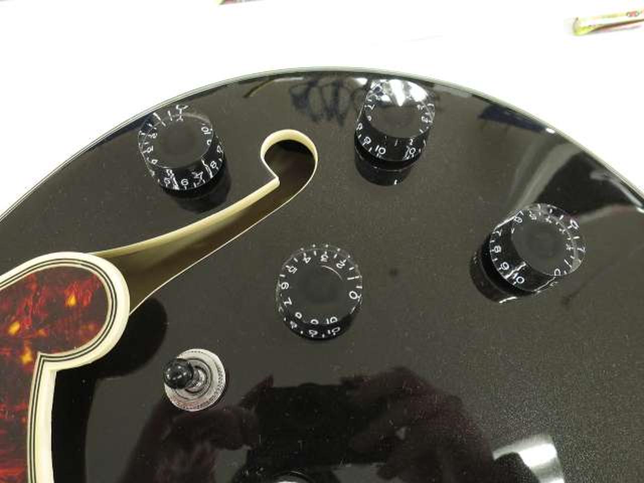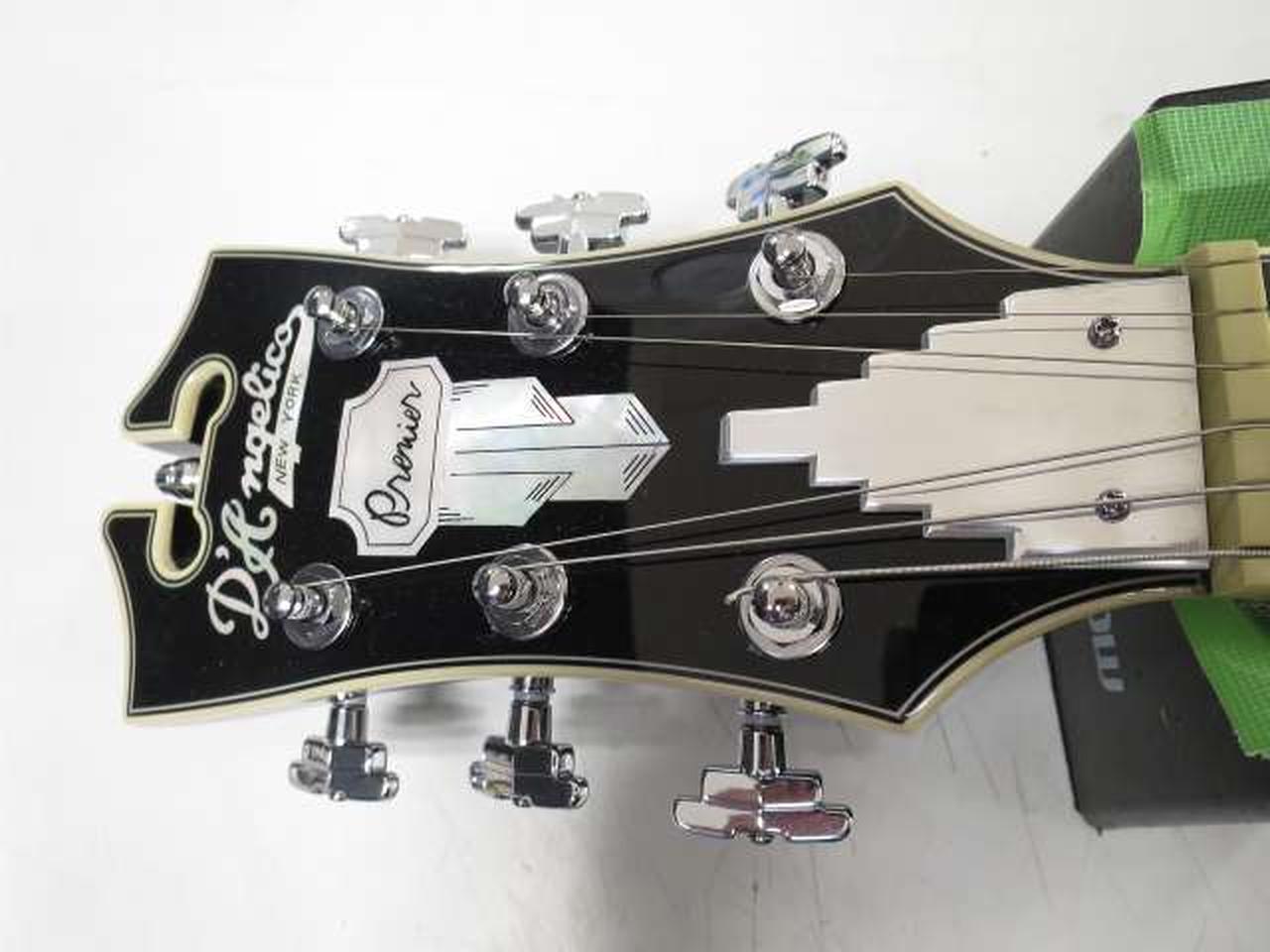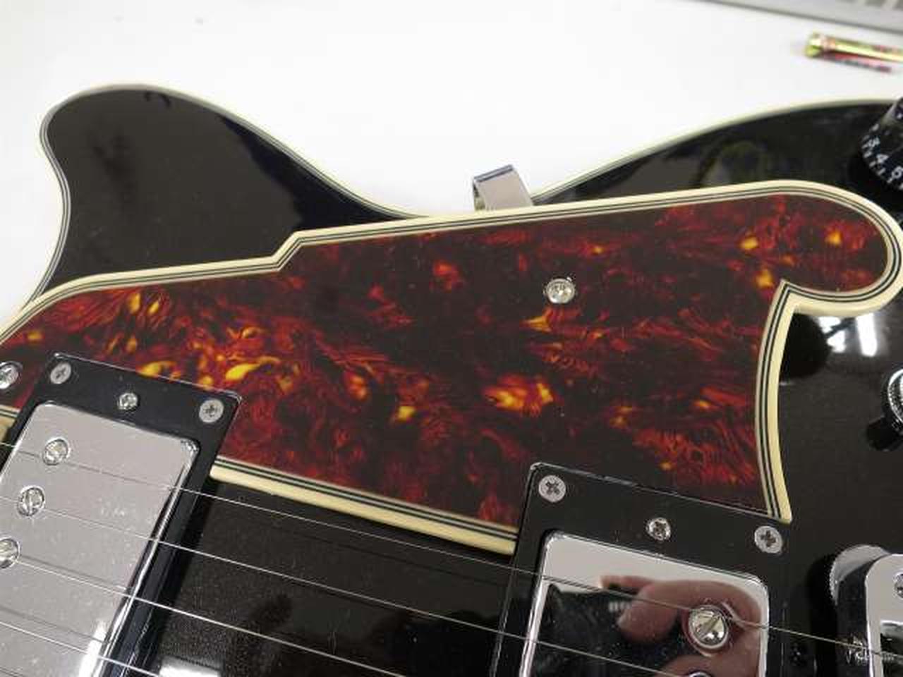 ディアンジェリコらしさを感じるオリジナル形状のピックガードは、5プライのトータス・シェル柄となっています |