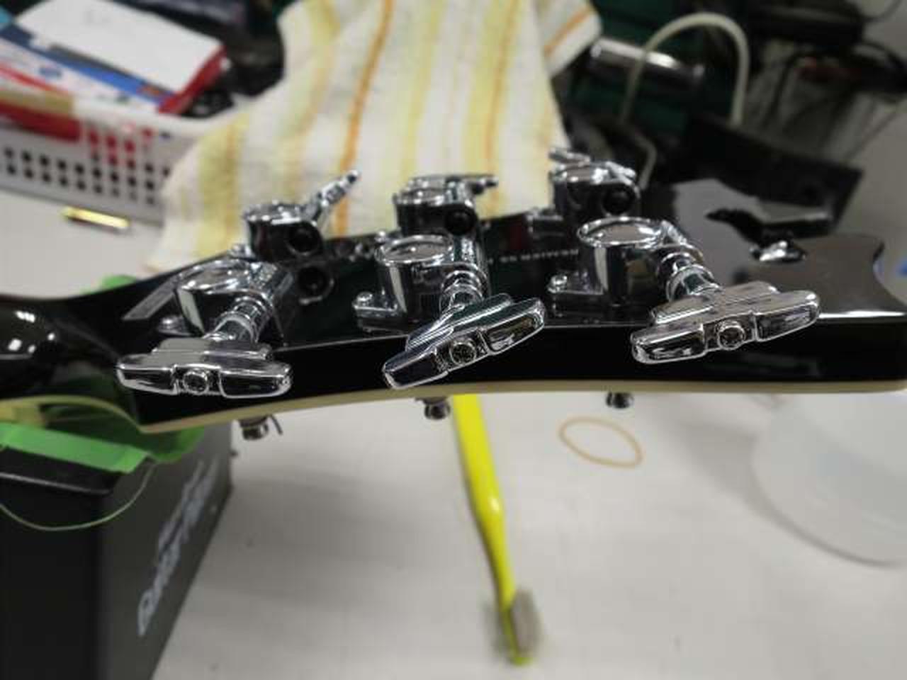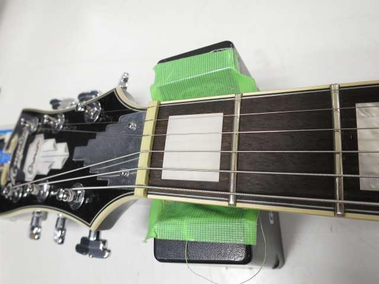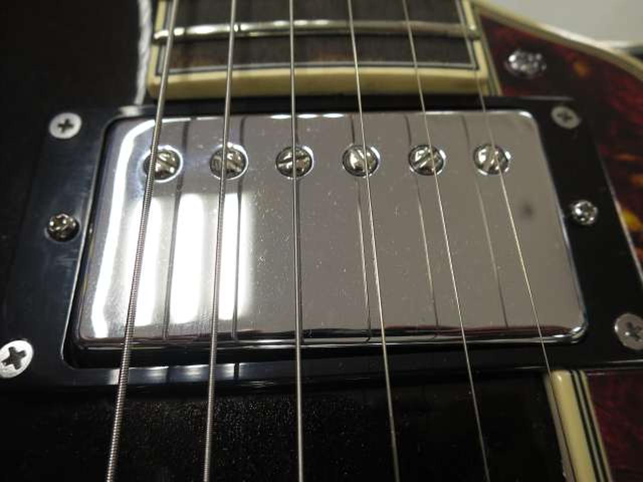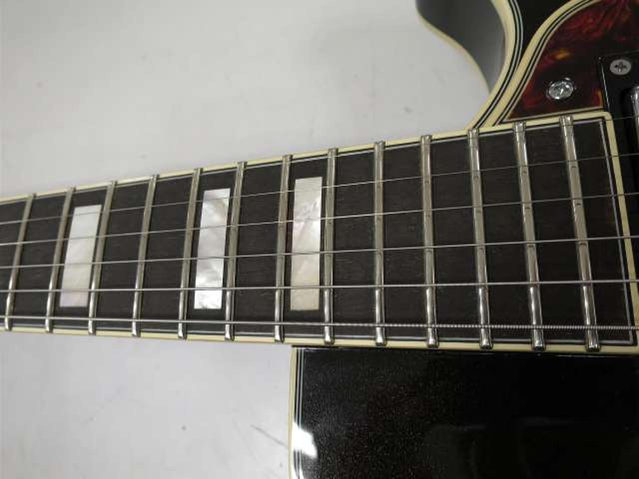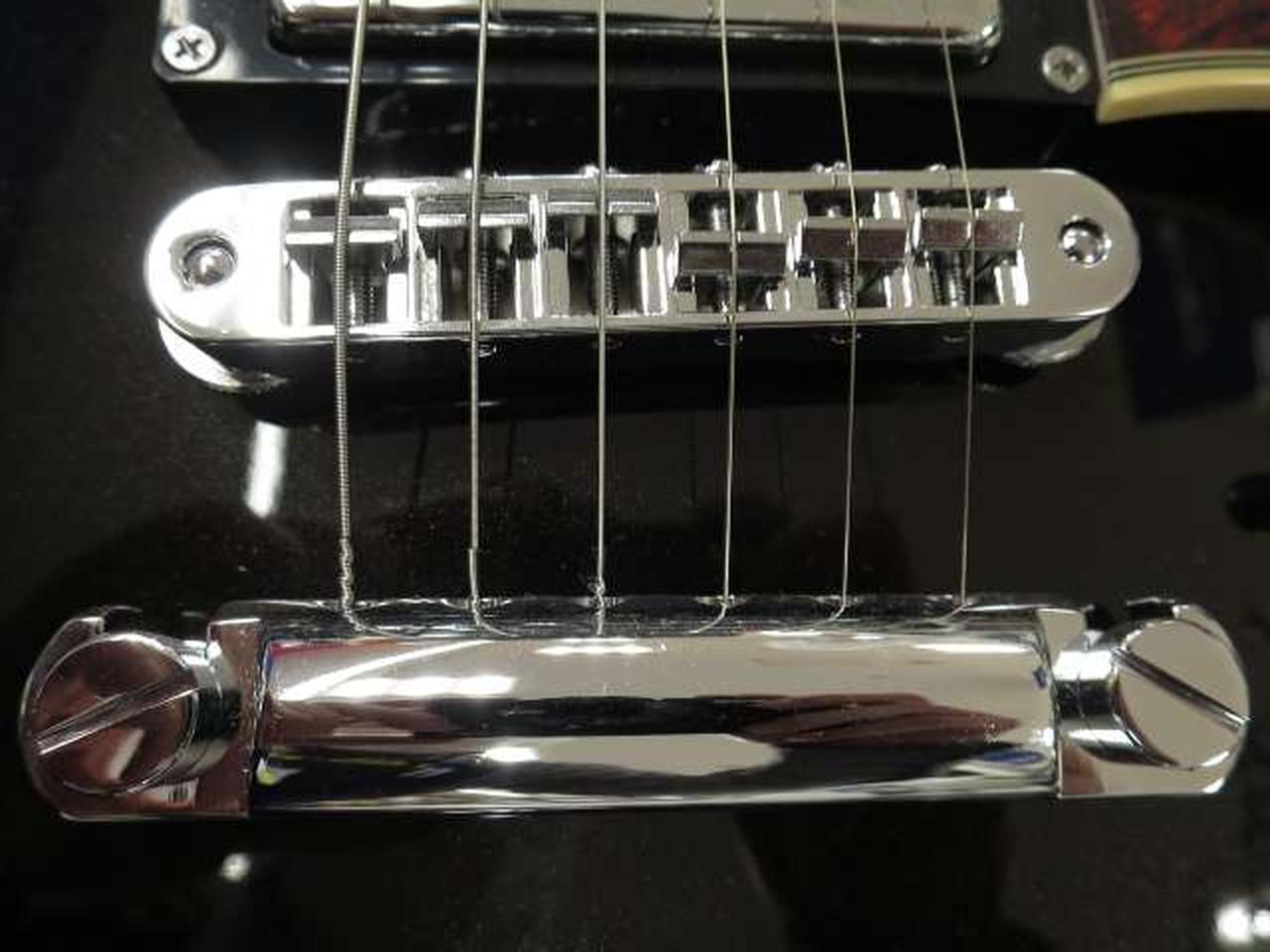 ディアンジェリコらしさを感じるオリジナル形状のピックガードは、5プライのトータス・シェル柄となっています |