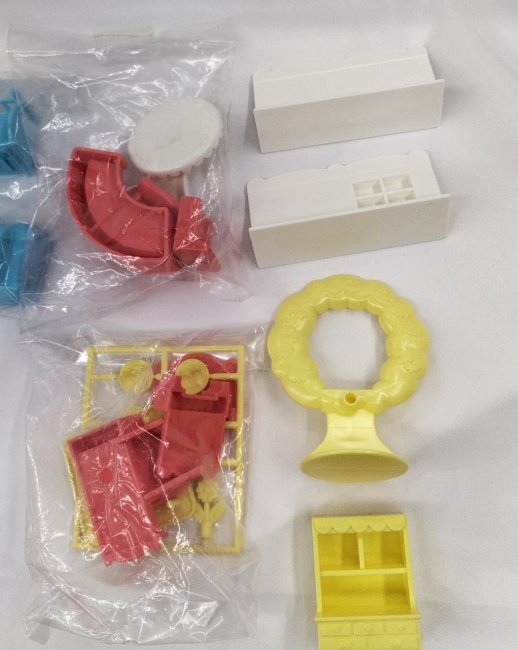 写真にあるものが全てです。もん、トイレのドア、ドレス2個、ベビーベッドのホロ、乳母車が欠品。重複パーツもあります。 |
