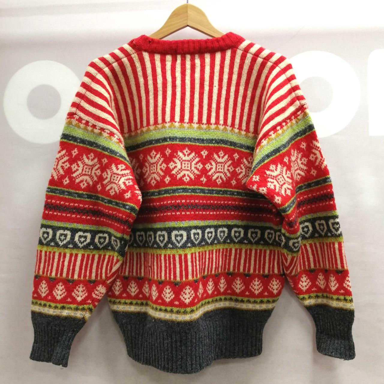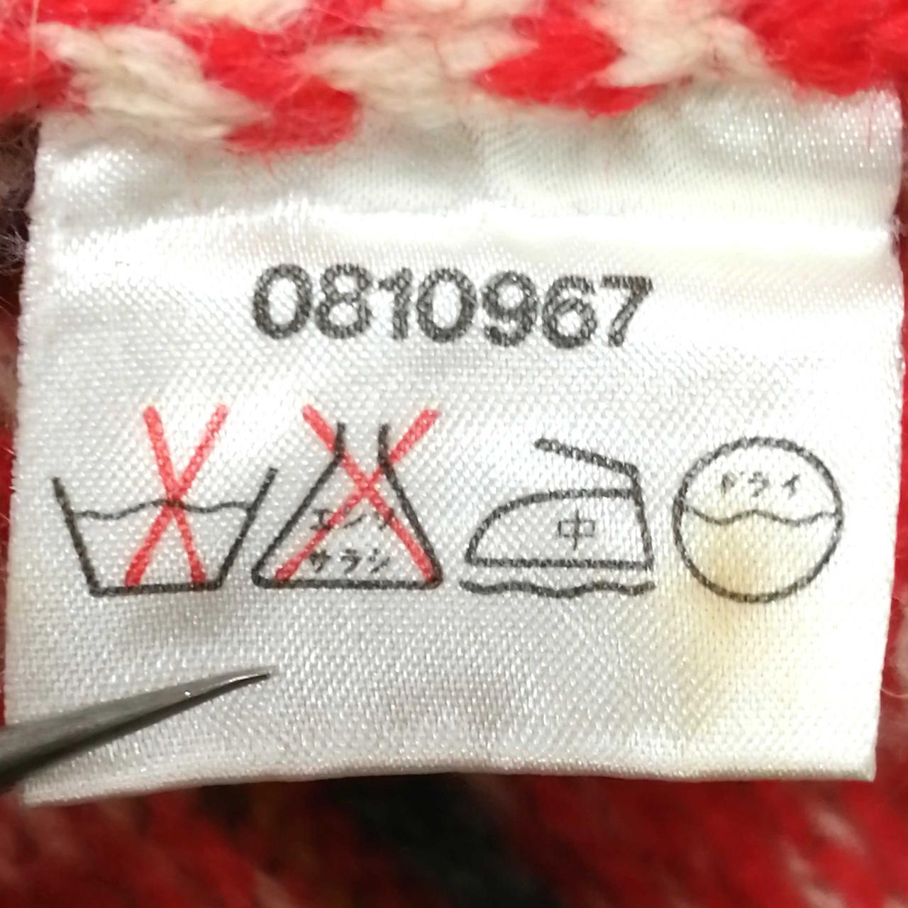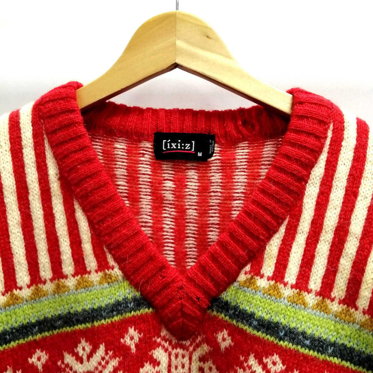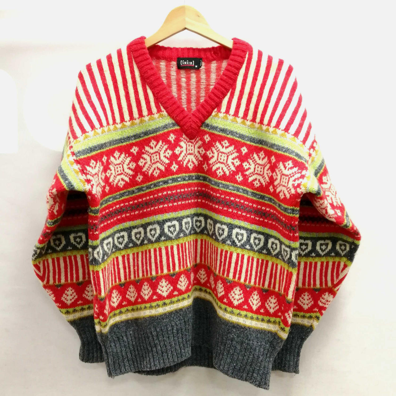 イクシーズのVネック総柄ニット・セーターです。肩部分を中心にシミがございます。首元・後ろ裾部分に穴がございます。 |