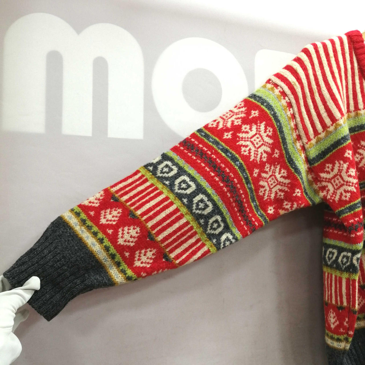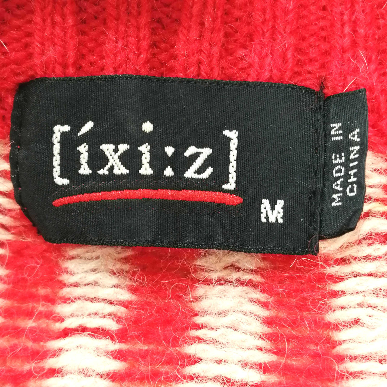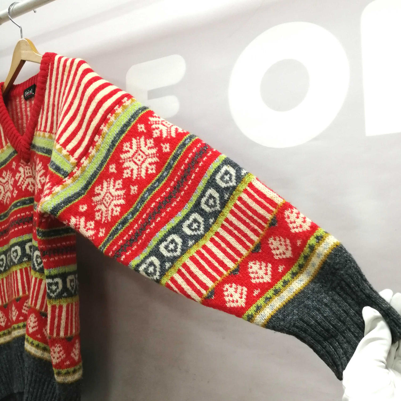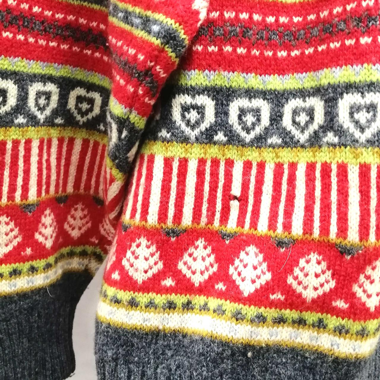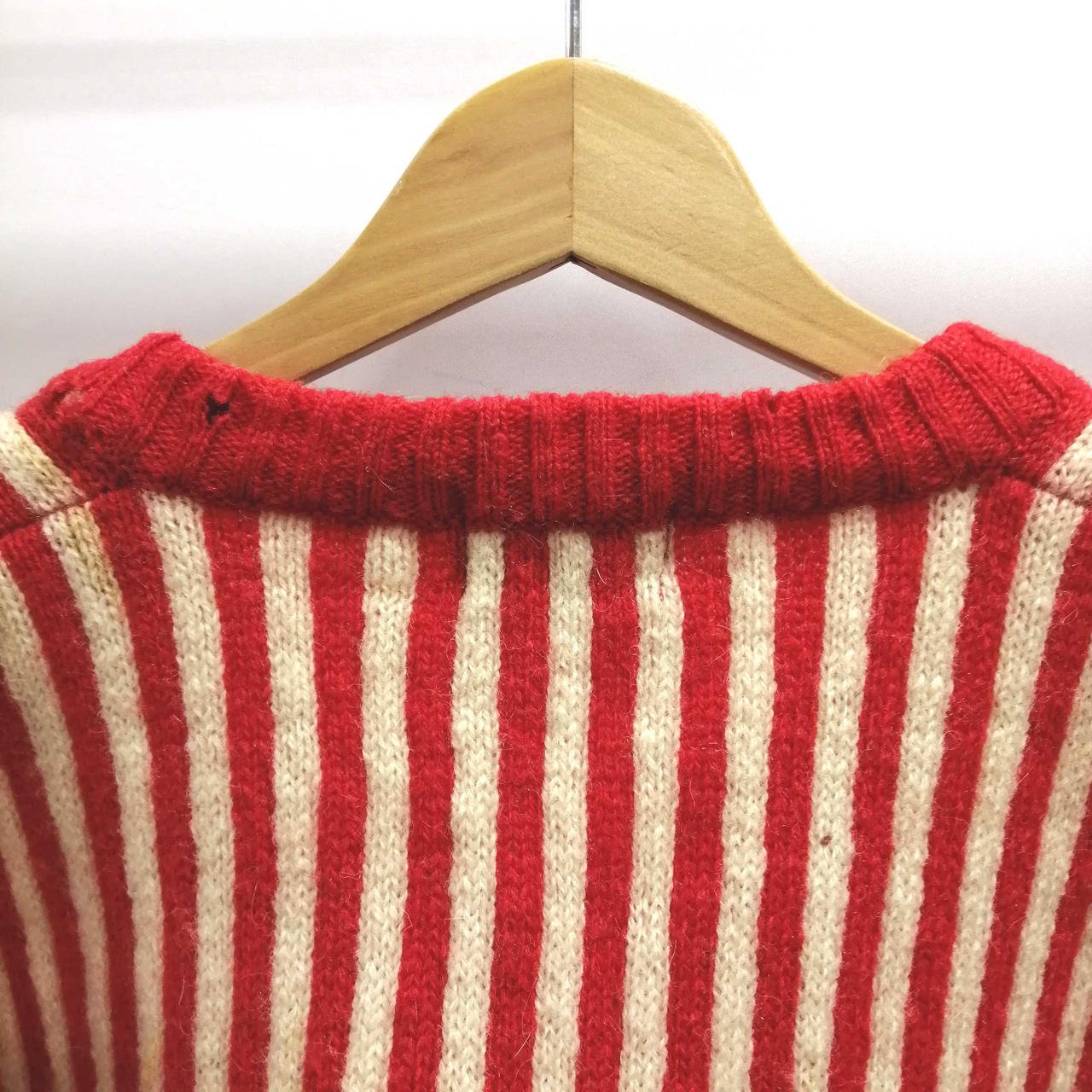 イクシーズのVネック総柄ニット・セーターです。肩部分を中心にシミがございます。首元・後ろ裾部分に穴がございます。 |