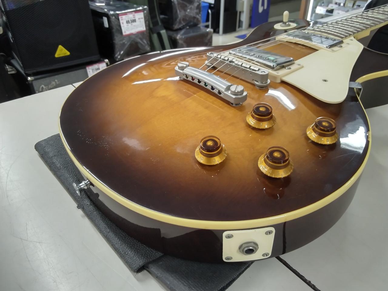 細かなディティールにも拘ったGibson公認のフジゲン製の国産レスポール”Orville”電装系に問題はないですが、ネックに波打ちが見られハイフレットで音詰まりがあります。ロッド締め切り間近、ジョイント以降で順反りが見られます。 |