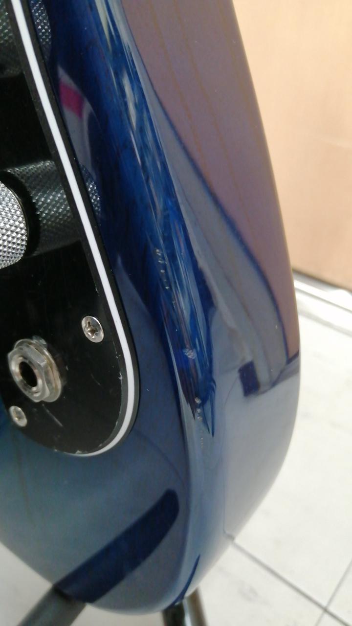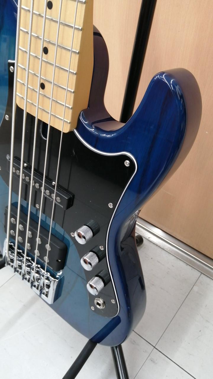 アッシュボディ、メイプル指板、シースルーブルーバーストカラーという組み合わせの美しい5弦ベース |