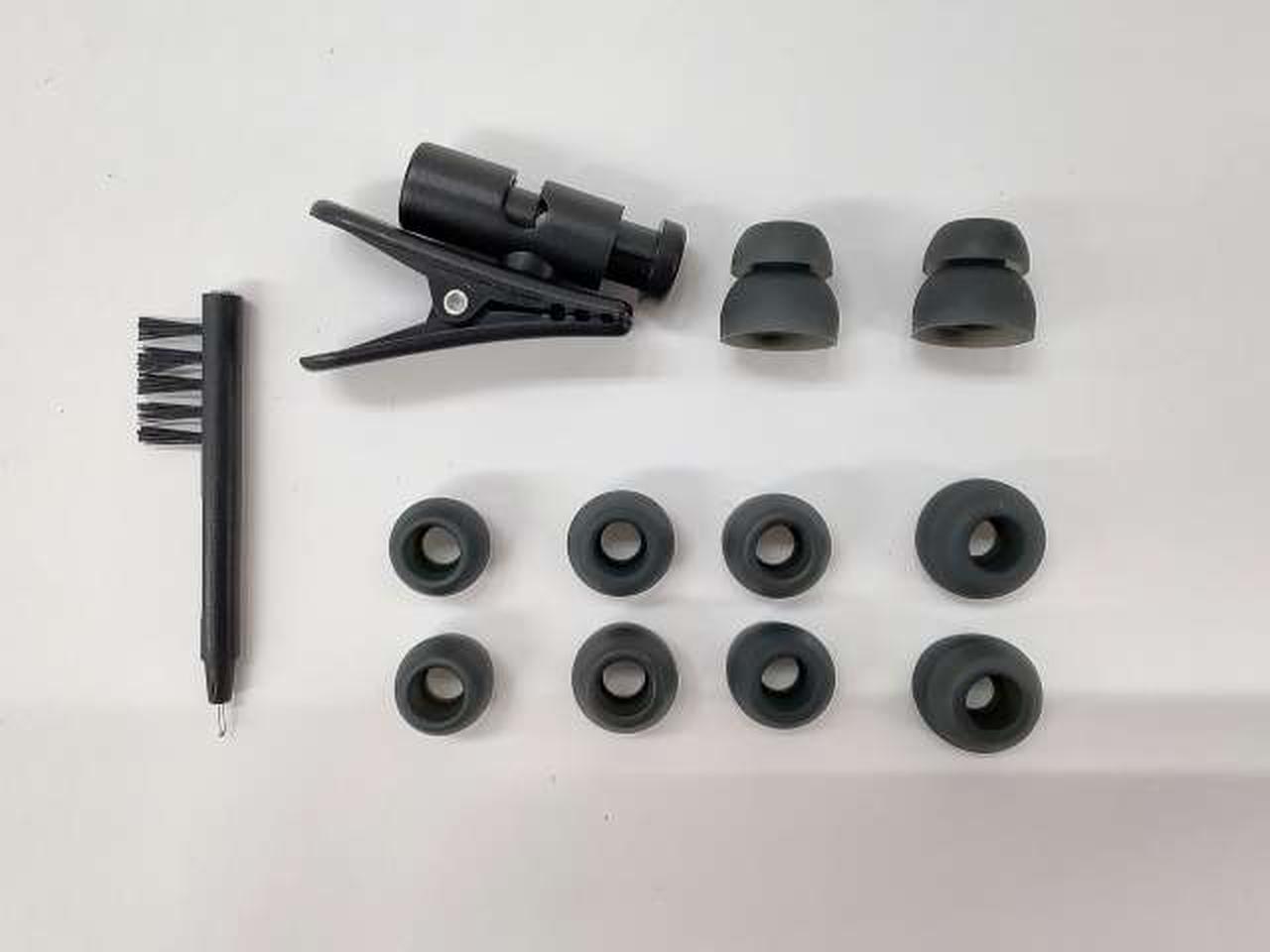 箱(開封痕あり)・シリコンイヤーチップ(5種)・コードクリップ・クリーニングツール・プロテクトケース |