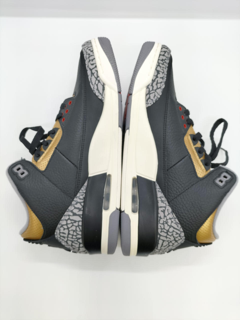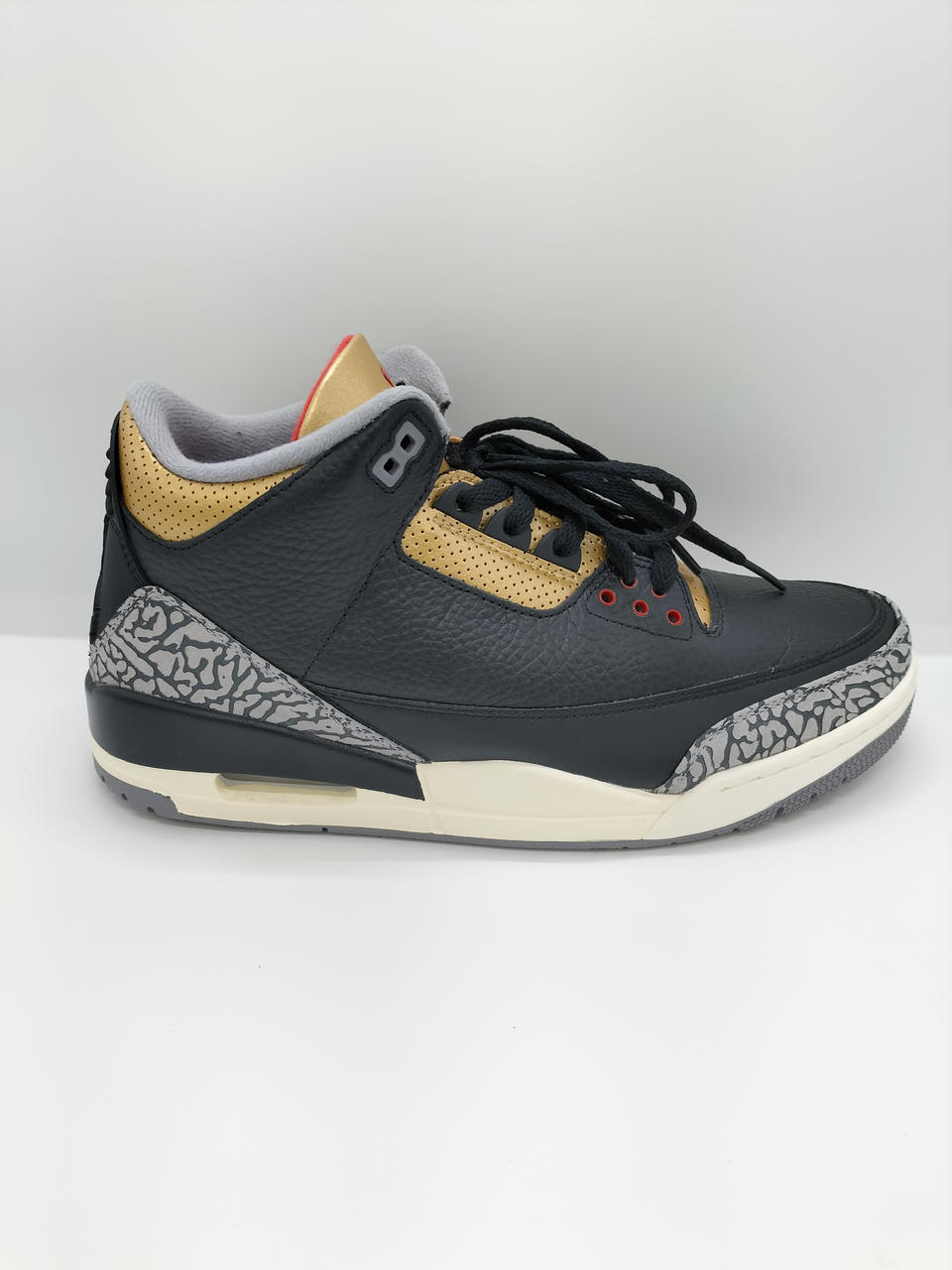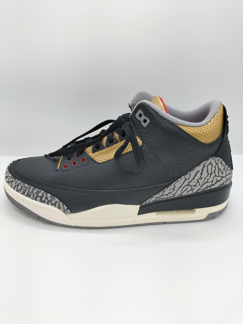 メインカラーのブラック、ゴールドにシューレスホールやタン、ジャンプマンロゴにアクセントカラーのレッドをアクセントとしつつも、ミッドソールのオフホワイトで重厚感を程よく和らげている一足です。