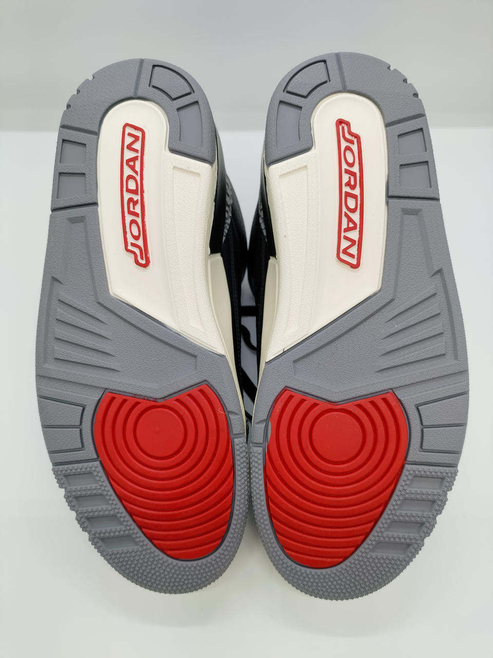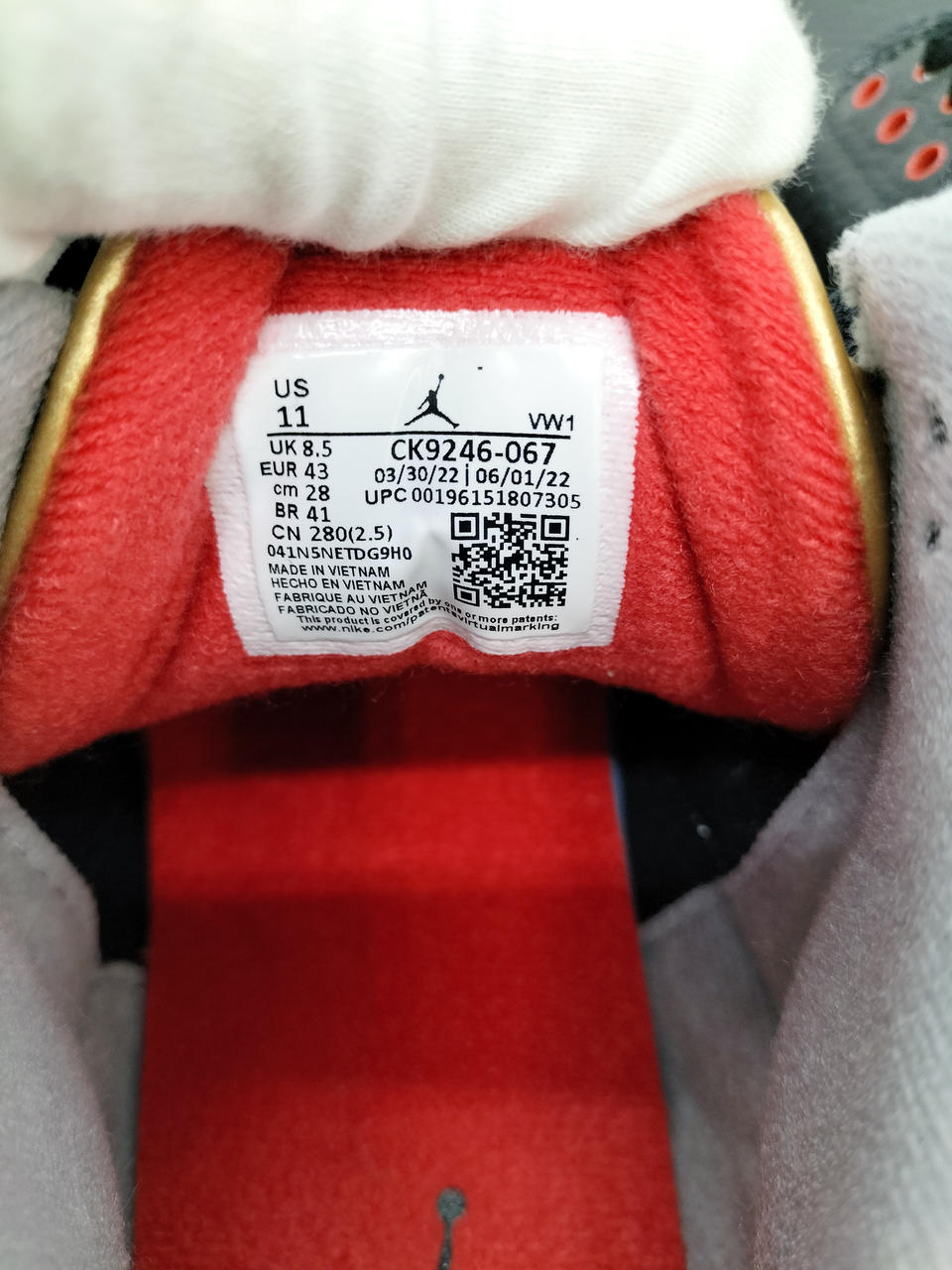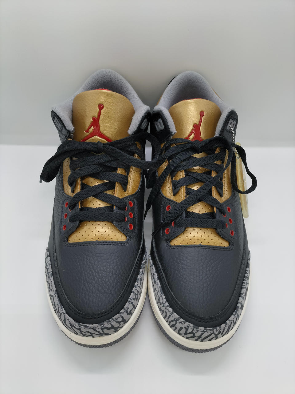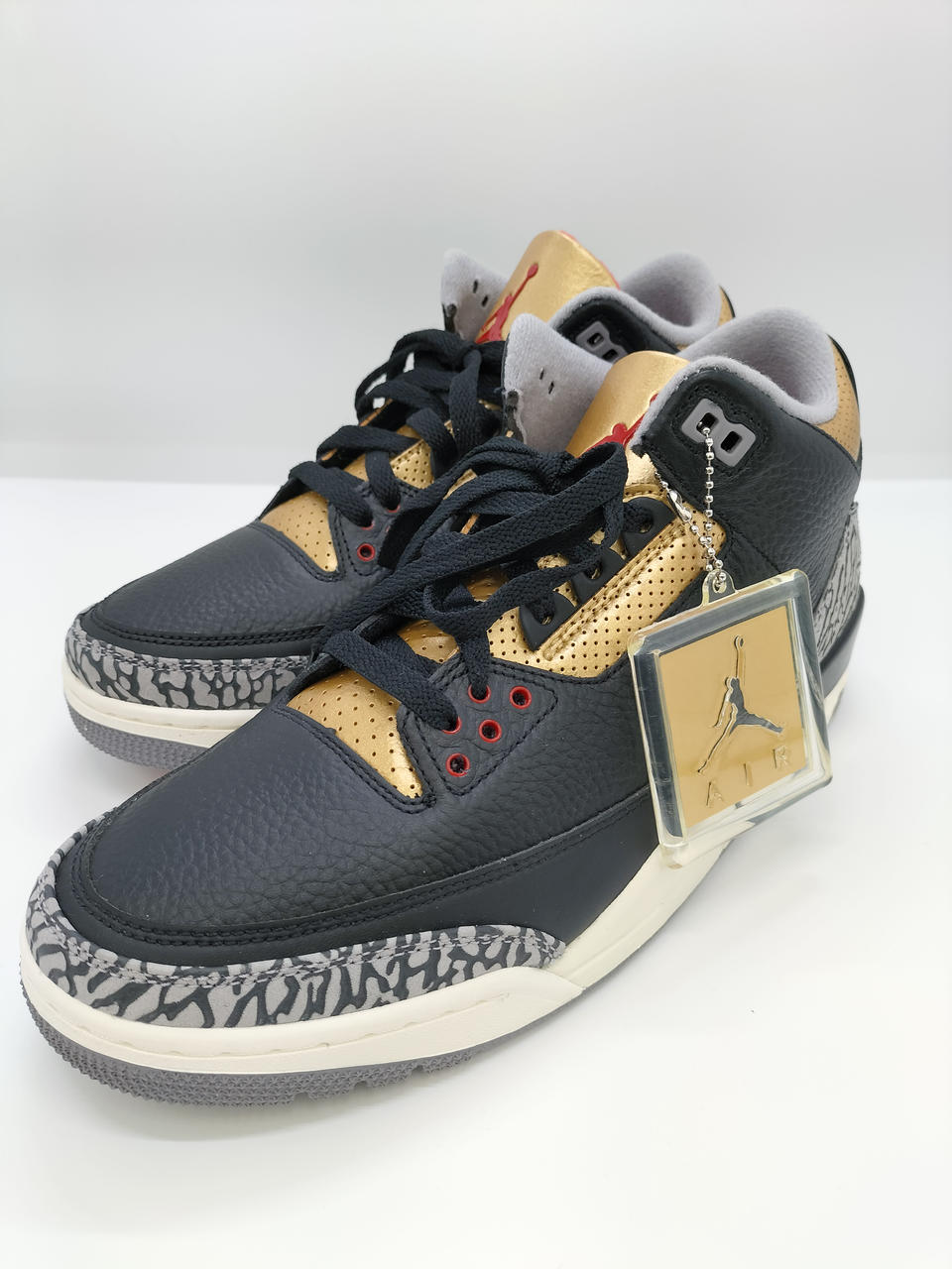 メインカラーのブラック、ゴールドにシューレスホールやタン、ジャンプマンロゴにアクセントカラーのレッドをアクセントとしつつも、ミッドソールのオフホワイトで重厚感を程よく和らげている一足です。