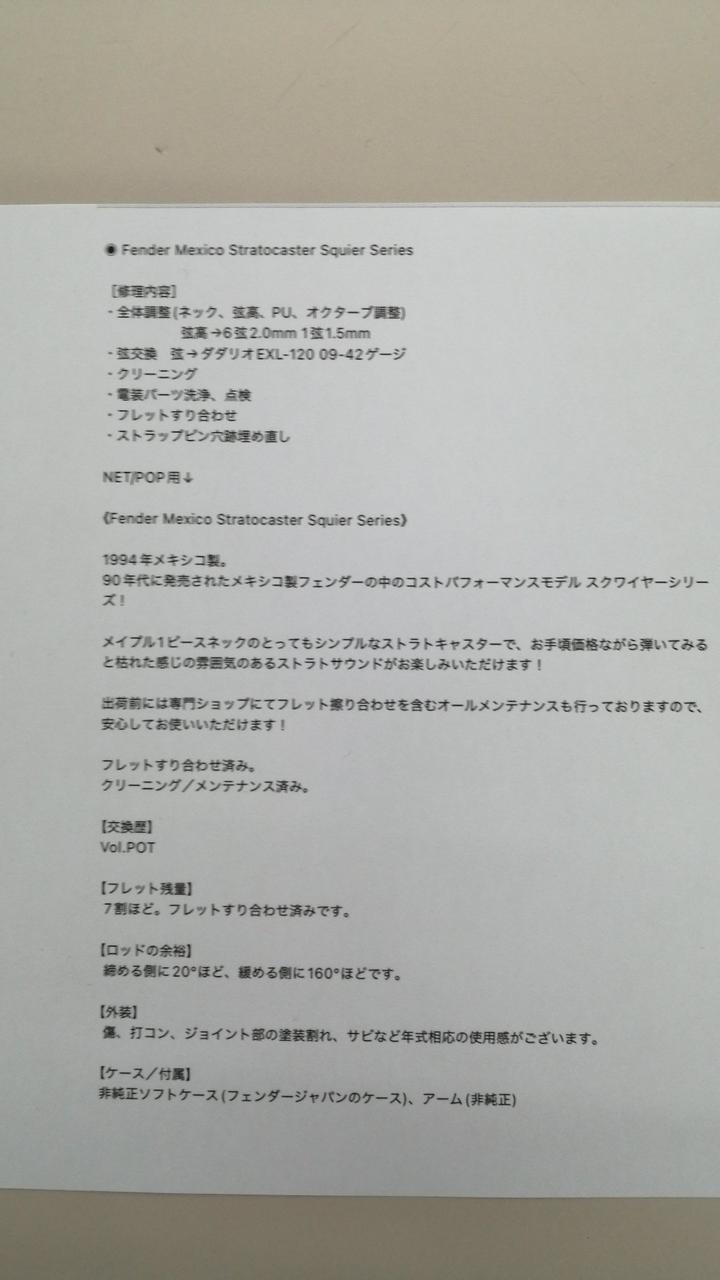フレット: 7割ほど。フレットすり合わせ済み ロッド: 締める側に20°ほど、緩める側に160°ほど |