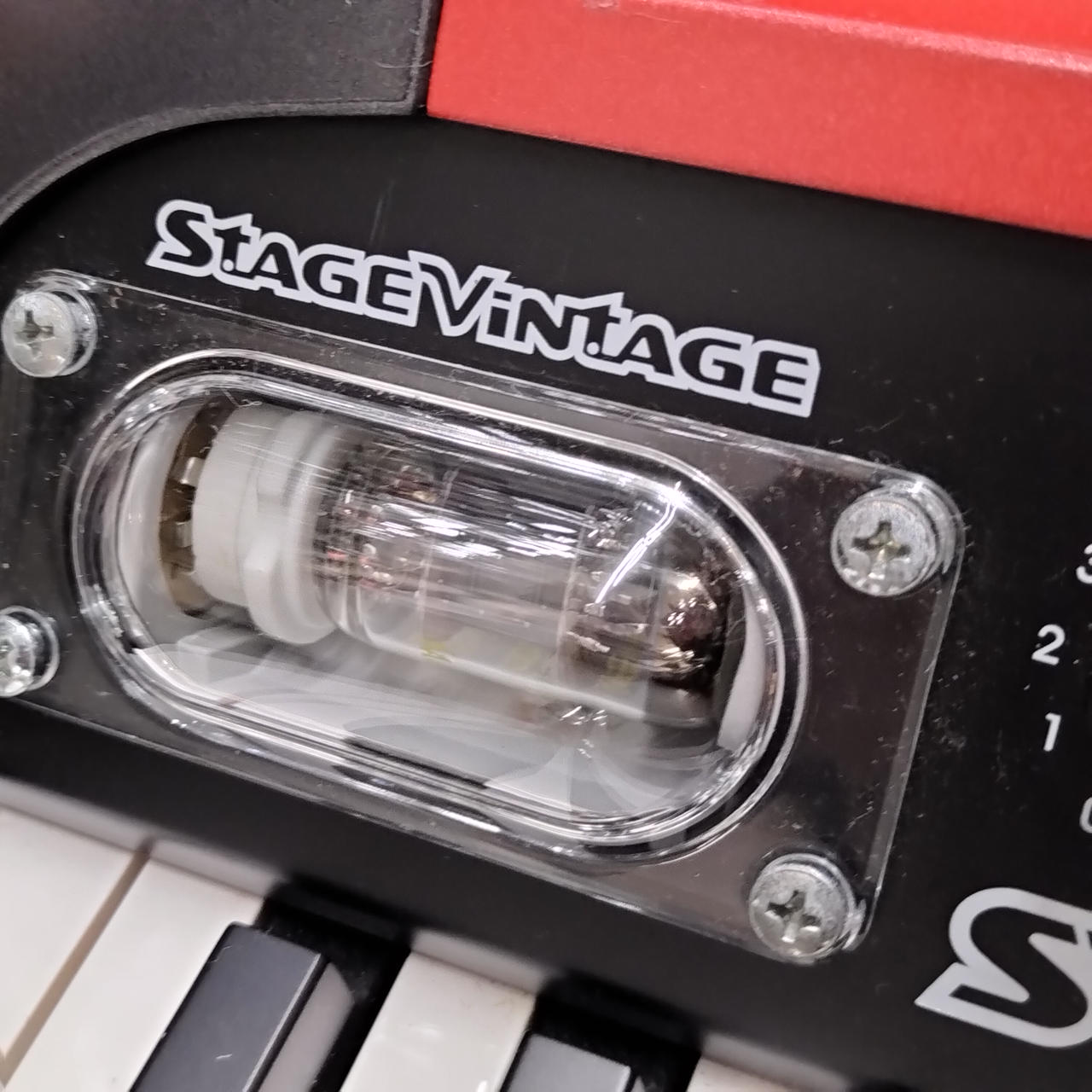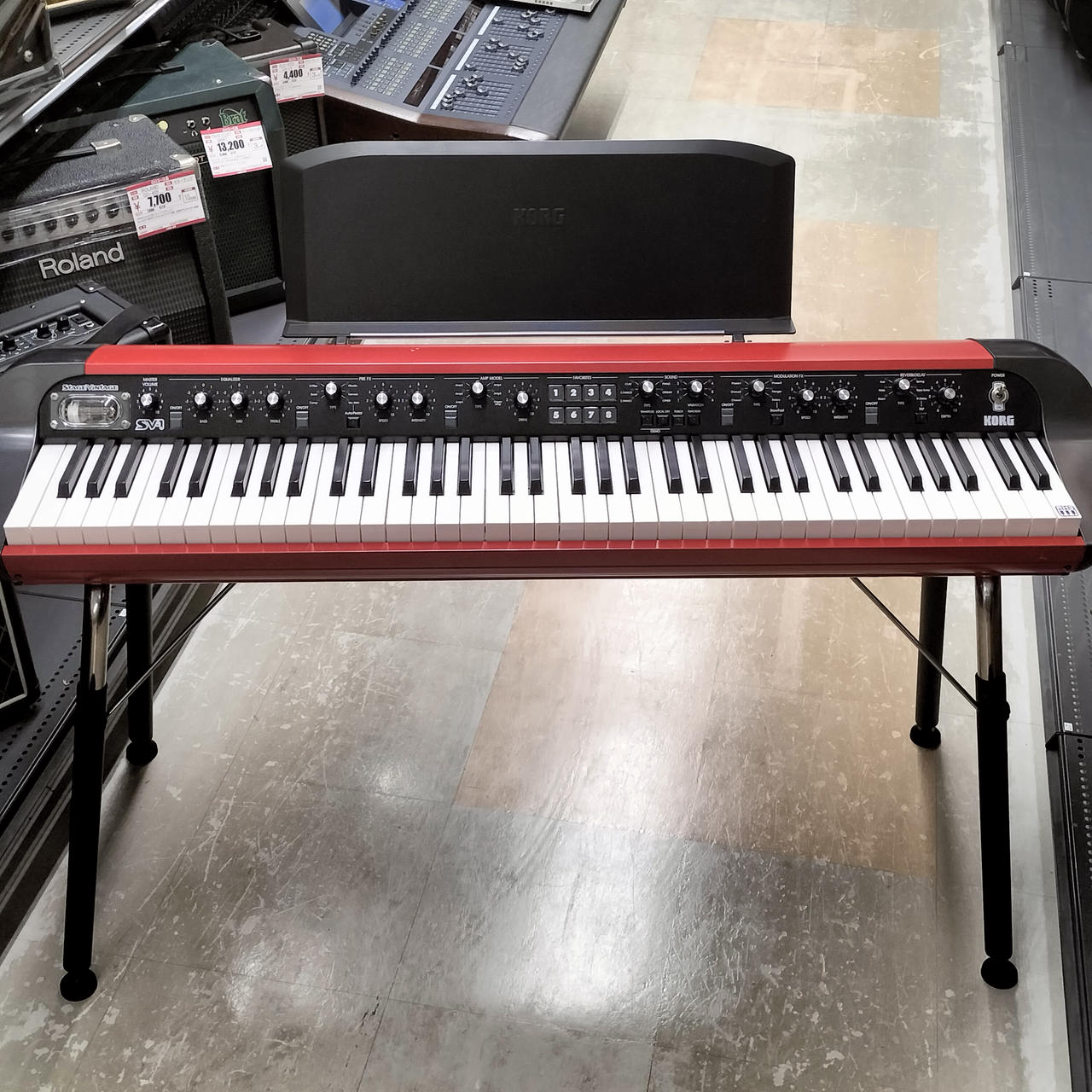 ステージ映えする独特のフォルム。レッドボディは限定モデルです。 |