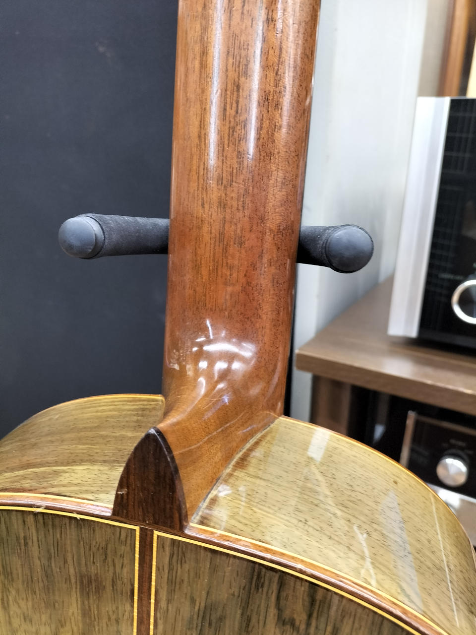 側&裏板に塗装の白濁や小キズなどはところどころに見られますが、大きく目立つような割れなどはなくネックコンディションも良好です。 |