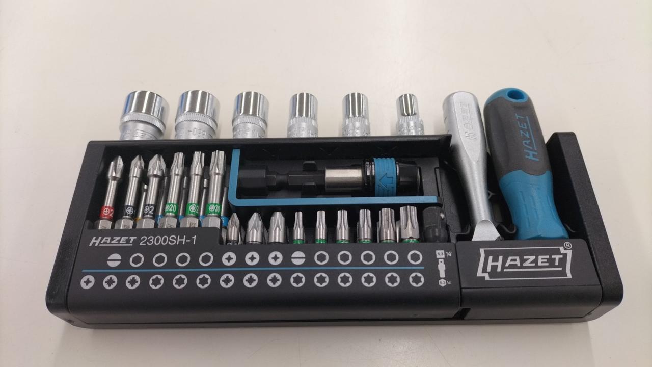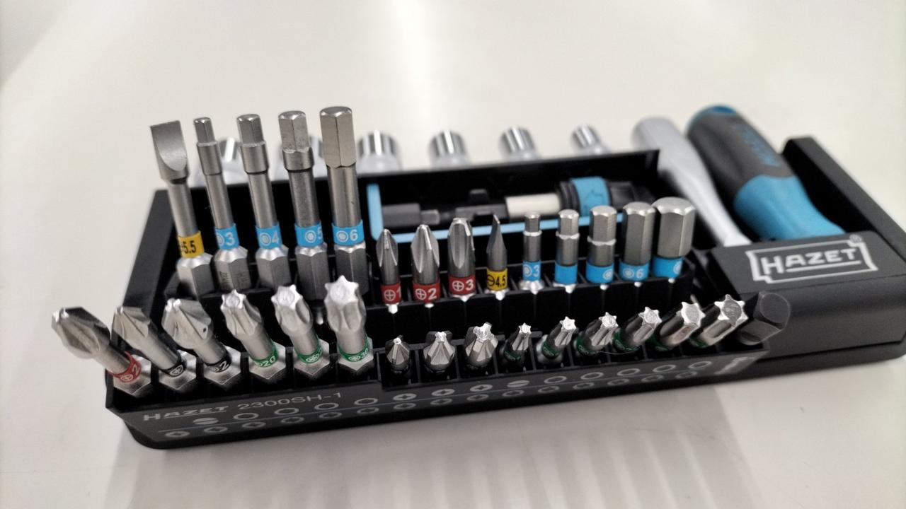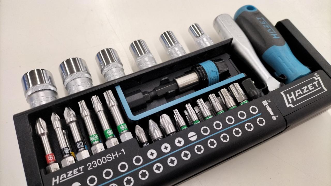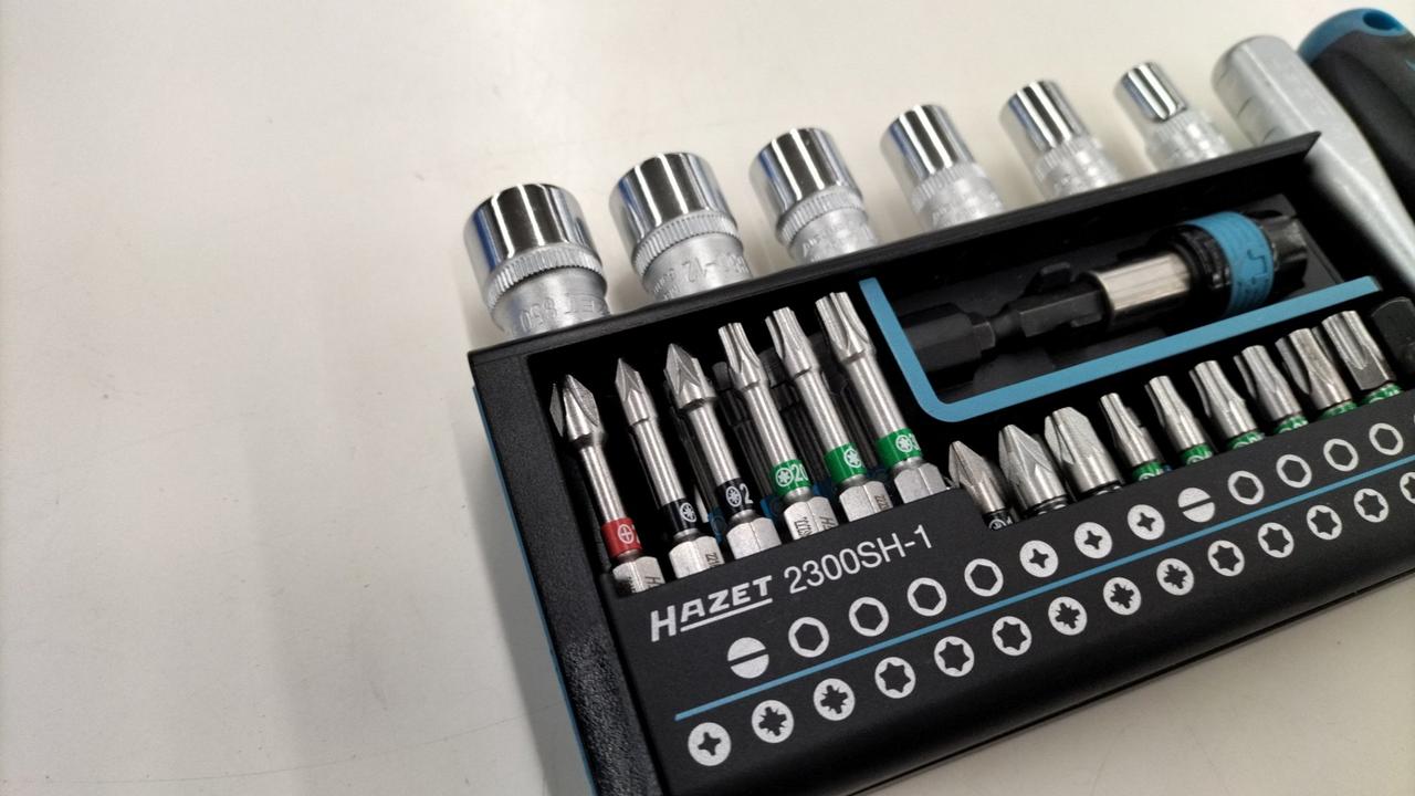 18個の25mmビット、11個の50mmビット、ビットアダプター、6個のソケットを収納。様々なネジ頭形状に対応 |