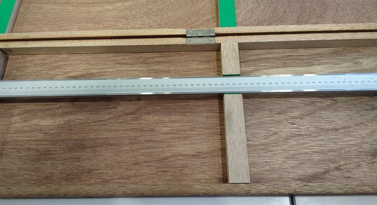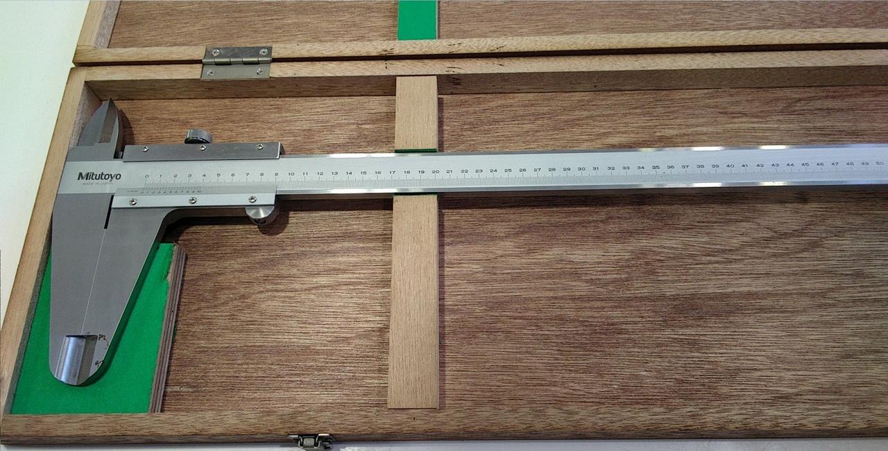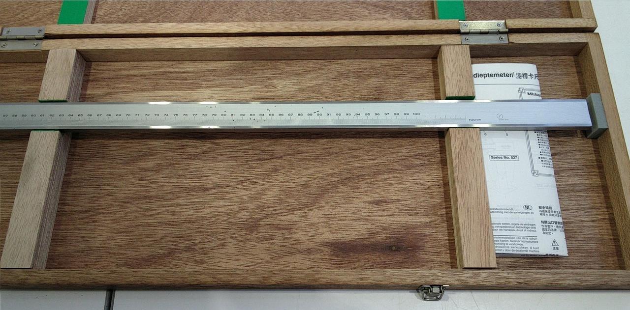 スライダの上部目盛で内側寸法、下部目盛で外側寸法を直読できます。 |
