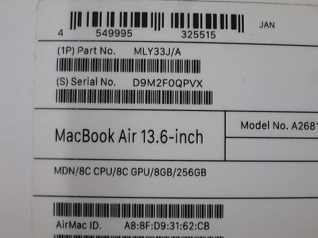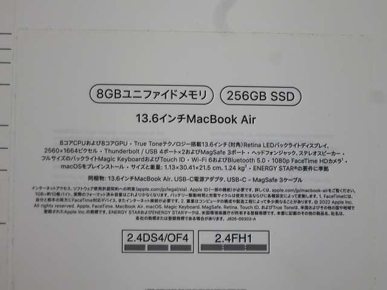 22年発表のM2搭載 MacBook Air 13.6インチ(2560*1664) メモリ:8GB M.2SSD:256GB AX(Wi-Fi6)対応 その他のスペックはメーカーサイトをご確認ください |