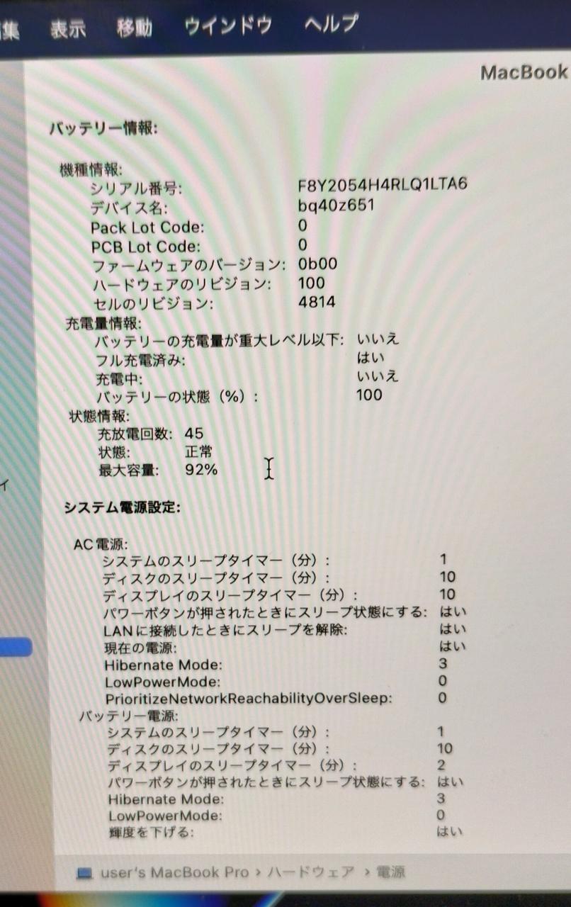 バッテリー充放電45回、最大容量92% |