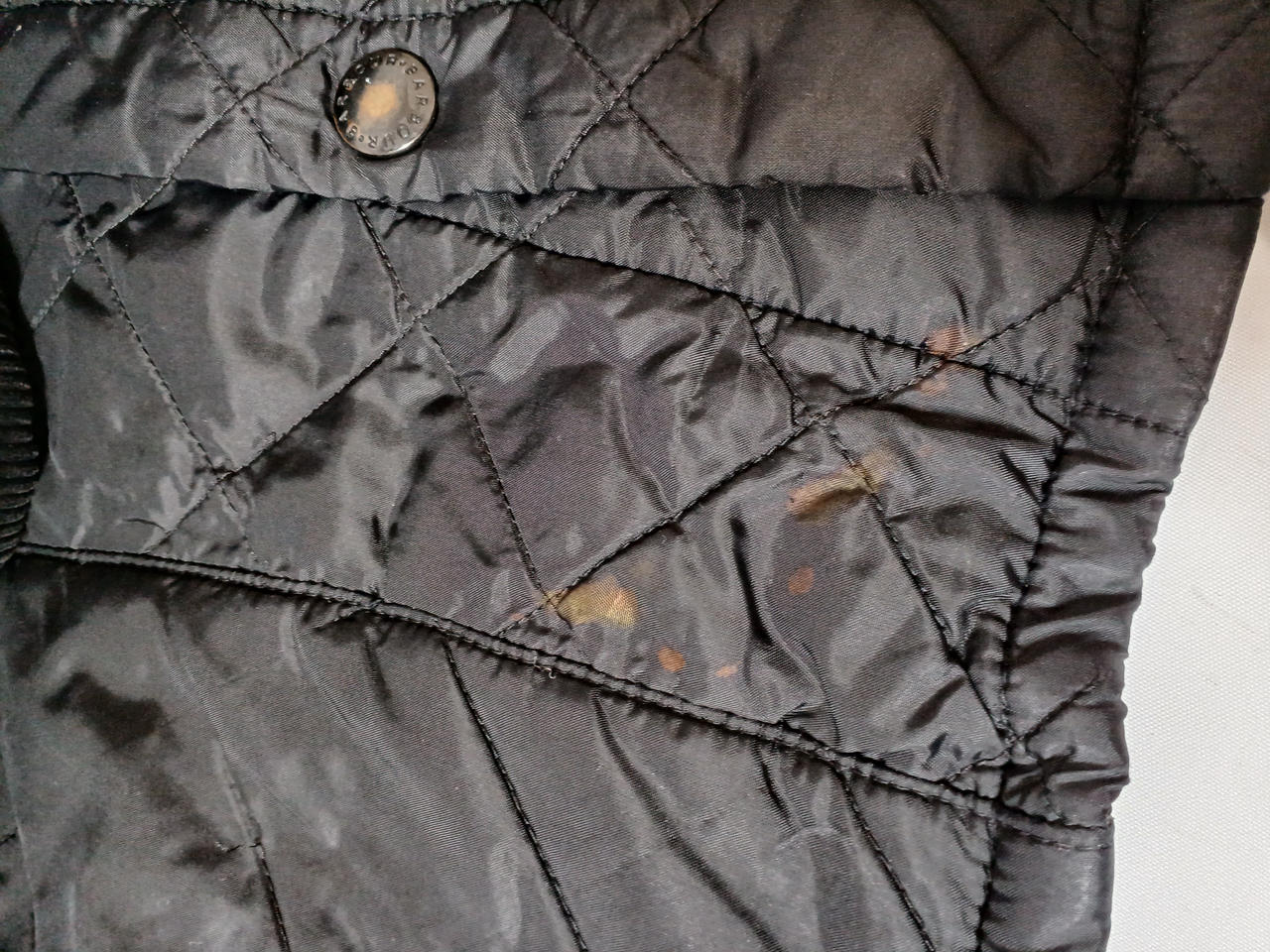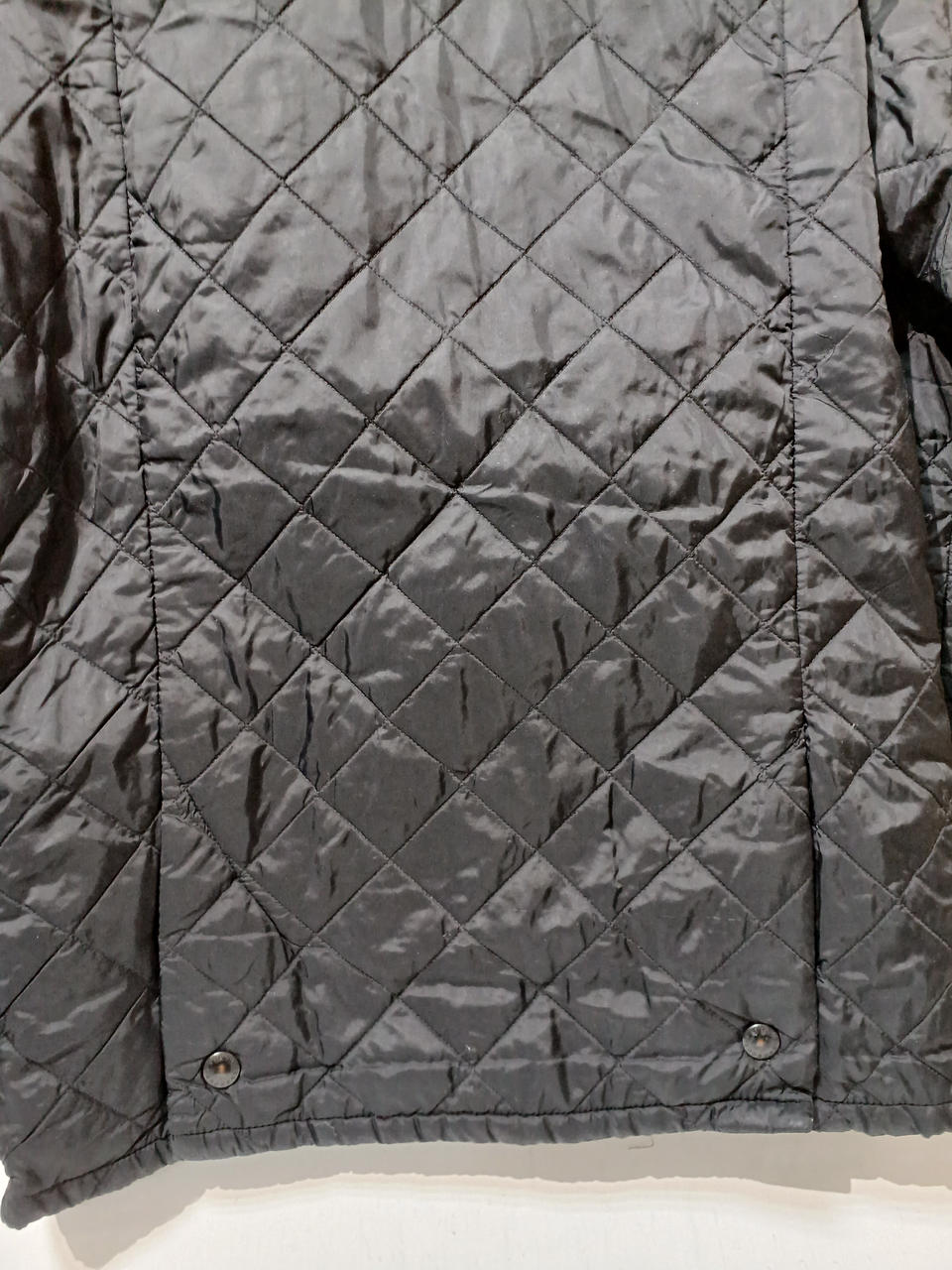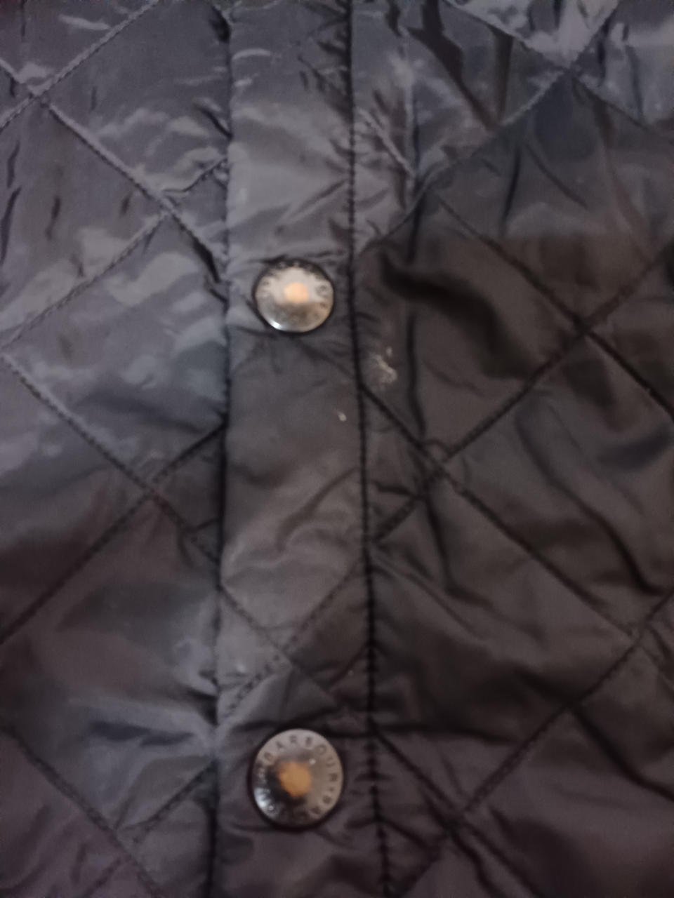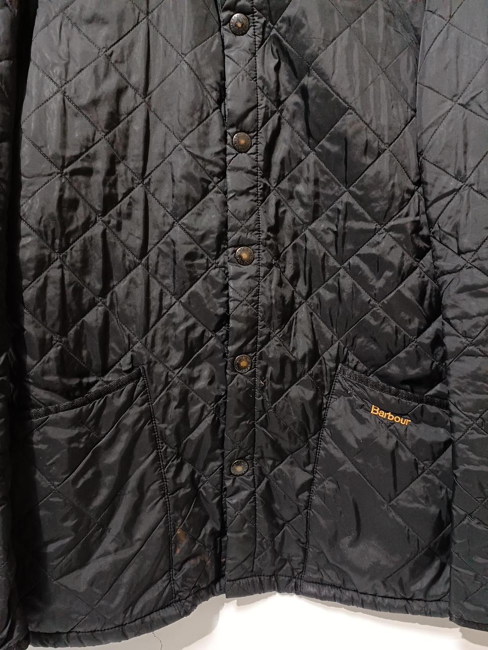 下から2個目のスナップが壊れてしまって閉まりません。スナップに色あせや裾部分に若干のシミ汚れございます。 |